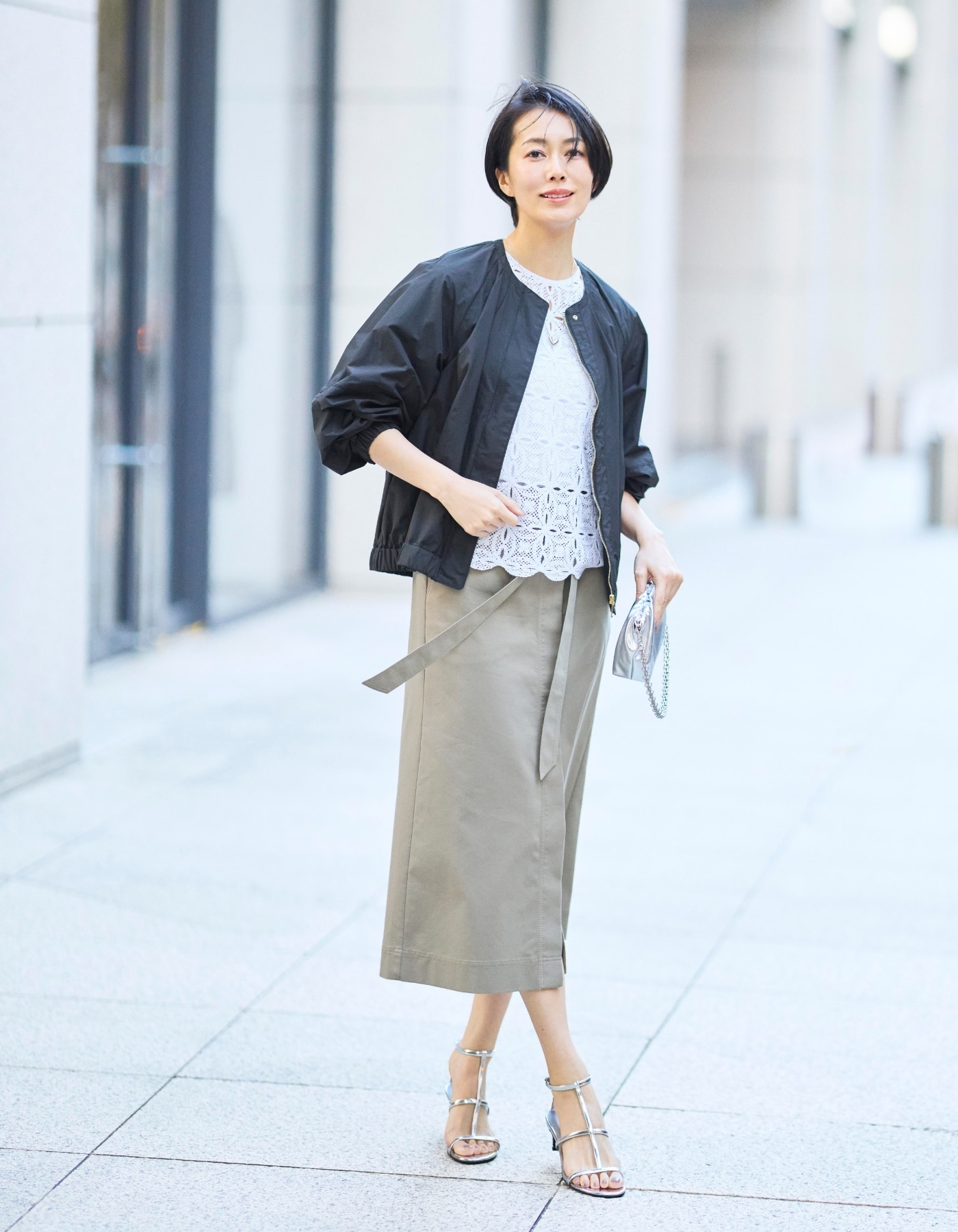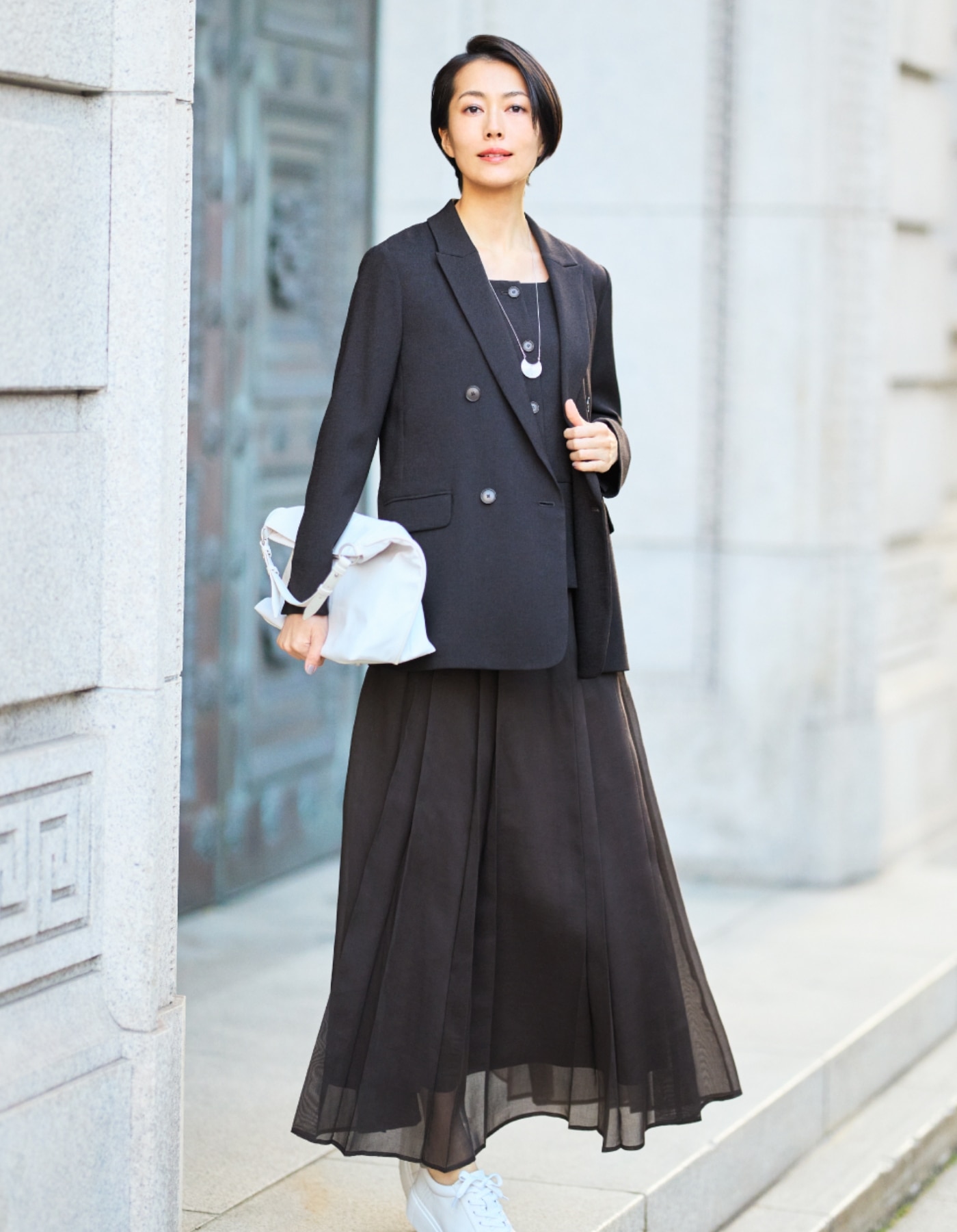 シアーなスカートはジャケットスタイルの抜け感作りにも効果的です。
