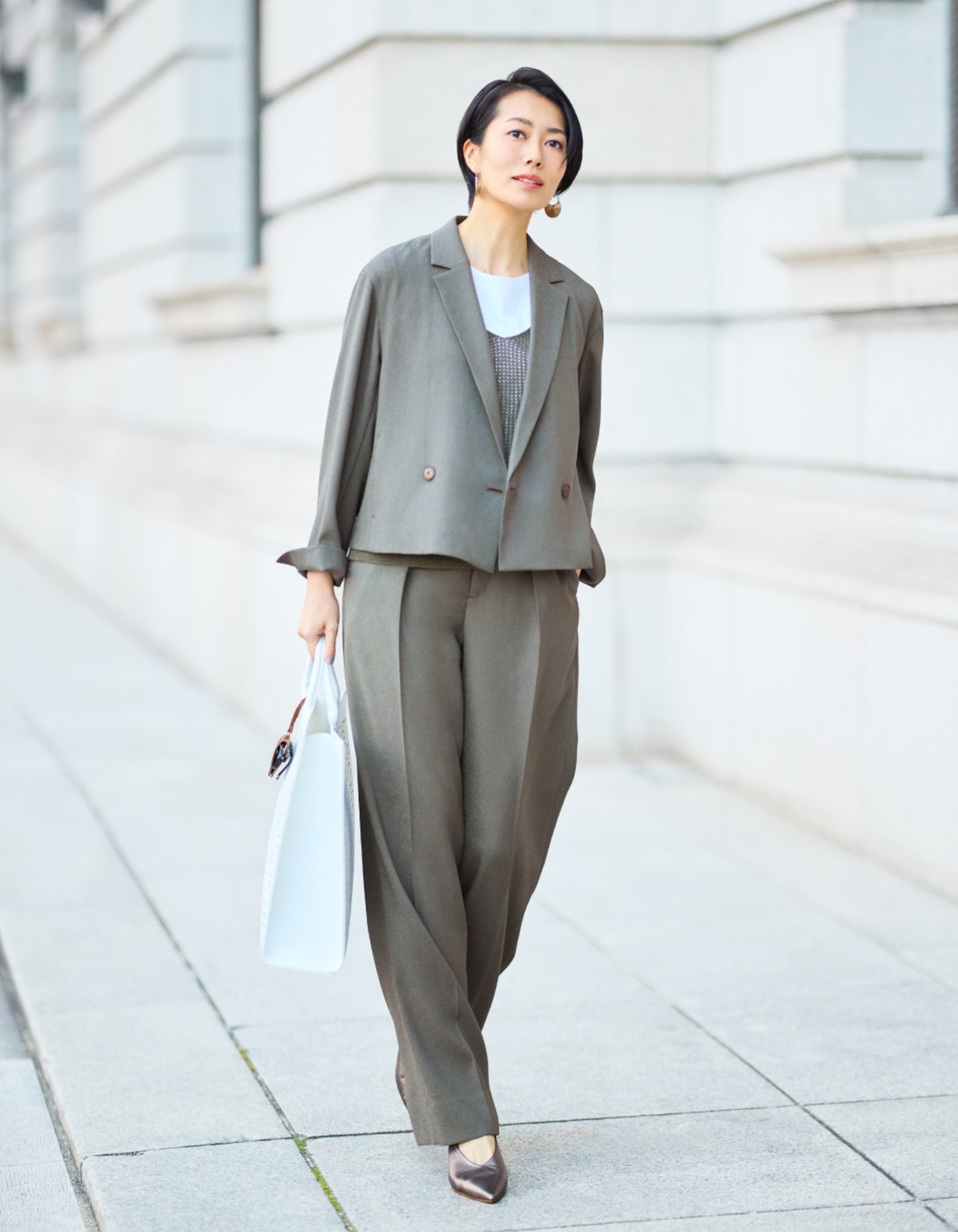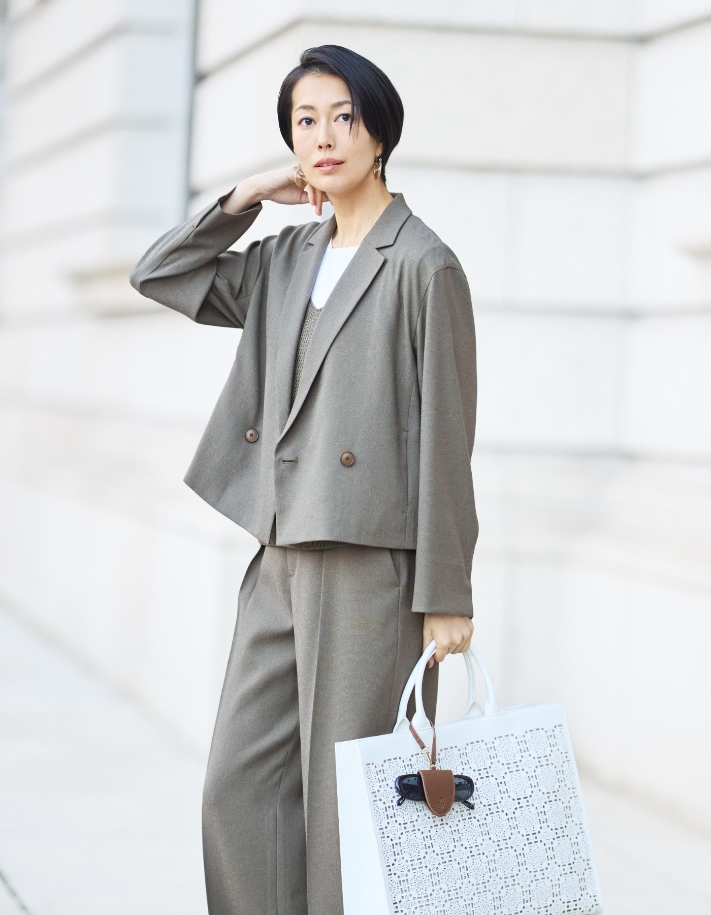 トレンドのクロップ丈のジャケットとワイドパンツのコンビネーションでワーキングスタイルも今年らしい表情に。