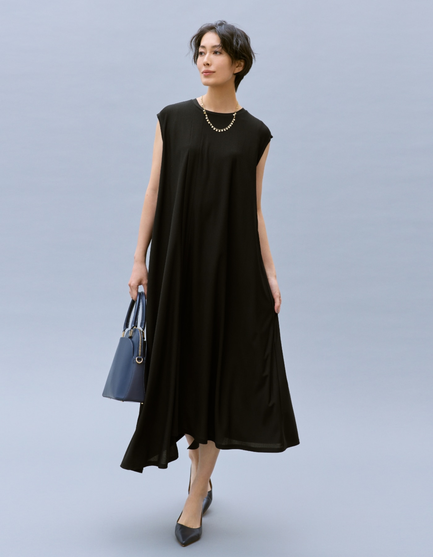 ドロップした肩周りなど細部に今年らしさを盛り込みながらもウエストはゴム入りでコンフォート。アンダードレス付き。
