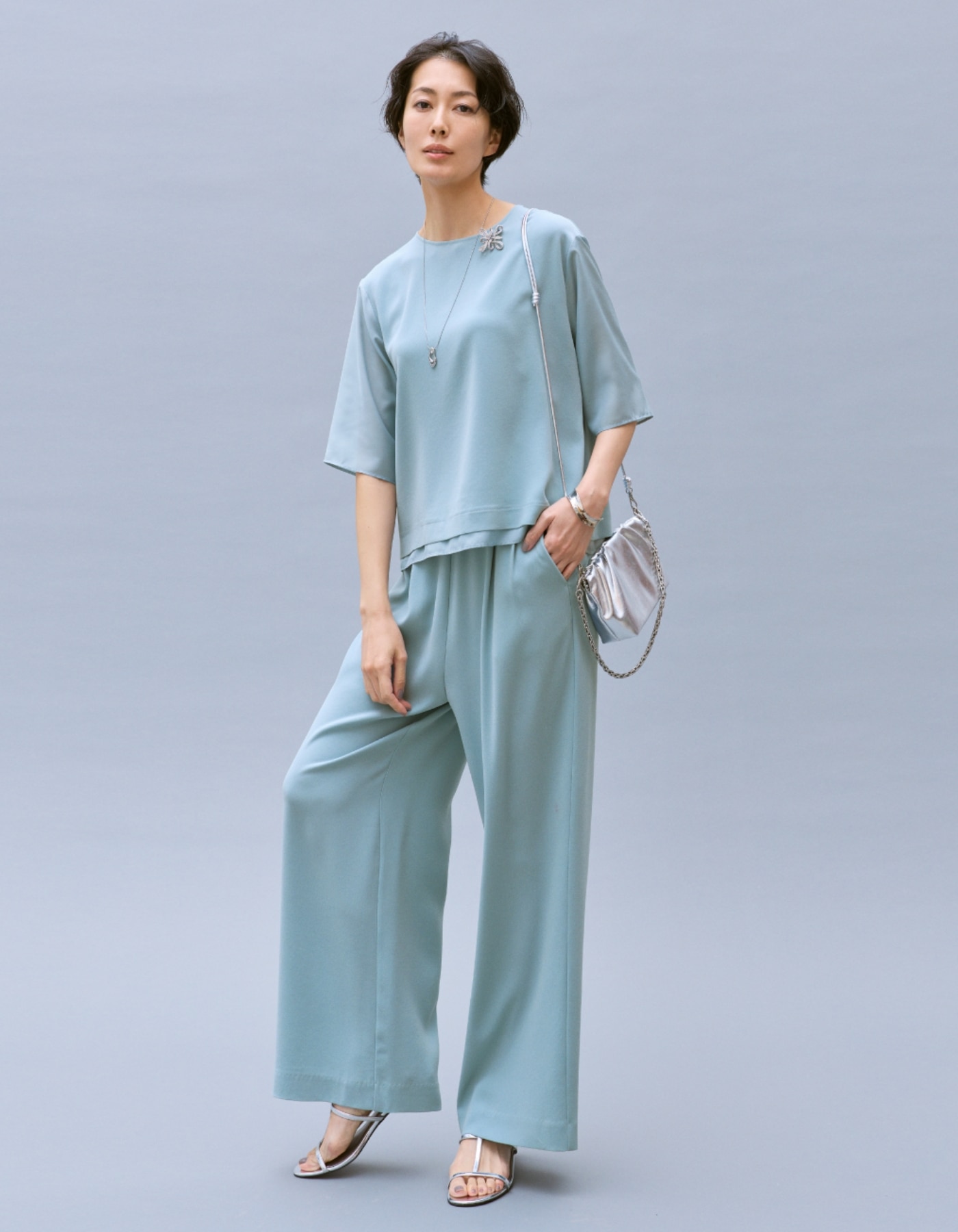 今季の旬カラーでもあるややくすみのあるパステル。晴れやかなシーンには、トレンド性もあり落ち着き感のあるサックスブルーのセットアップもぴったり。