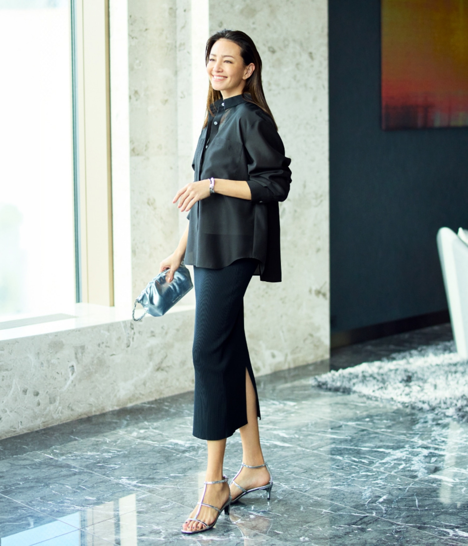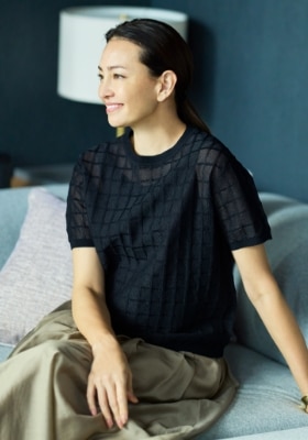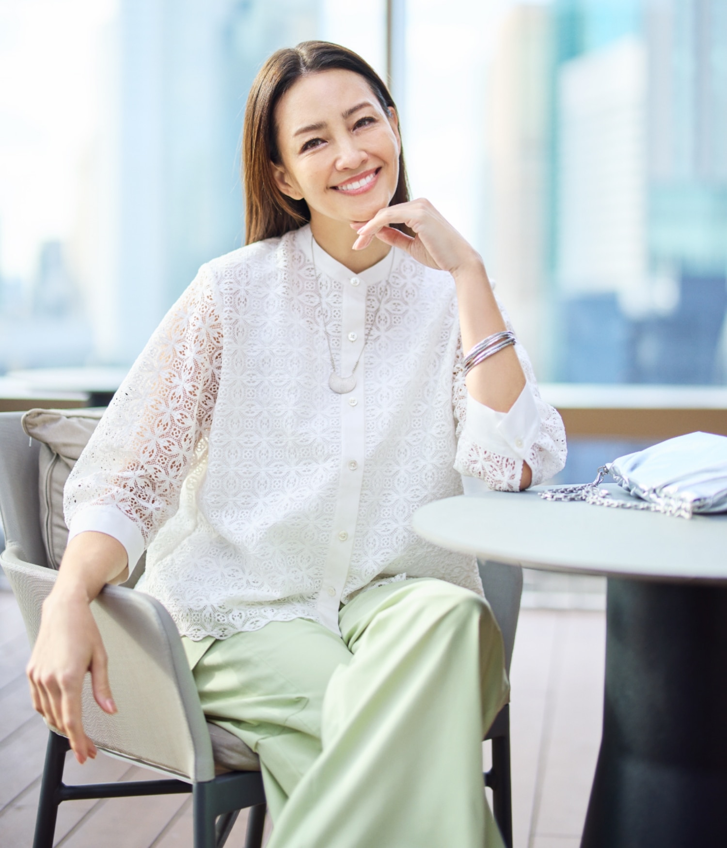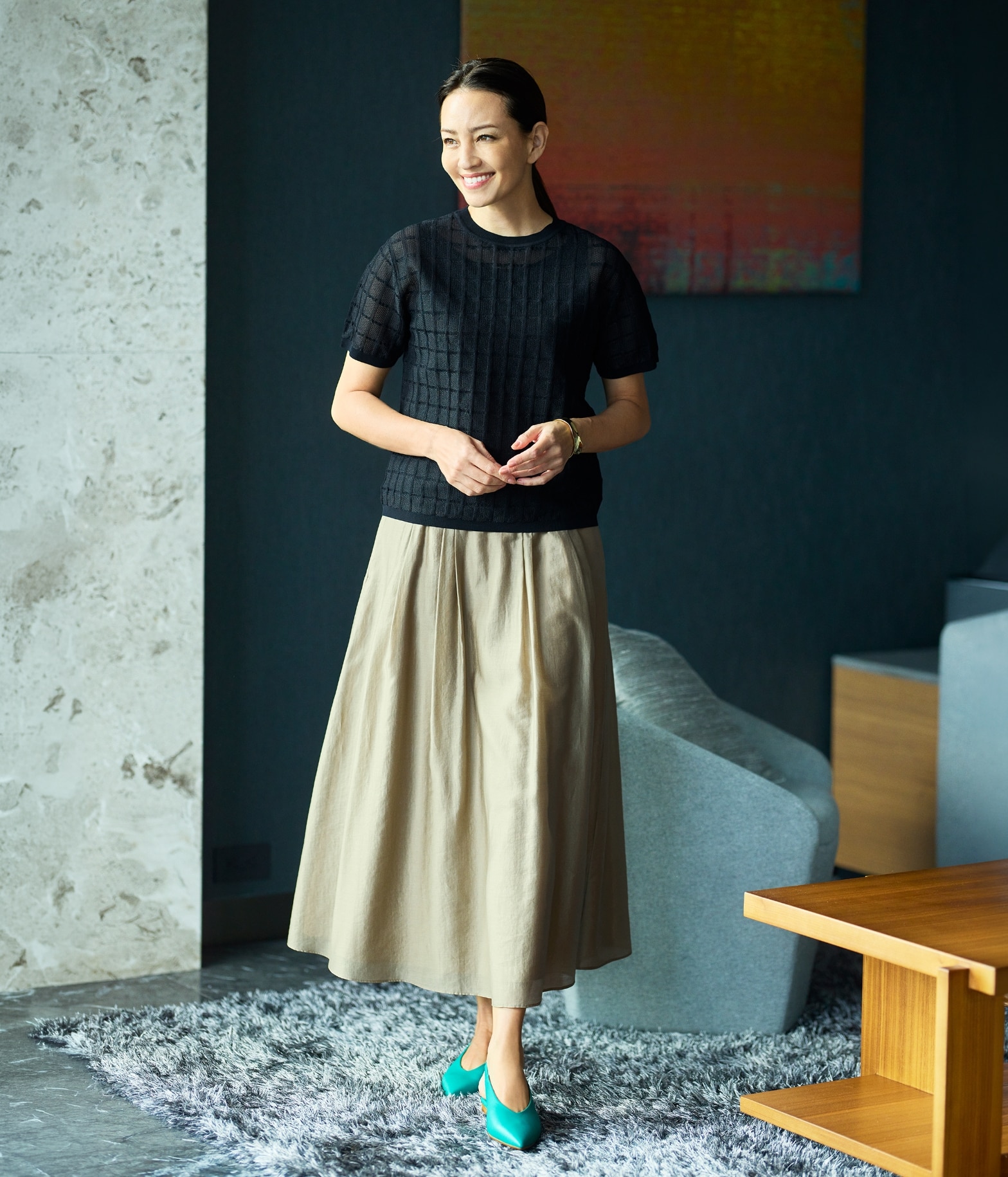 トップスには張り感とシアー感のある素材を選び、旬顔に。インナーは盛夏にうれしい機能性素材。