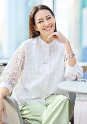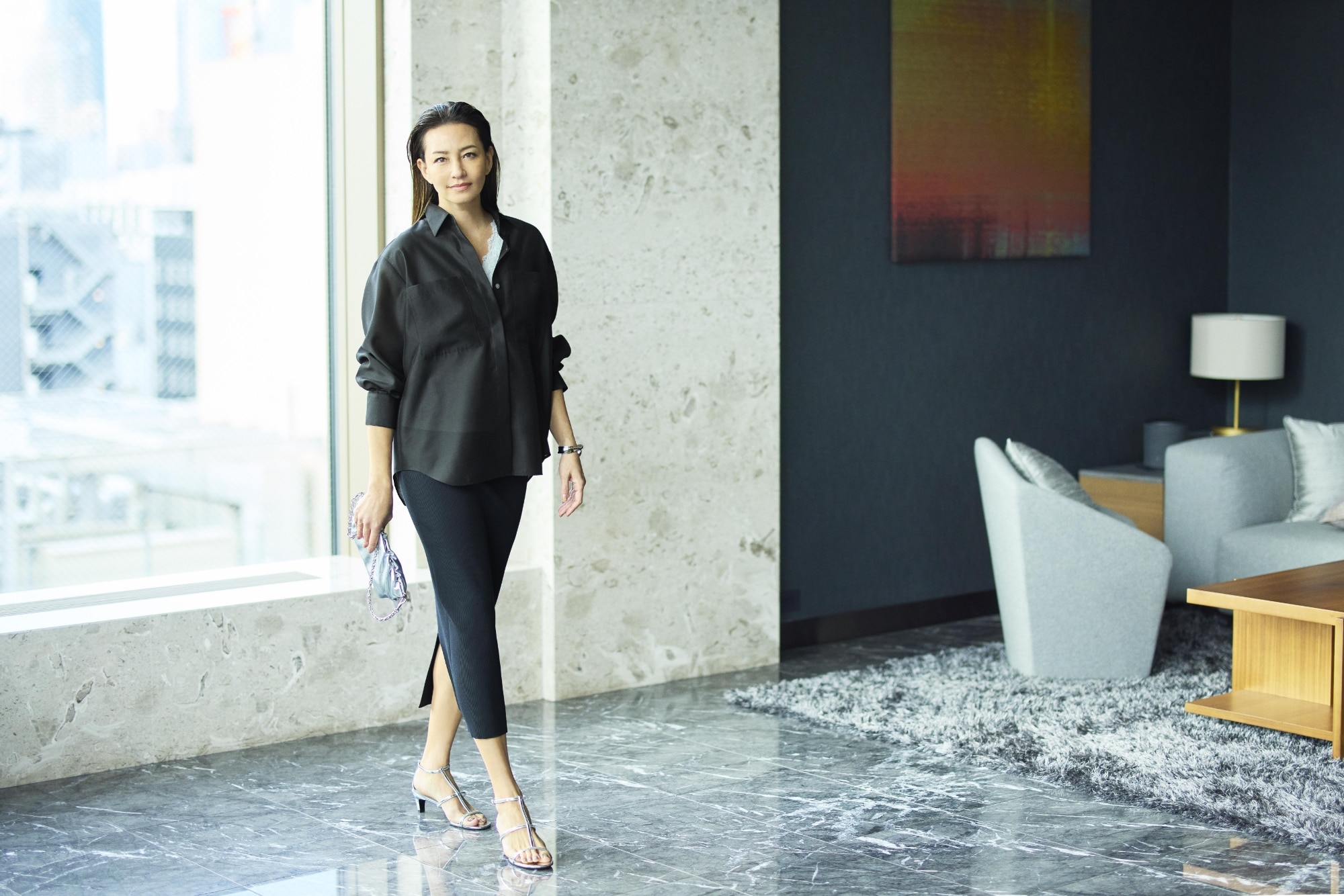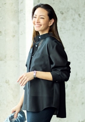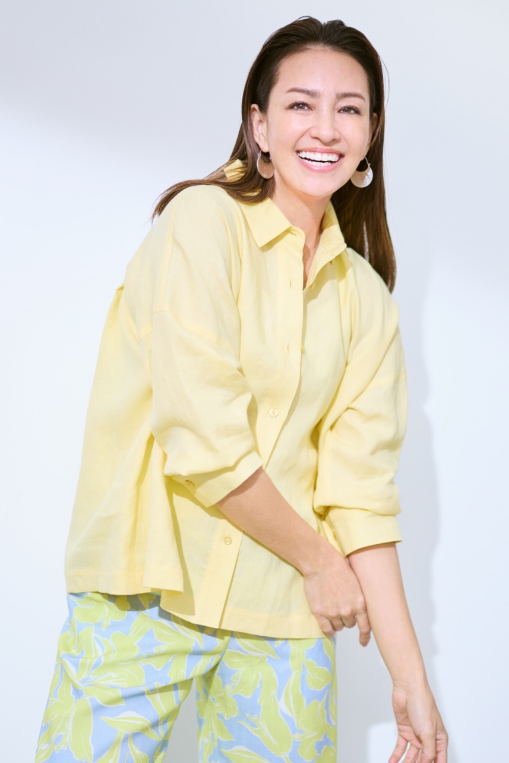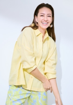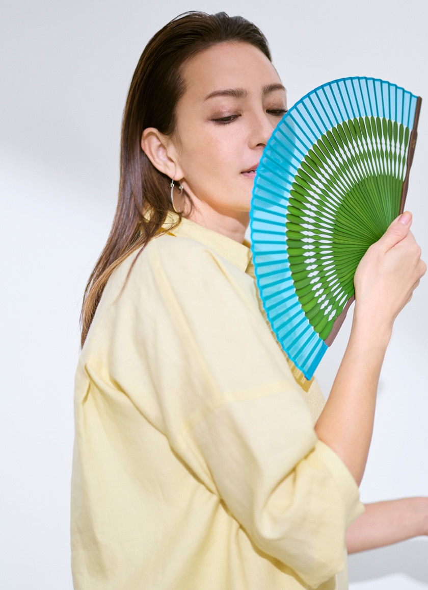 トップスには張り感とシアー感のある素材を選び、旬顔に。インナーは盛夏にうれしい機能性素材。