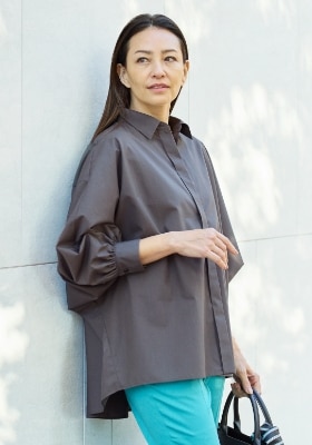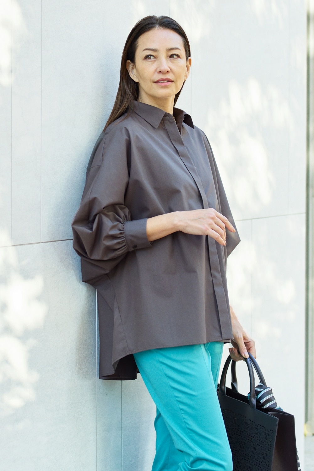 定番のシャツもこの春はデザインや素材にこだわった1枚を選んで装いを新しく。上品な光沢感と張りのある高密度の生地でお作りしたシャツは、ボリュームのある袖と身頃のフレアシルエットで一枚でもサマになるデザインに。抜き衿でリラックスした着こなしもおすすめです。