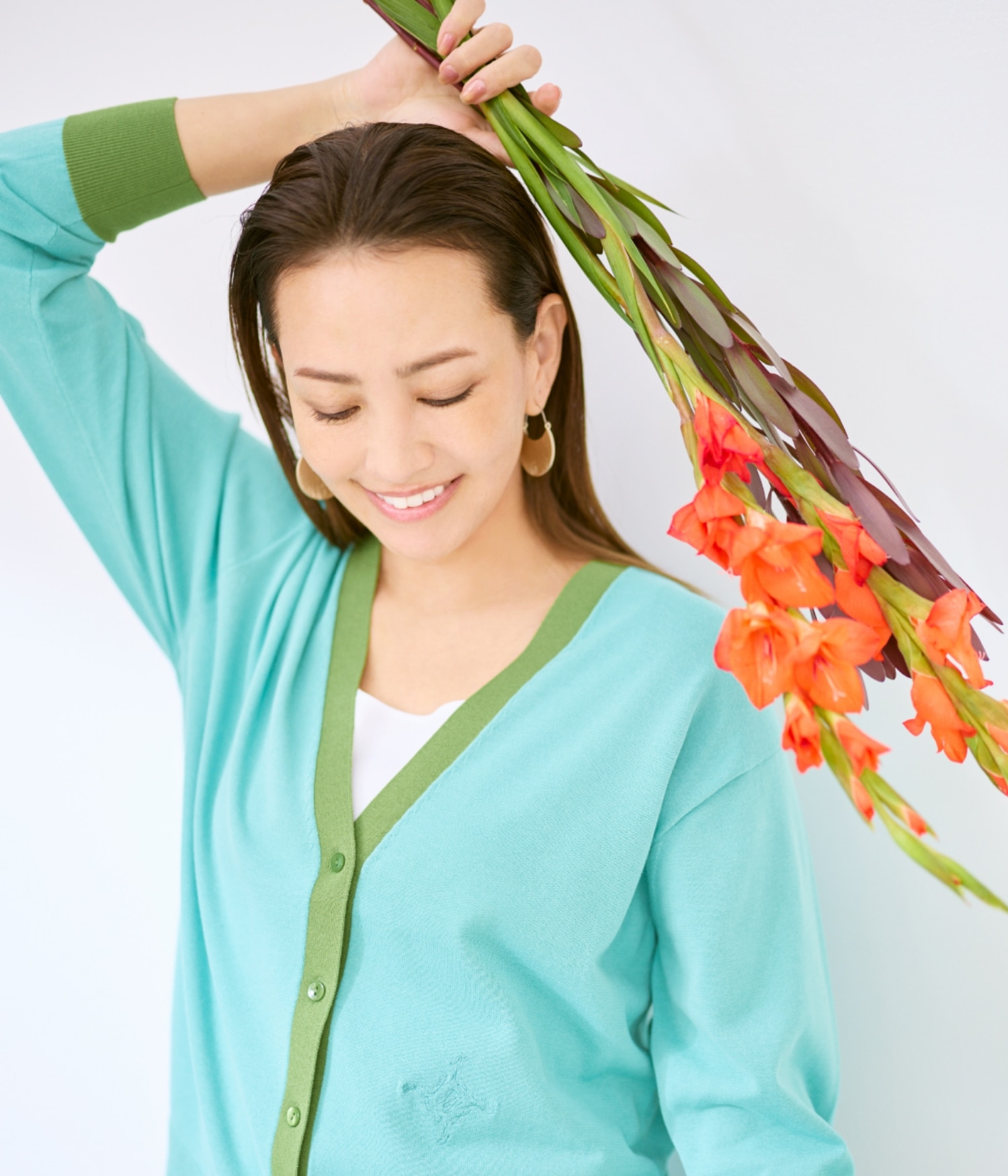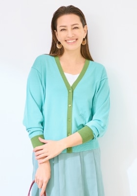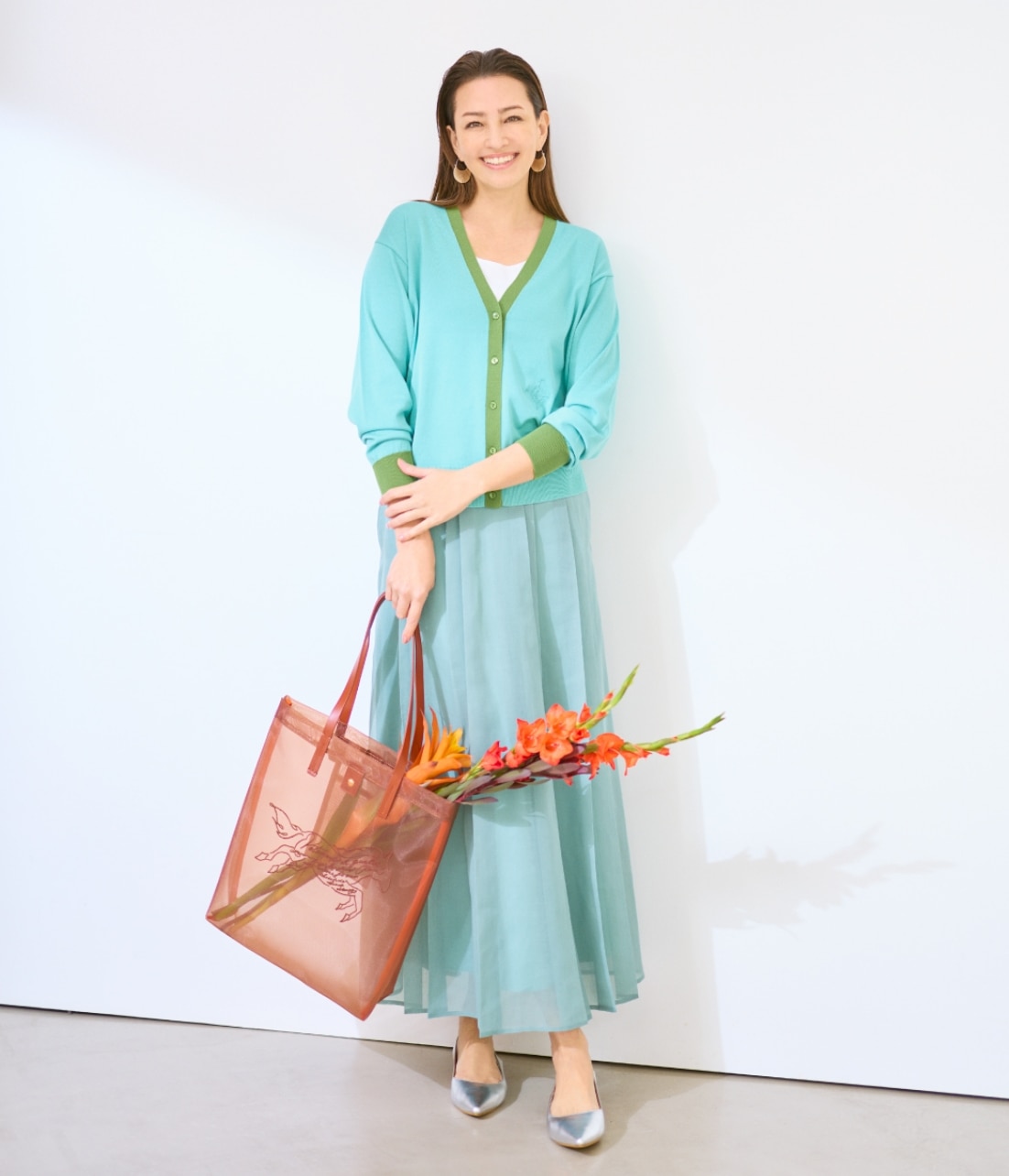 カラーブロッキングは今季の注目トレンド。新鮮な配色のカーディガンはその主役に。上品な光沢感と軽い着心地、接触冷感などの機能性を備えた素材で夏まで使えるアイテムに仕上げました。 ボトムスは亜麻調のシアー感のあるプリーツスカートで装いにメリハリを。広がりすぎない大人らしいシルエットもポイントです。