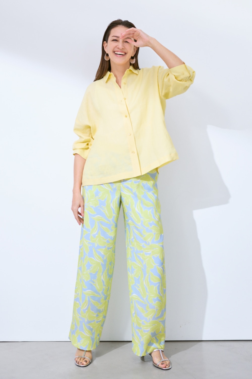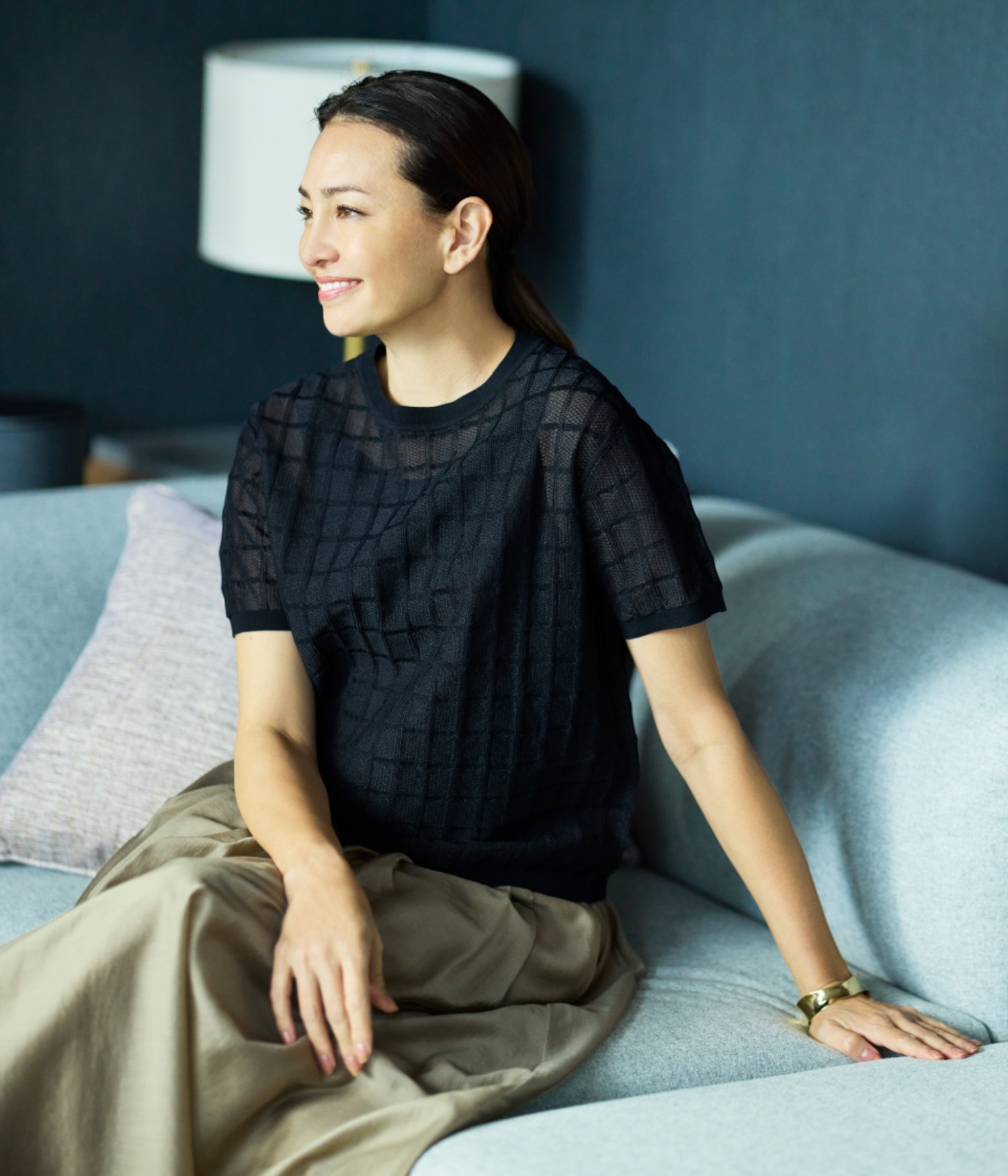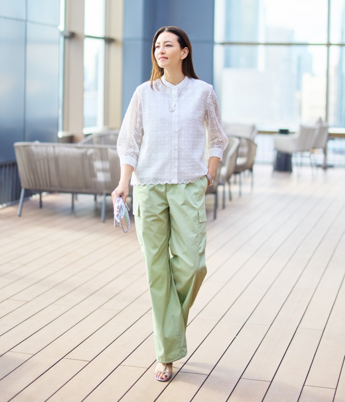 胸元には原田祥子さんのコンパスのアートワークを刺繍で表現。透け感のあるカラミ織りのパンツとカラーミックスして春夏らしい装いに。