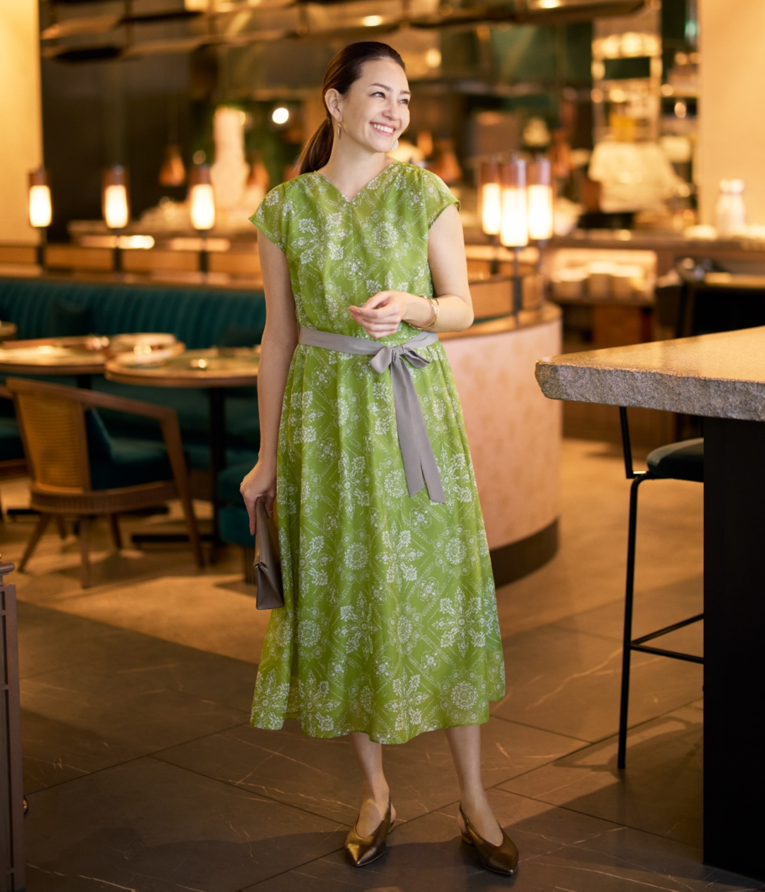 ワンピースを彩るのは、かつてイタリアのリゾート地で使われていた室内装飾用の図案をアレンジした自由区オリジナルのロータス(蓮)プリント。