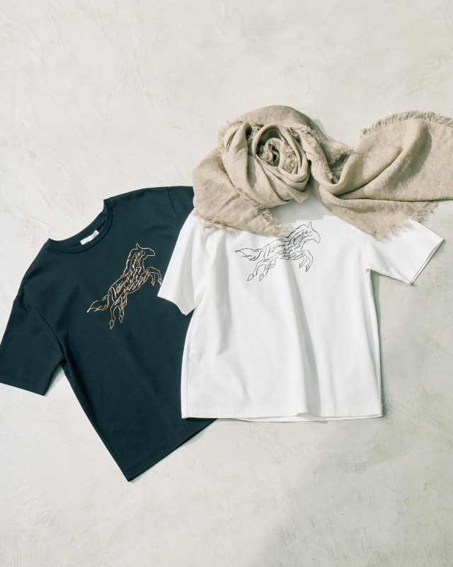 カリグラフィーアーティスト原田祥子さんとコラボレーションした特別コレクション。今回は「Elegance in Exploration」をテーマに、未知への探究心や自由の象徴として原田さんが制作した「コンパス」と「馬」のカリグラフィーがアイテムを彩ります。