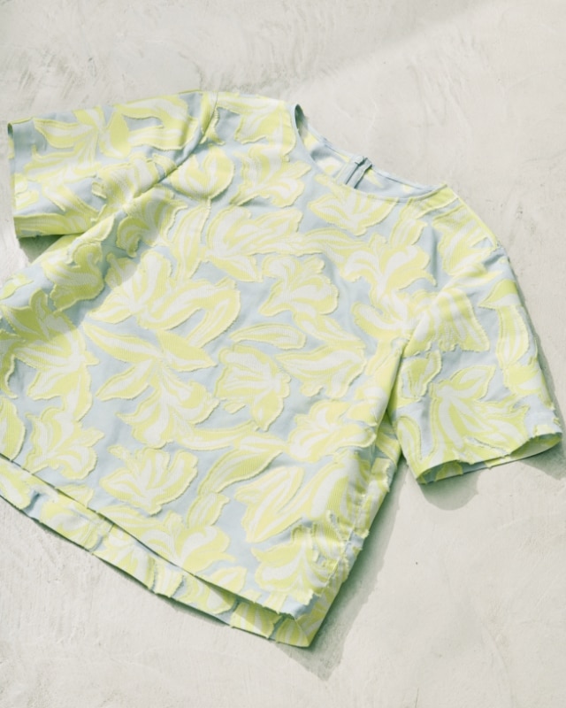 春のワードローブに欠かせない軽やかなレースアイテム。こちらのブラウスは、幾何学的な花柄を刺繍の技法で繊細かつ立体的に表現。