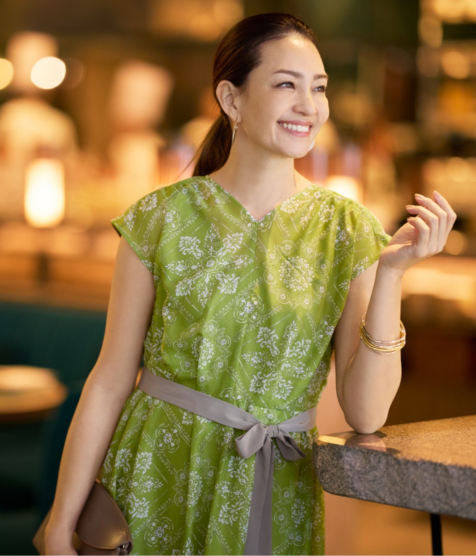 軽やかな素材と肩やウエストのタックギャザーが作る自然なドレープが相まって一枚でも優雅な印象に。ウエストを程よく絞った、着映えするシルエットにもこだわりました。