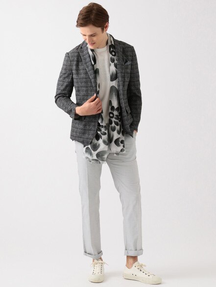 一度染めた生地の上からチェック柄のプリントをほどこすことで奥行きのある表情を生み出しています。織りによって凹凸のあるサッカー調の生地に仕上げており、肌離れが良くベタつきが無いのも魅力。ジャケット単体でも幅広く着回せます。