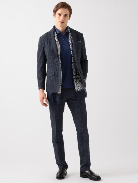 メランジ調のチェックやテキスタイルプリントをあしらうことで高級感を演出したクールジャージー素材を採用。オリジナルの裏地がアクセントになっています。内ポケットには抗菌性のあるスレキを使用しており、マスク入れとしてご活用いただけます。