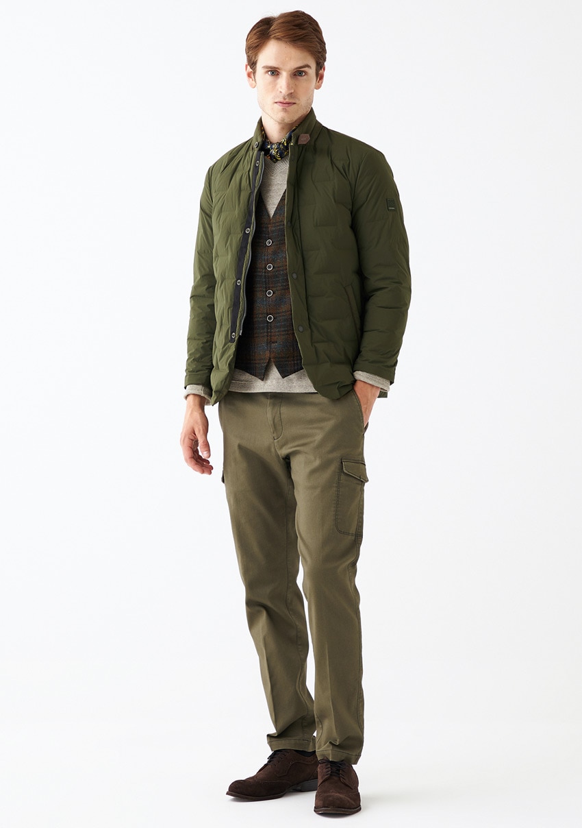 小松マテーレが開発したナチュラルダイスエードを使って、中綿入りのキルティングジャケットを作りました。天然成分を配合した染料で染め上げた生地は、環境にも見た目にも優しい色になっています。襟周りに形状記憶効果のあるワイヤーをあしらっており、着用した時のニュアンスを自在に演出できるのも特徴。
