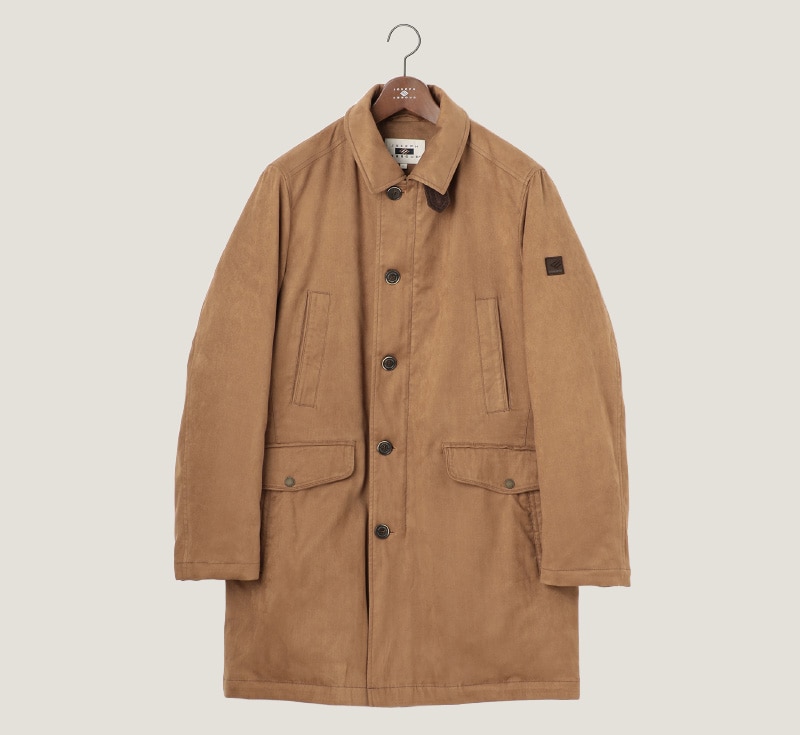 石川県の小松マテーレが手がけたスウェード素材で仕立てたダウンコート。軽量で手に吸い付くような高級感のあるタッチが特徴で、ストレット性も備えています。植物から抽出した天然染料で染め上げることで、深みのある色合いを表現しているのも魅力。上品なステンカラーコートタイプなので、ビジネスシーンにもマッチします。