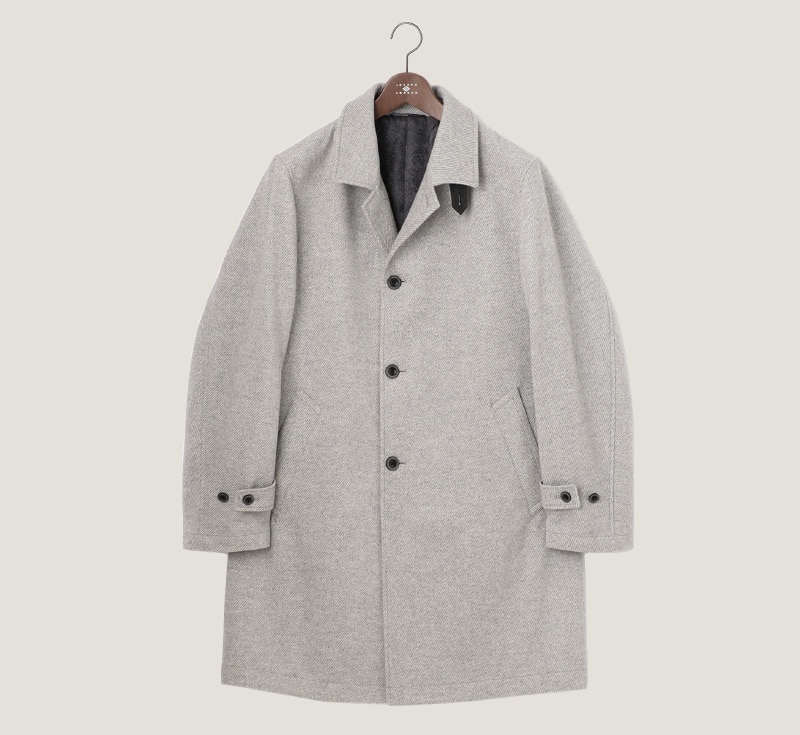 世界有数の毛織物産地である尾州の工場で織られた生地を採用したコート。タテ糸にスーパー120’sの極細のウール糸、ヨコ糸にアンゴラ30%・ウール70%で混紡した糸を使用してています。アンゴラは繊維が中空になっているため、見た目より軽くて暖かいのが特徴。起毛加工をすることで上品な光沢を表現しています。