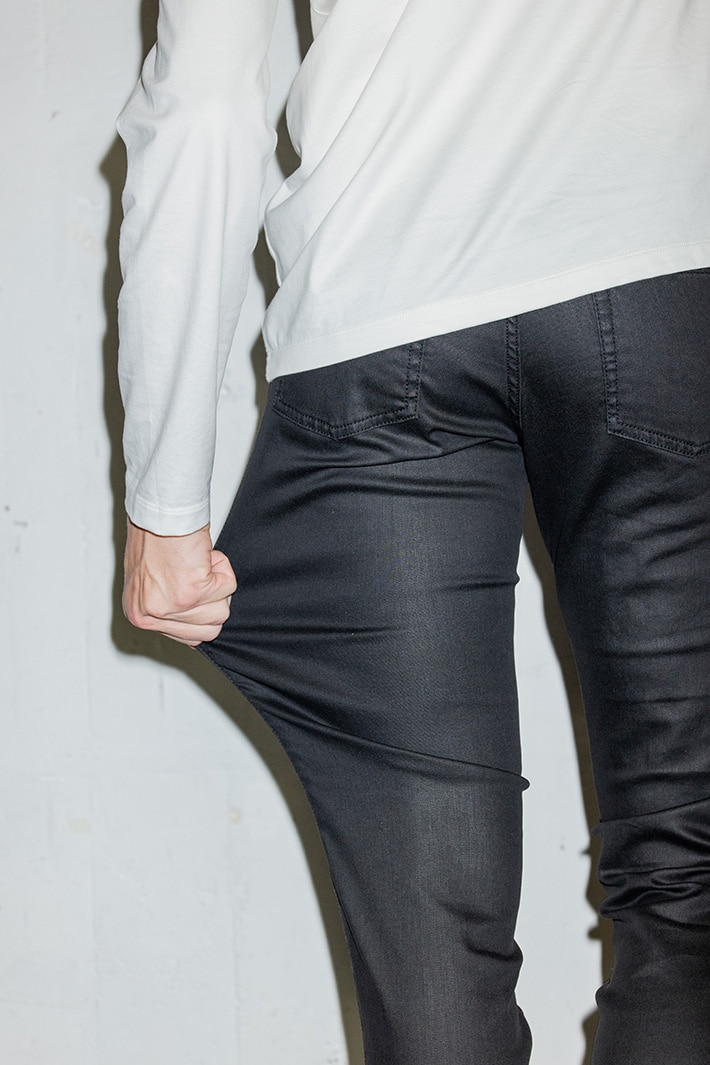 コーティングの美しさと圧倒的なストレッチ性を兼備したパンツ。