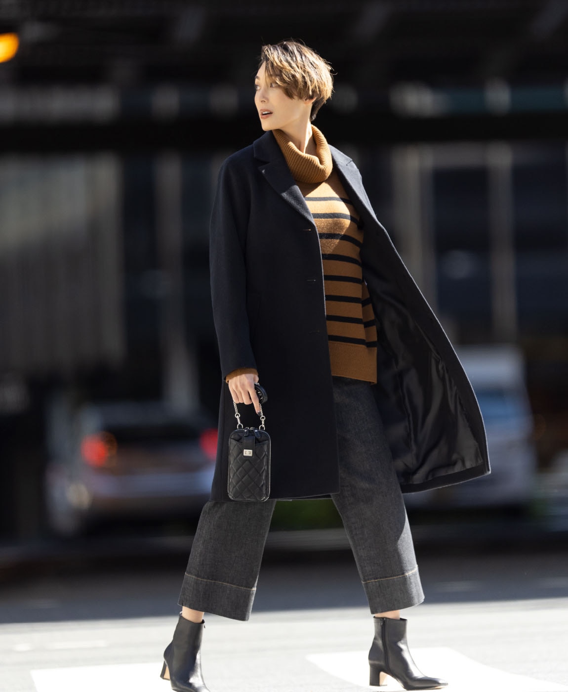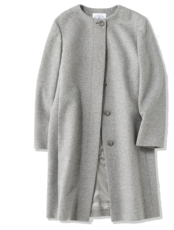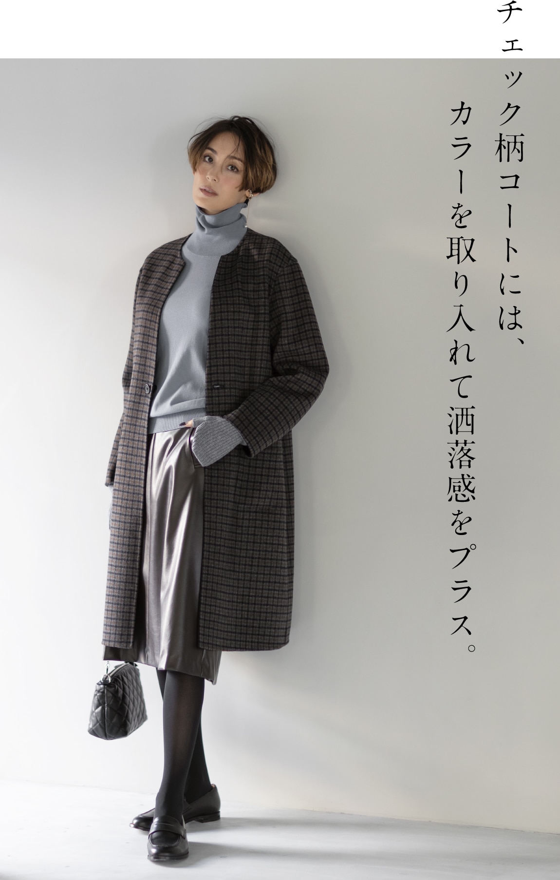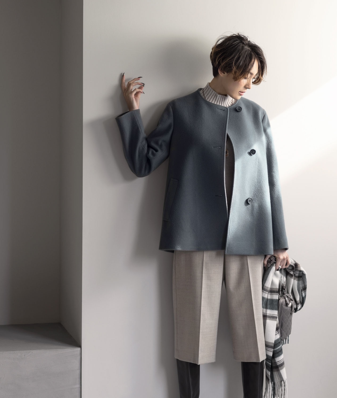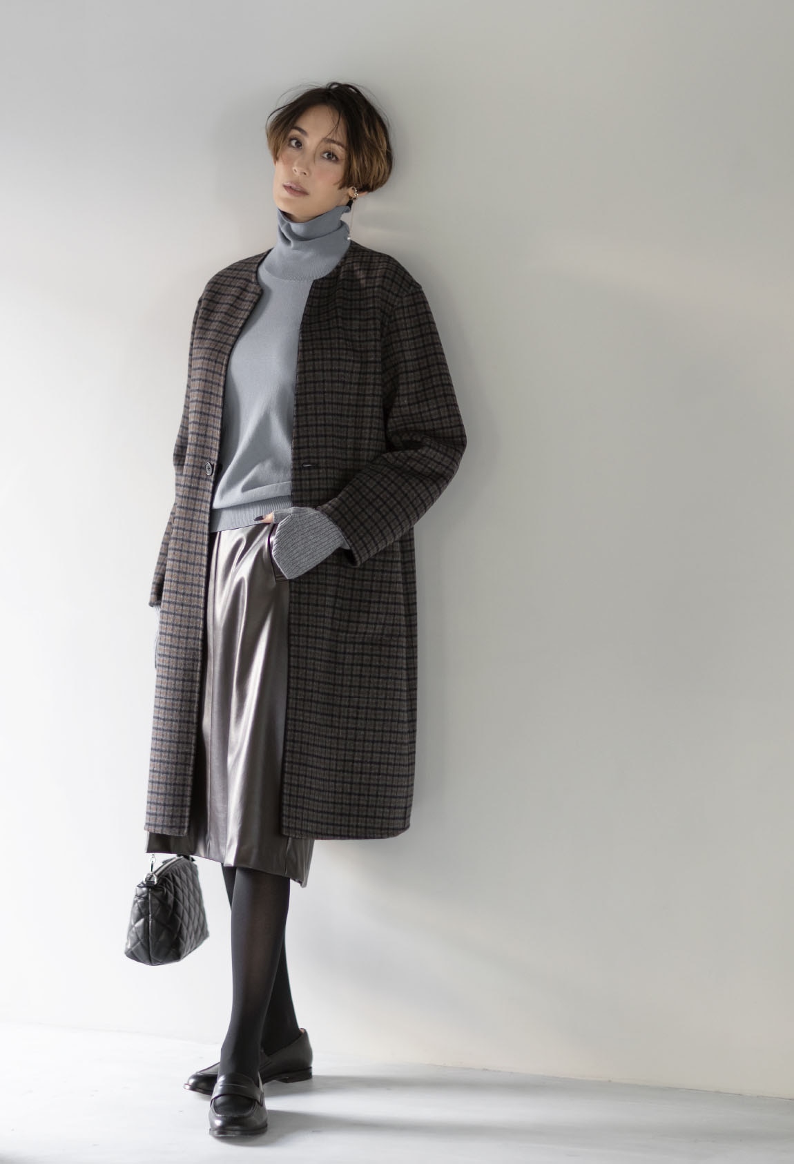 スカートでもパンツでも合わせやすい着丈のベーシックなノーカラーコート。タートルネックなどのニットとも相性抜群です。ボクシーなシルエットなので、カジュアル使いもおすすめです。