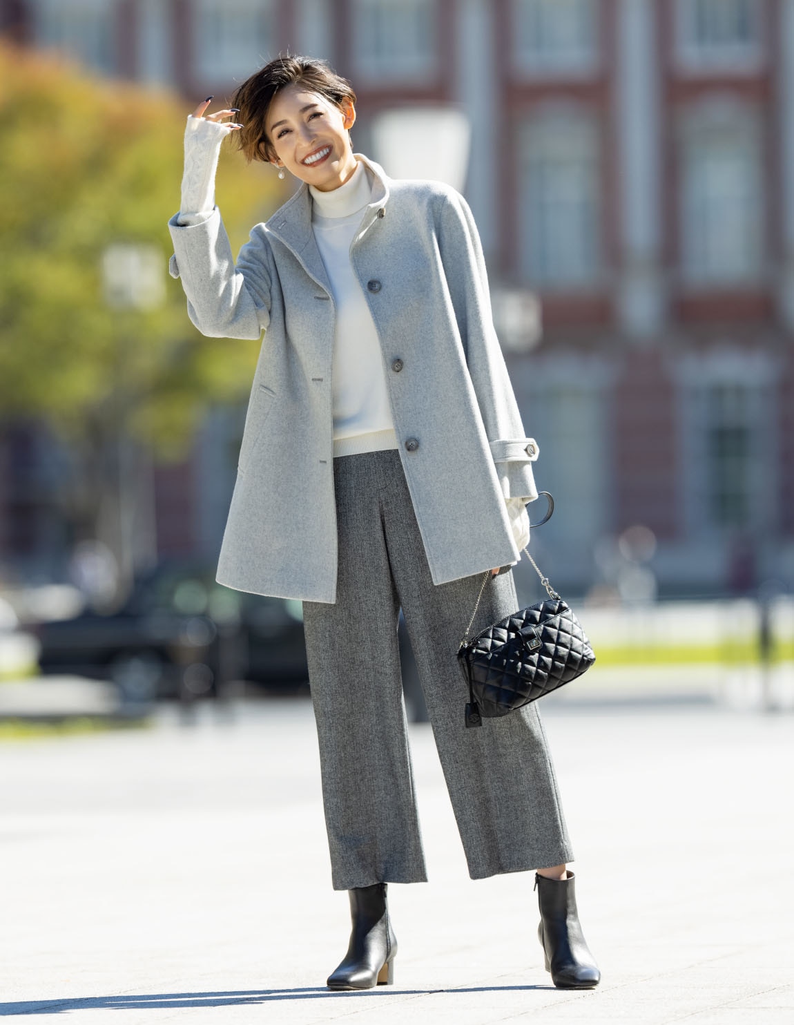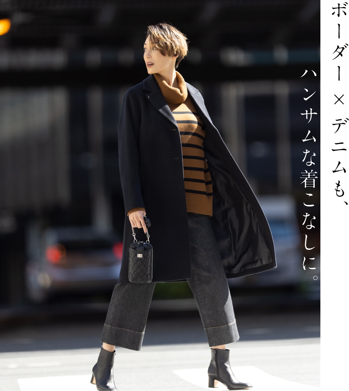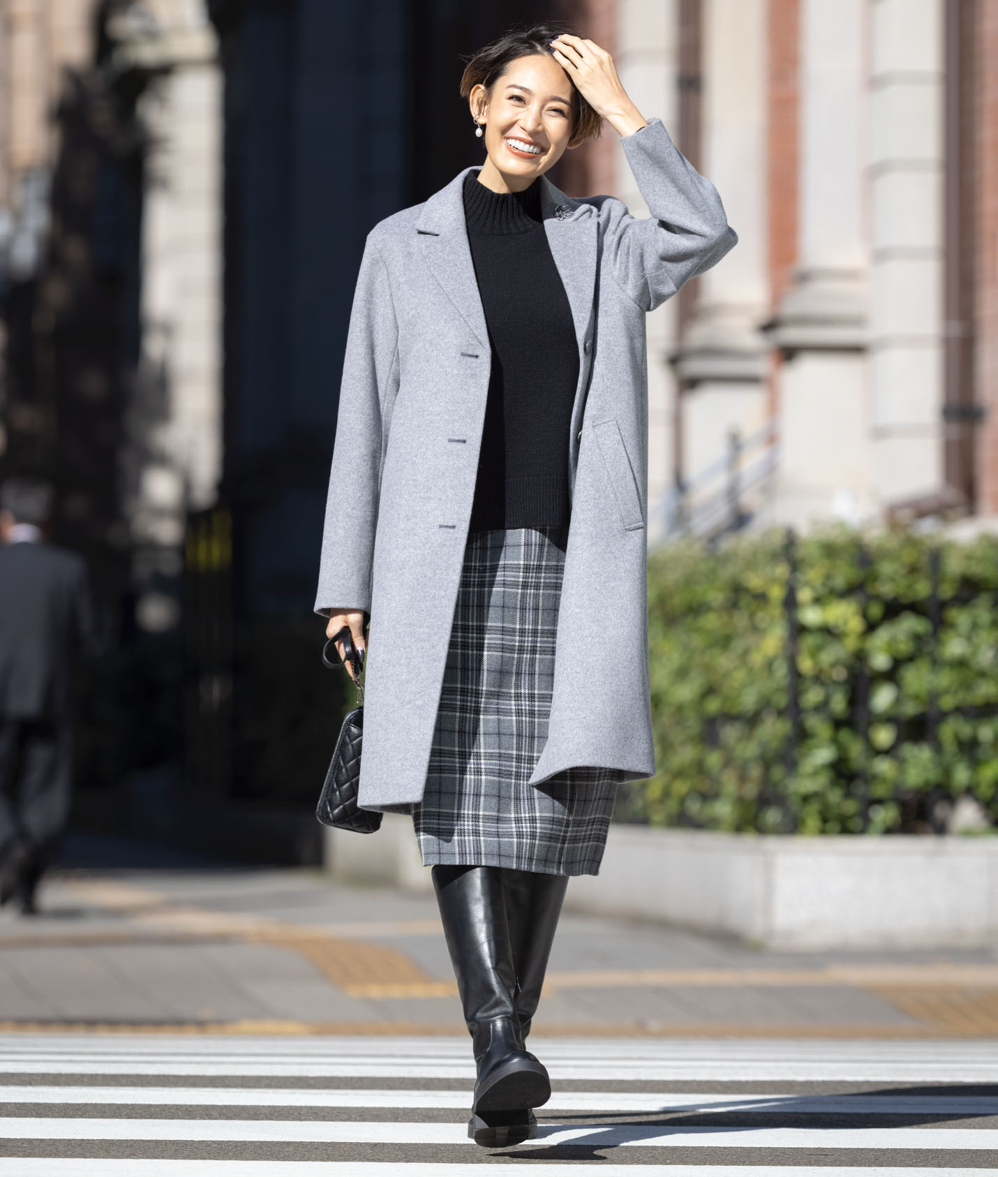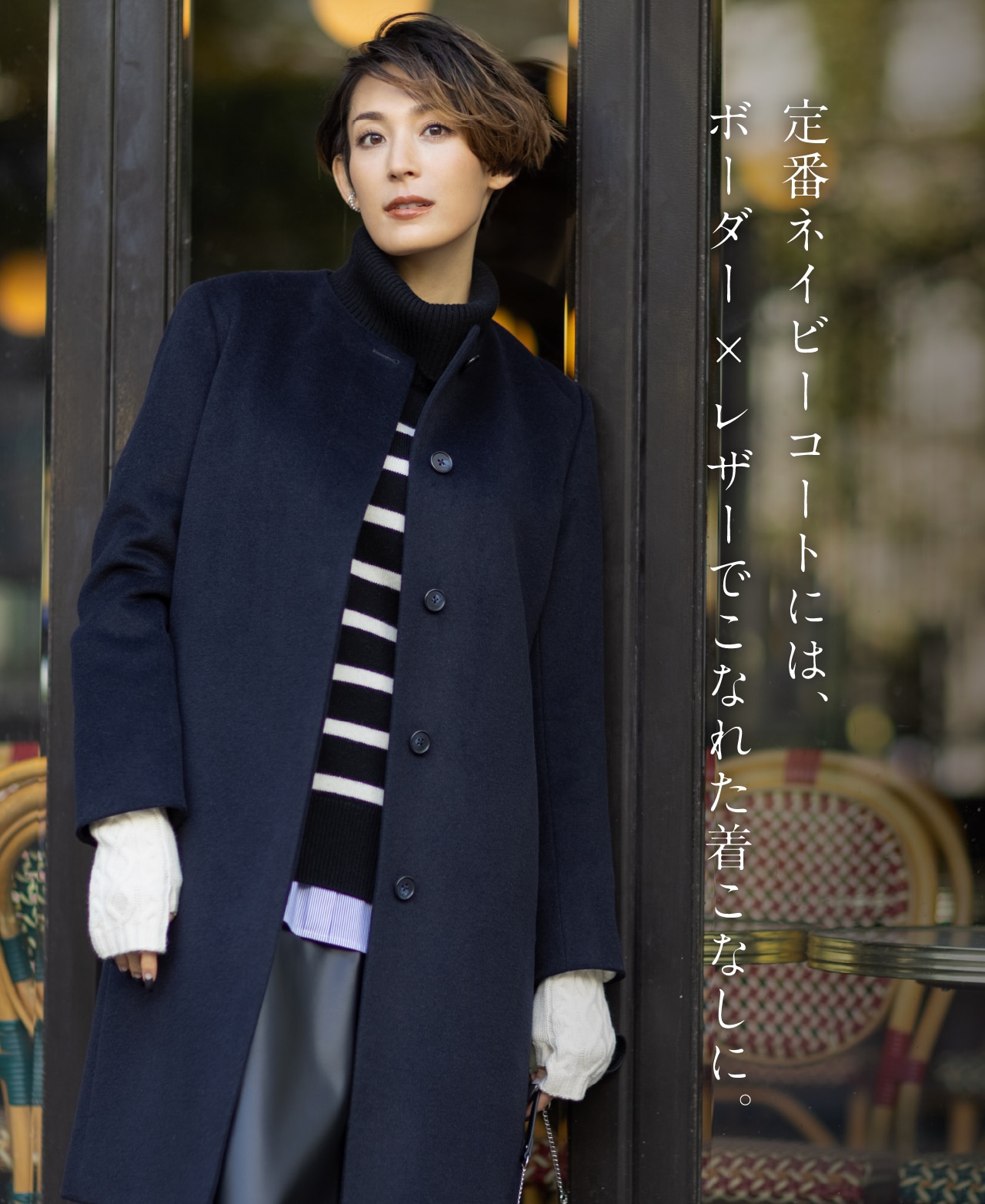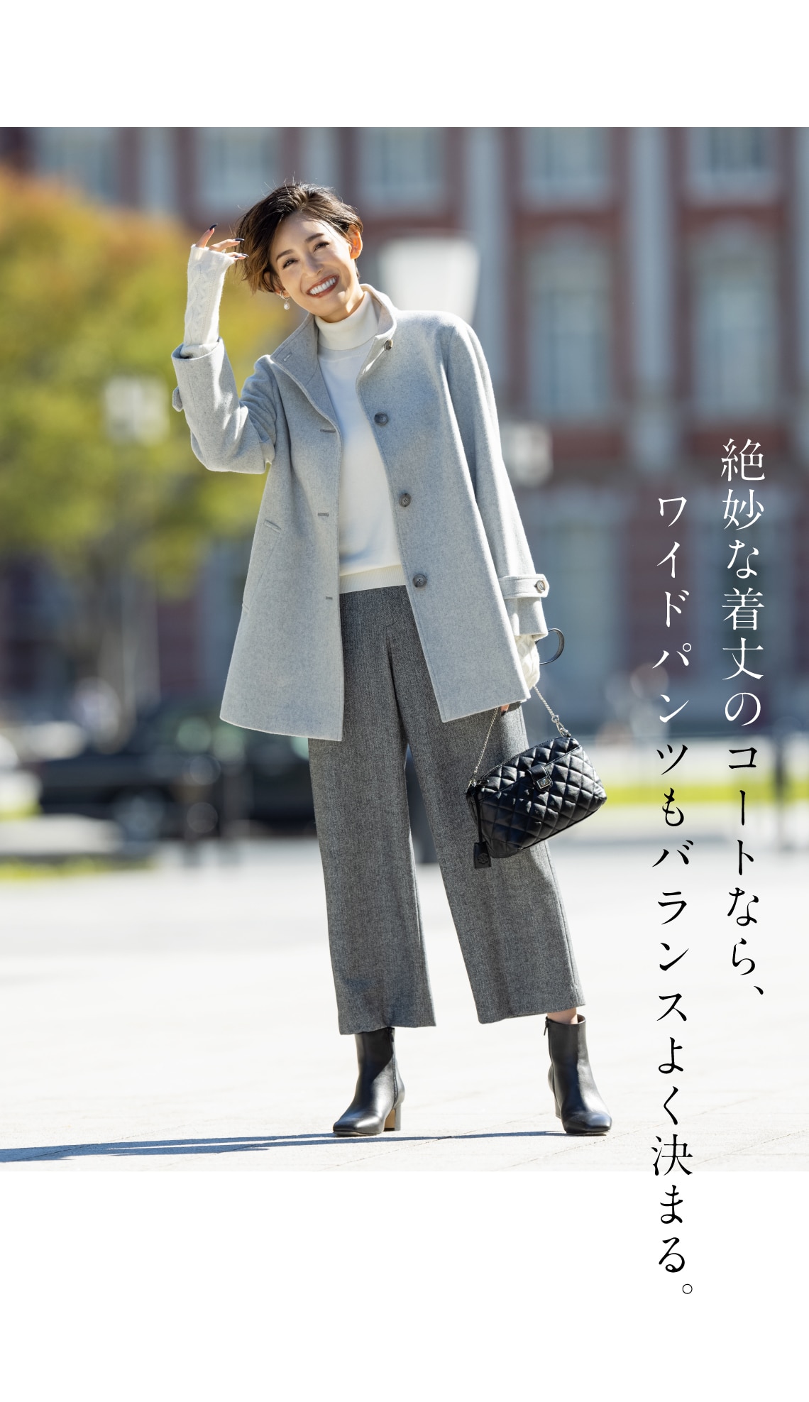 スカートでもパンツでも合わせやすい着丈のベーシックなノーカラーコート。タートルネックなどのニットとも相性抜群です。ボクシーなシルエットなので、カジュアル使いもおすすめです。