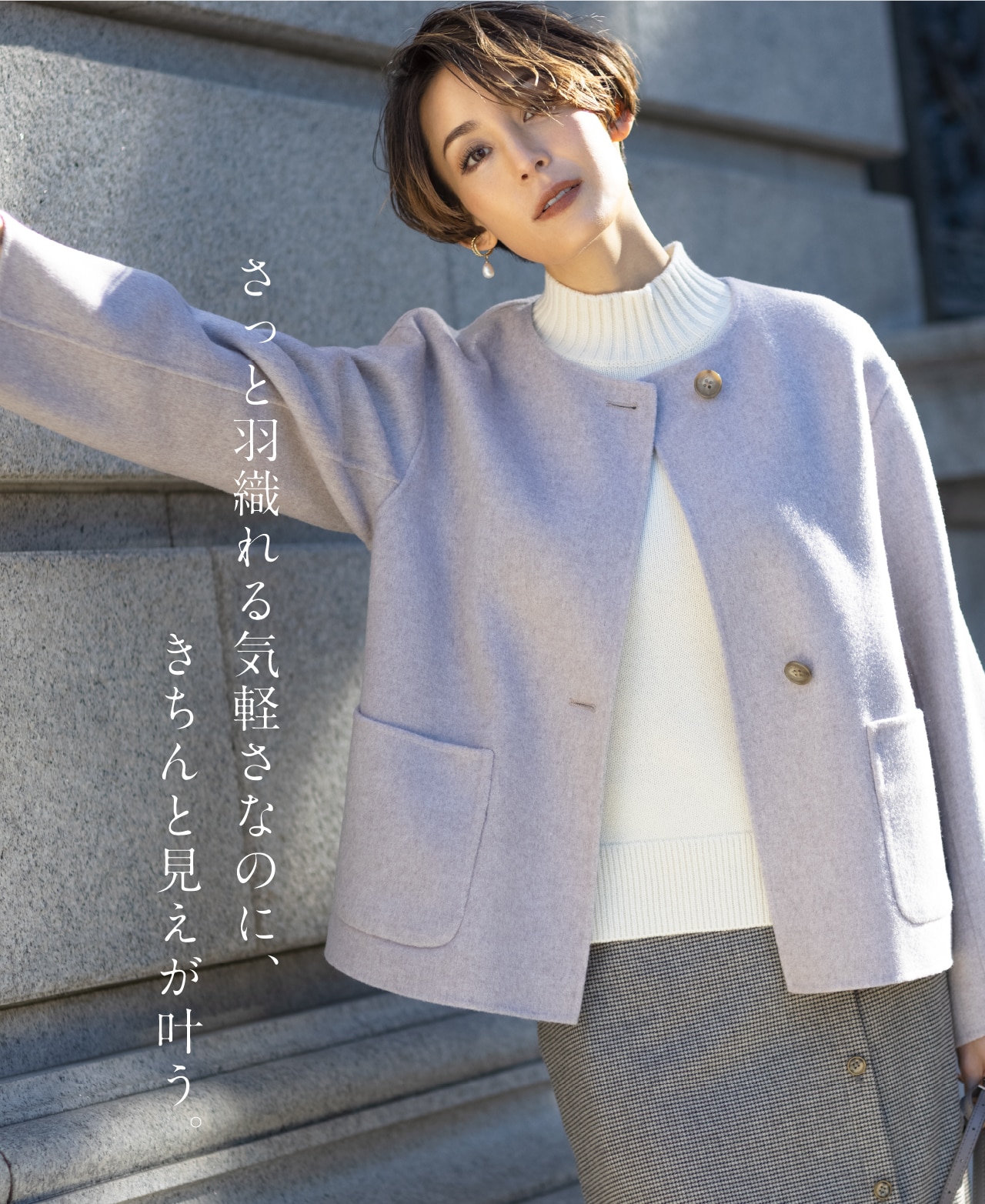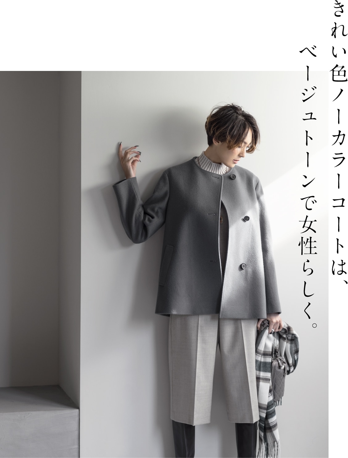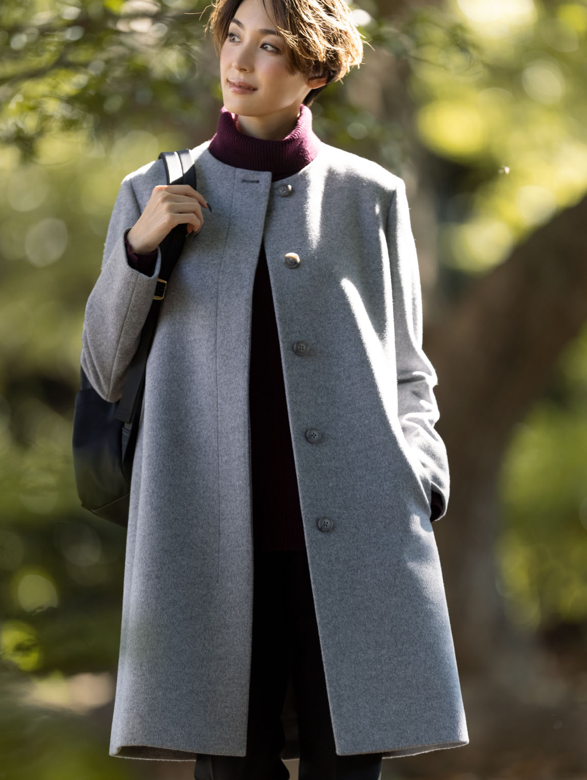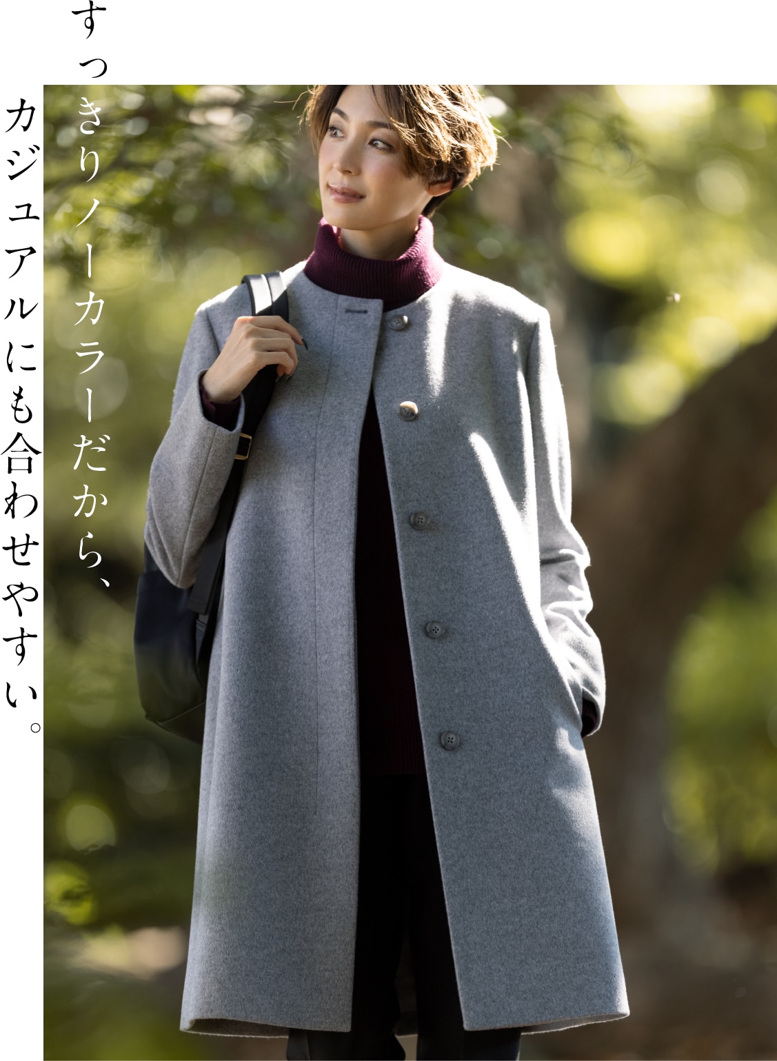 顔周りをすっきり見せる、女性らしいノーカラーコート。ほんのりオーバーサイズなシルエットと丈感が、スカート、パンツと合わせるアイテムを選びません。