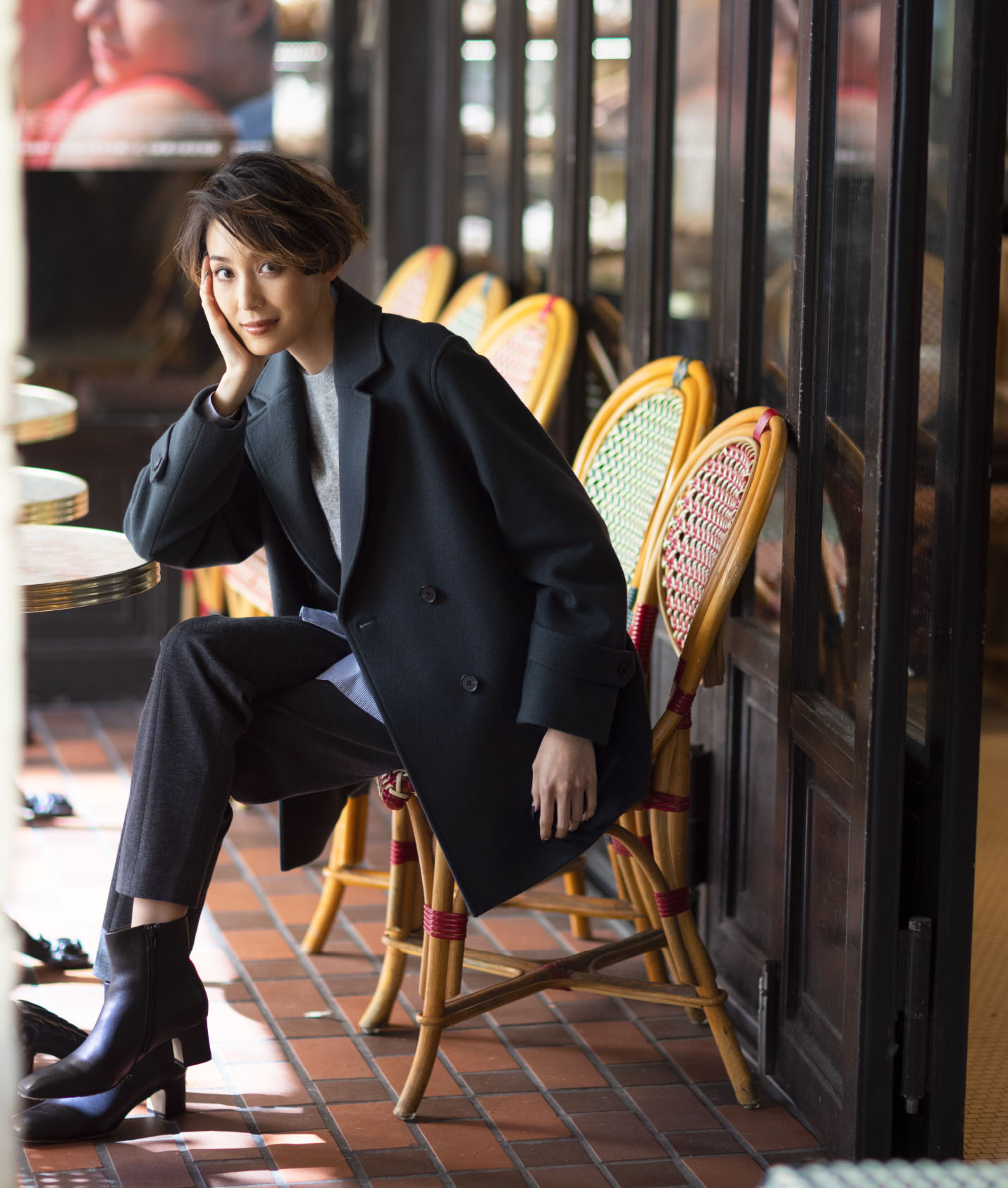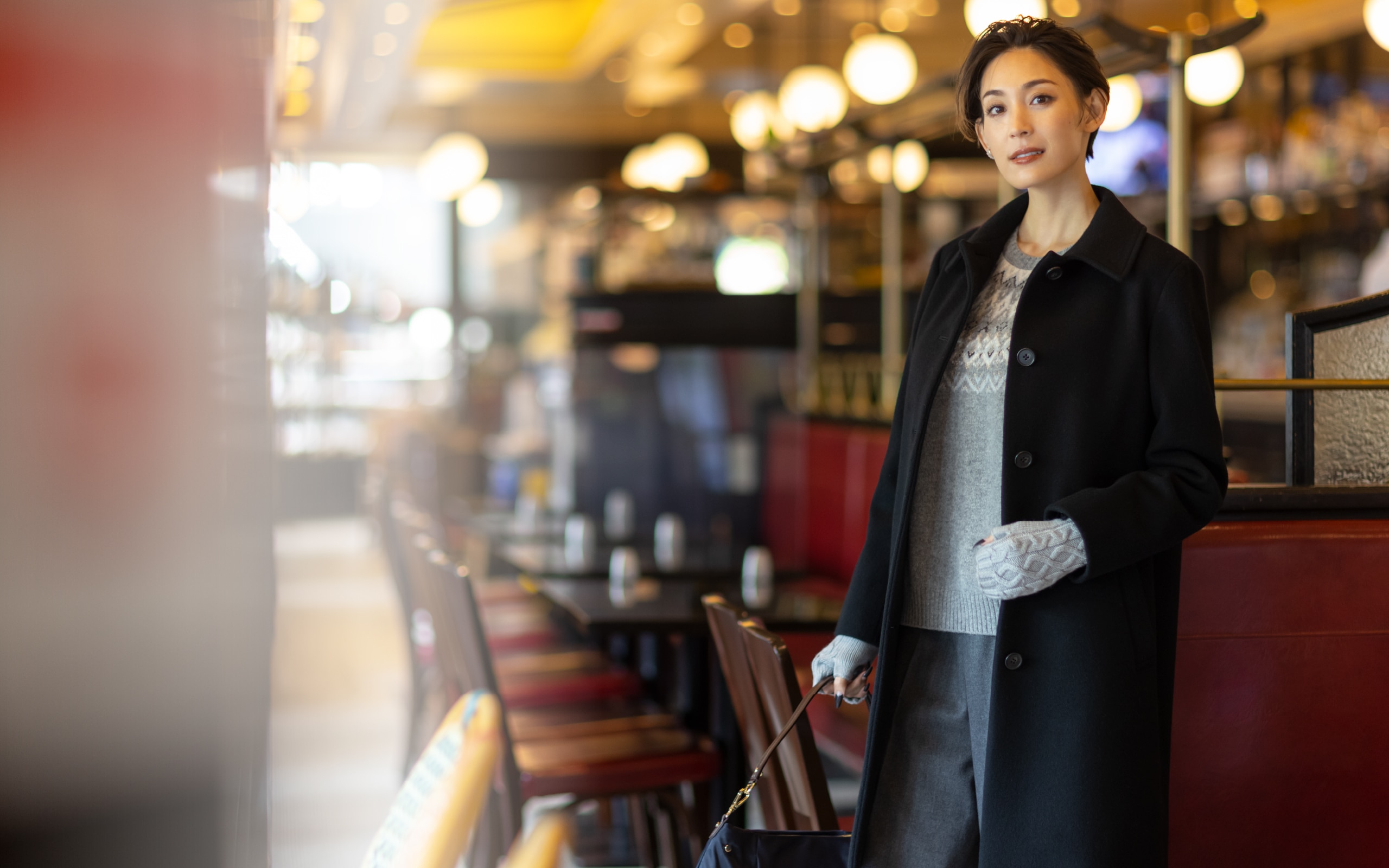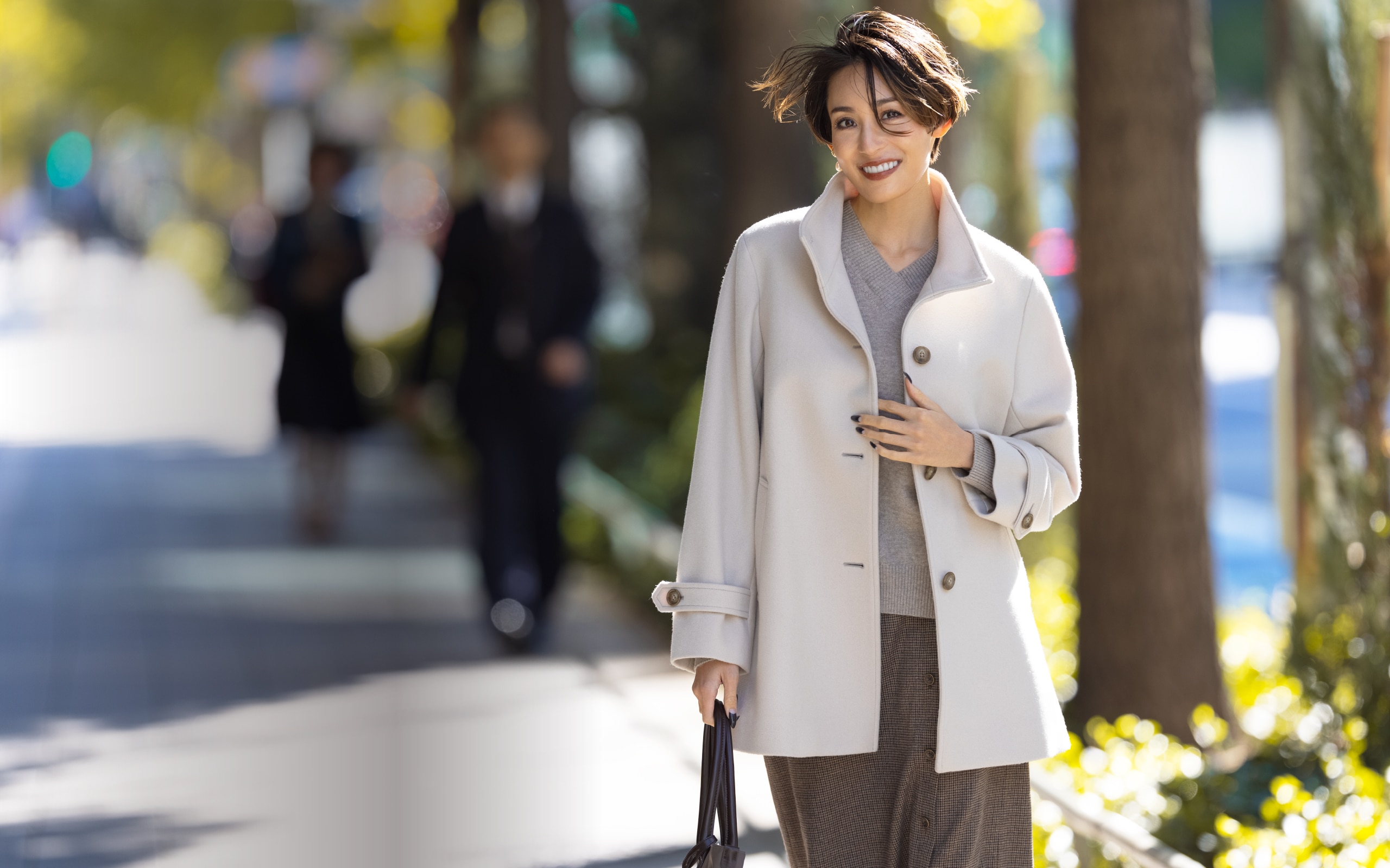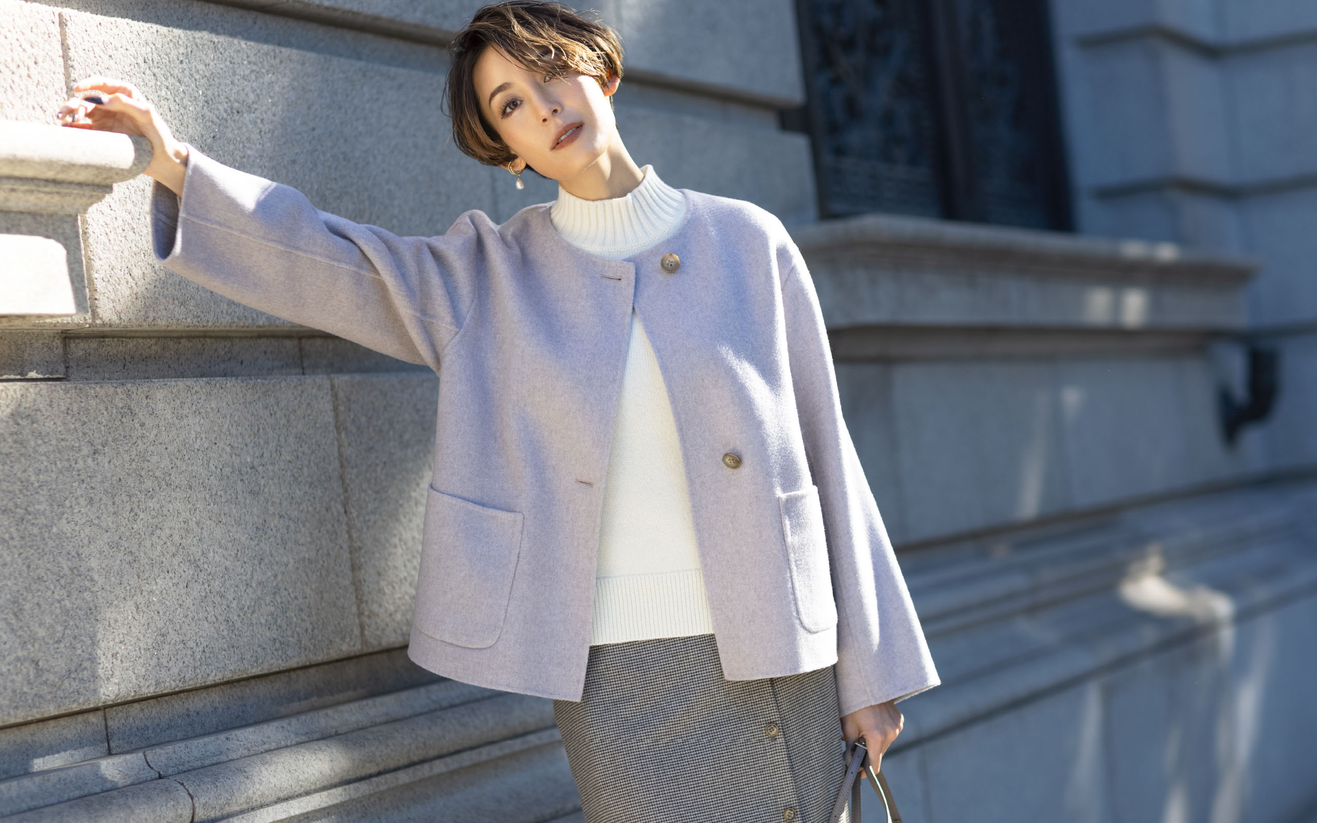 顔周りをすっきり見せる、女性らしいノーカラーコート。ほんのりオーバーサイズなシルエットと丈感が、スカート、パンツと合わせるアイテムを選びません。