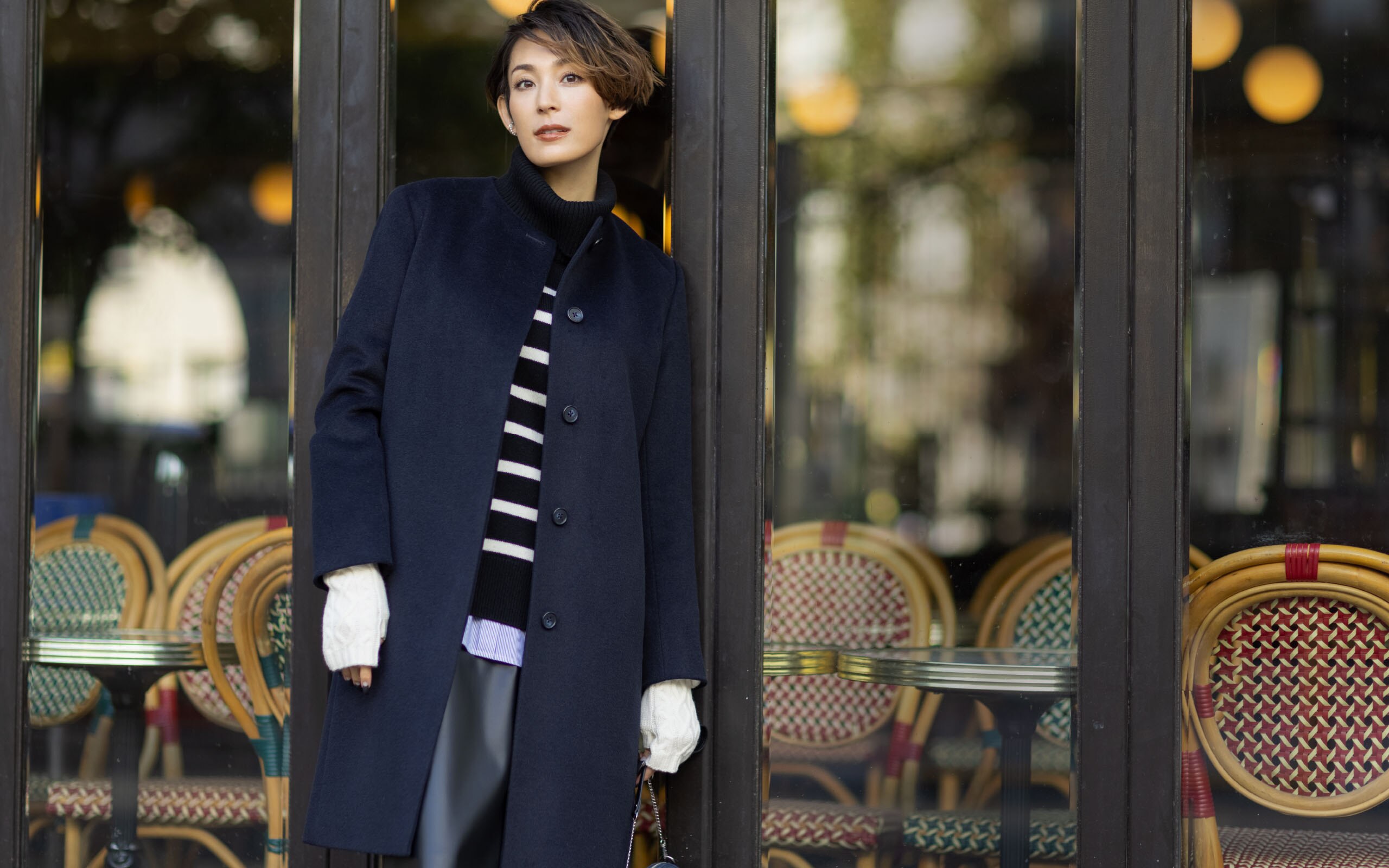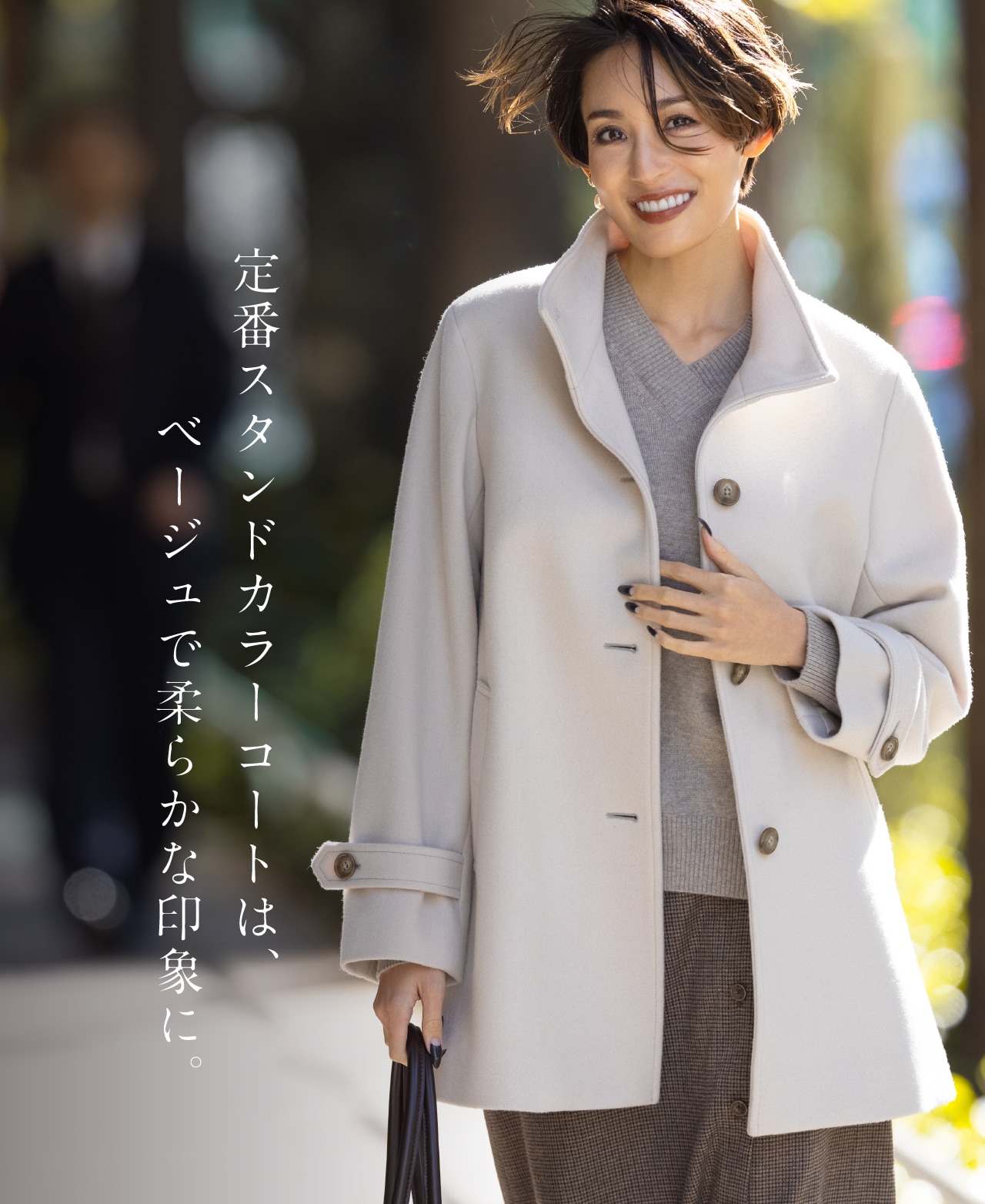 前を開けてきても顔につかない絶妙な高さにこだわったスタンドカラーコート。長すぎないミドル丈はスカート、パンツと様々なアイテムとも相性◎