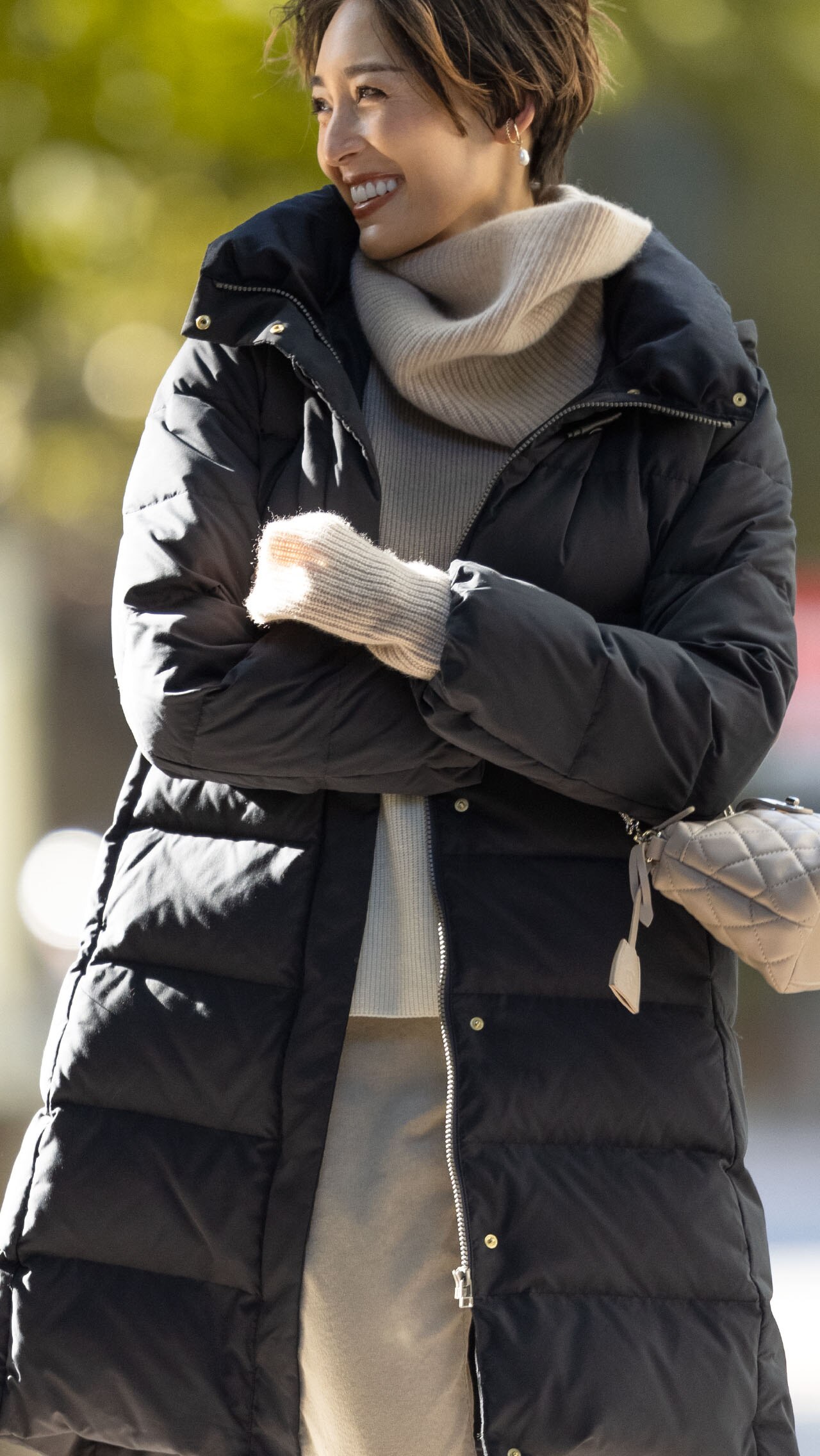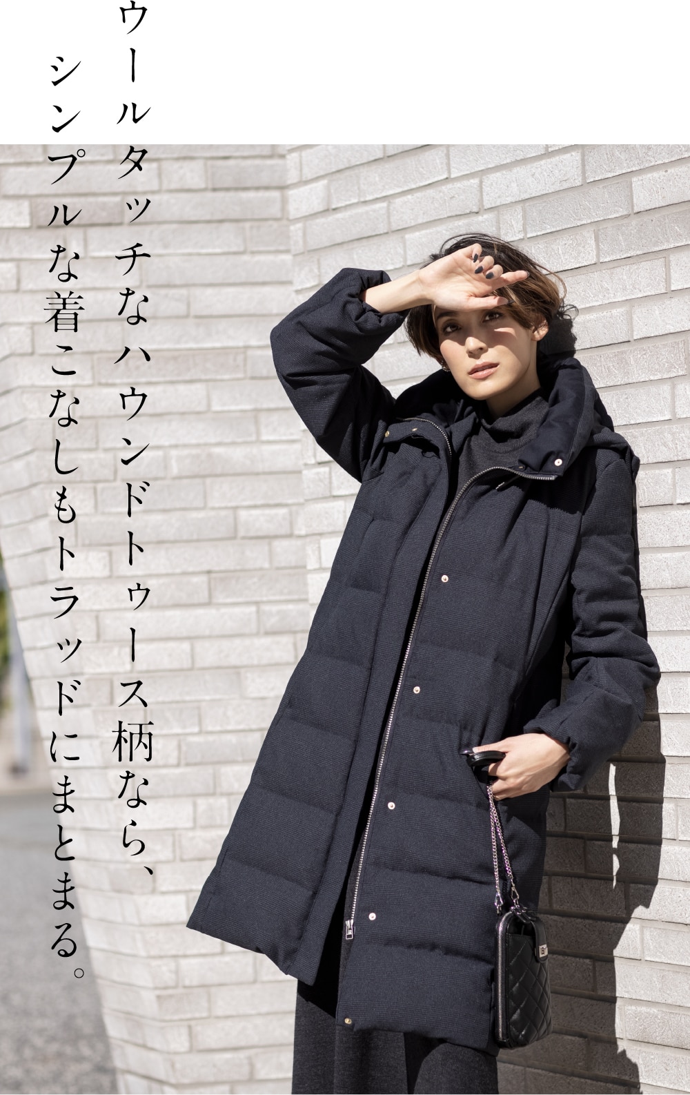 通勤からカジュアルまで使えるキレイめシルエットのロングダウンコート。襟元のトグルボタンもポイントです。無地とウールライクなハウンドトゥース柄がございます。