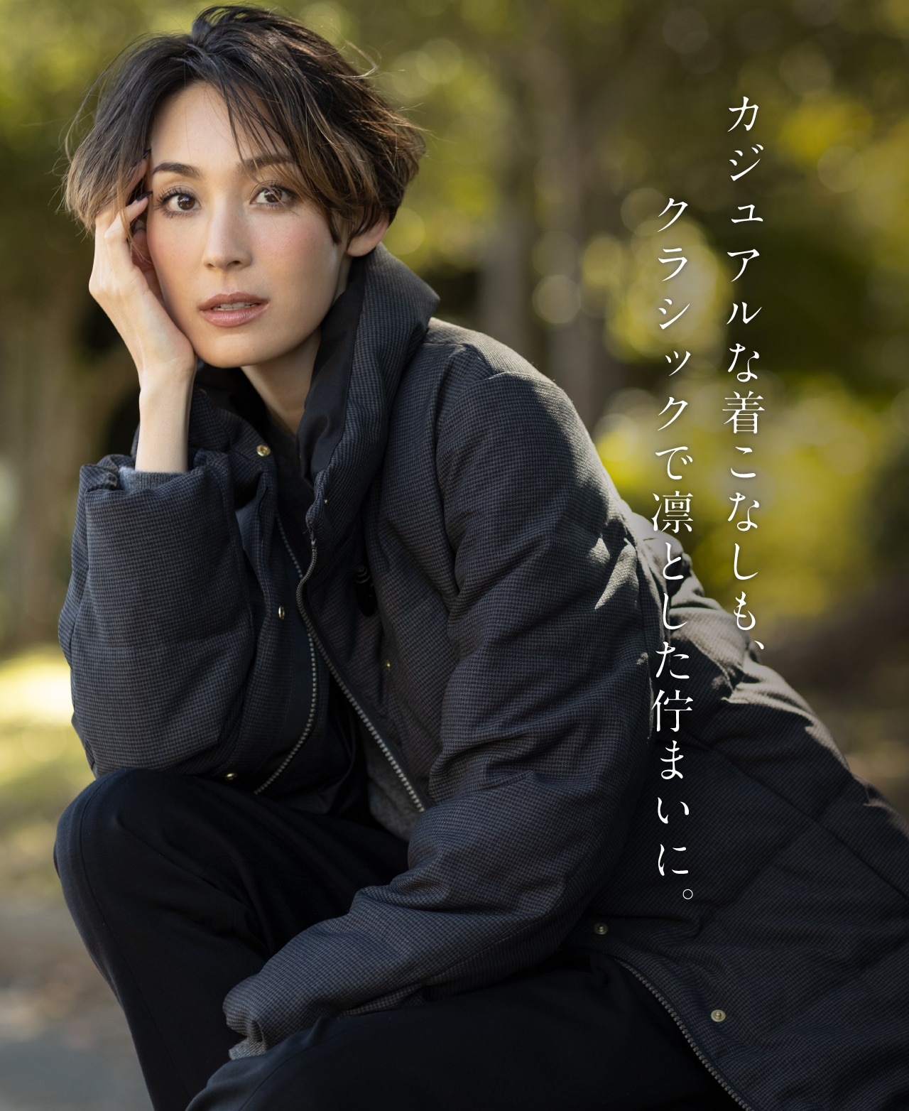 お尻まで隠れる着丈がうれしい、ショート丈。開けてきたときのシルエットにこだわったスタンドカラーデザイン。無地とウールライクなハウンドトゥース柄がございます。