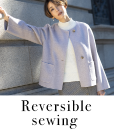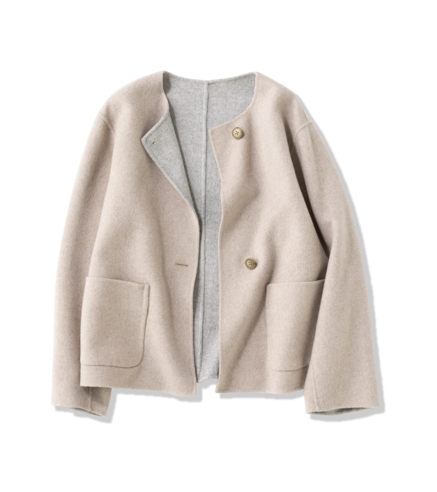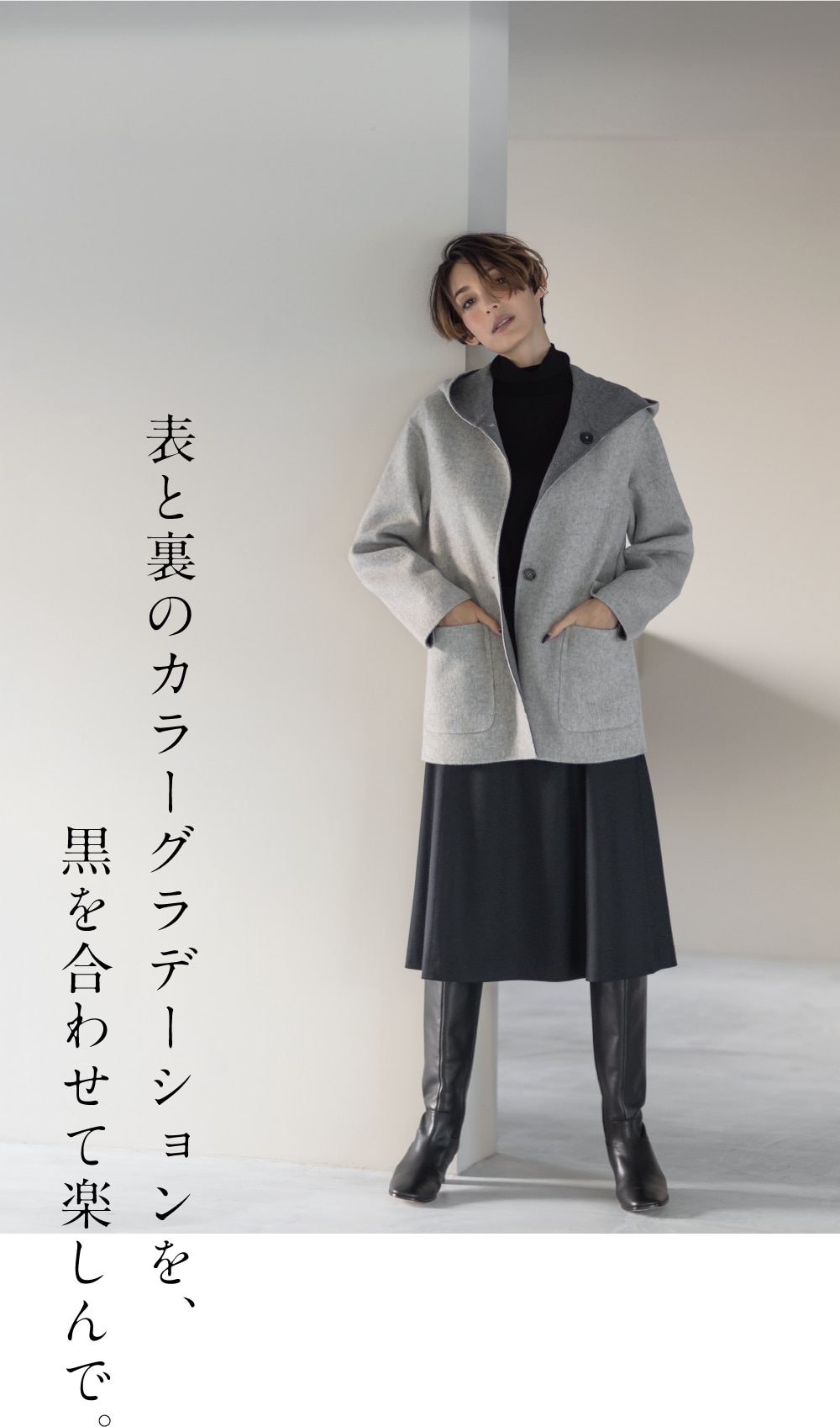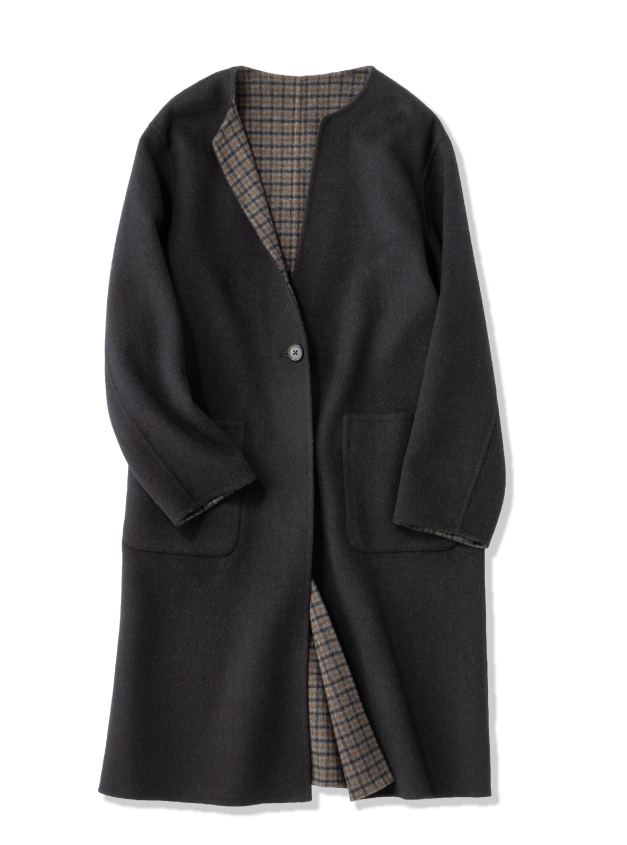 優しい肌触りのリバーコート。リバーシブル仕立てで表裏のカラーを楽しめます。さっと羽織れる気軽なウールコートをお探しの方はまさにこれがおすすめ。