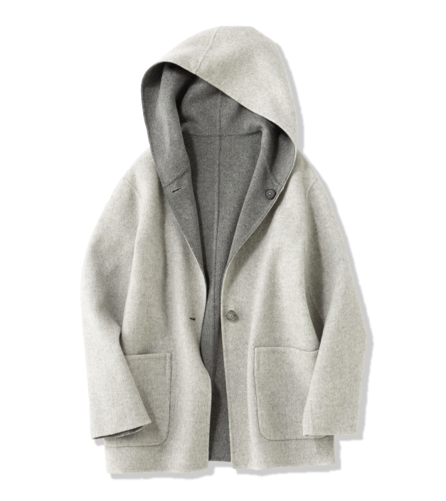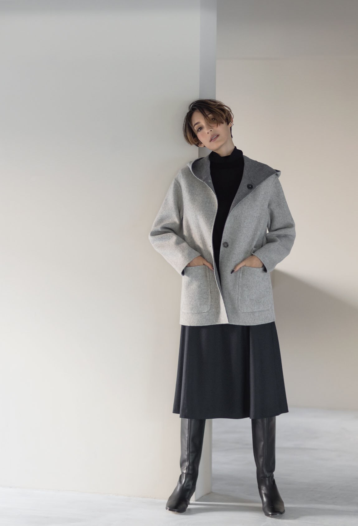 去年も好評だったフーデットコートが、今年はミドル丈になって登場です。ロングスカートやワイドパンツでも、バランスがとりやすい着丈に。
