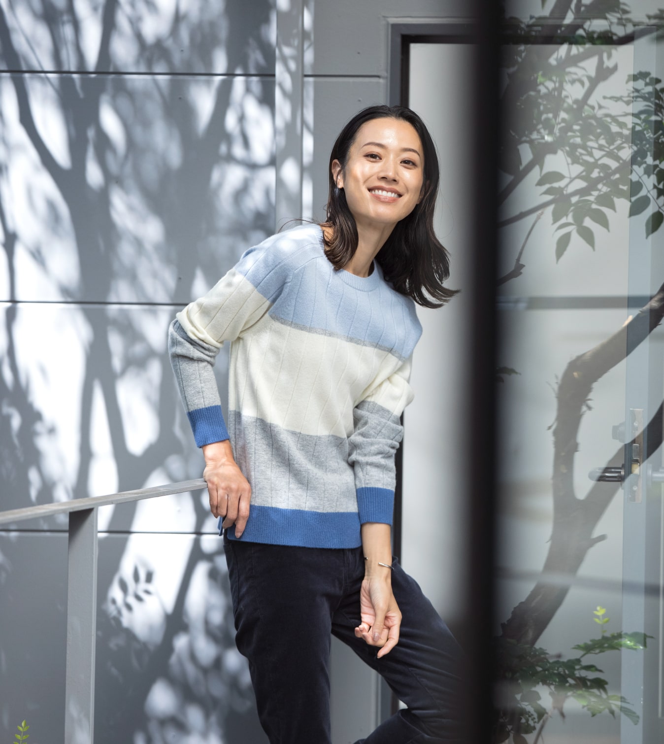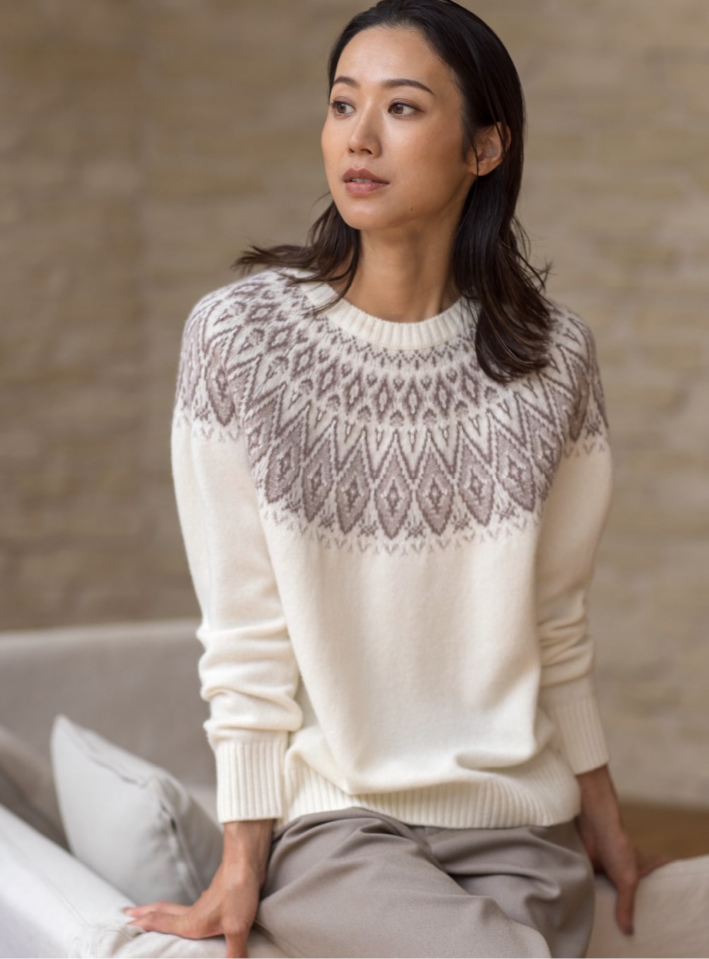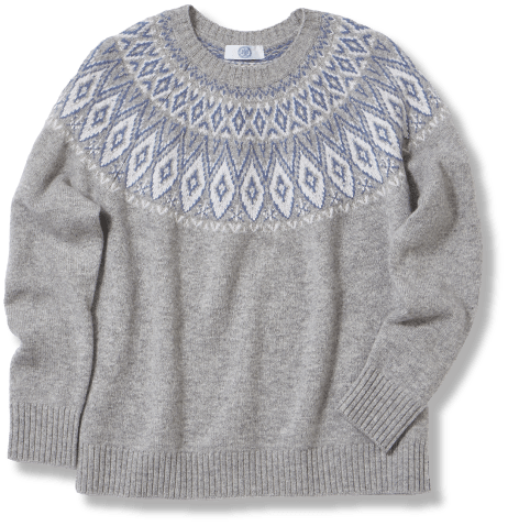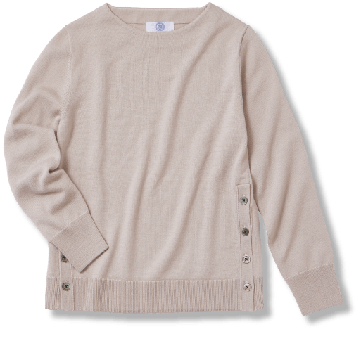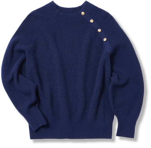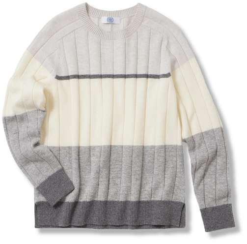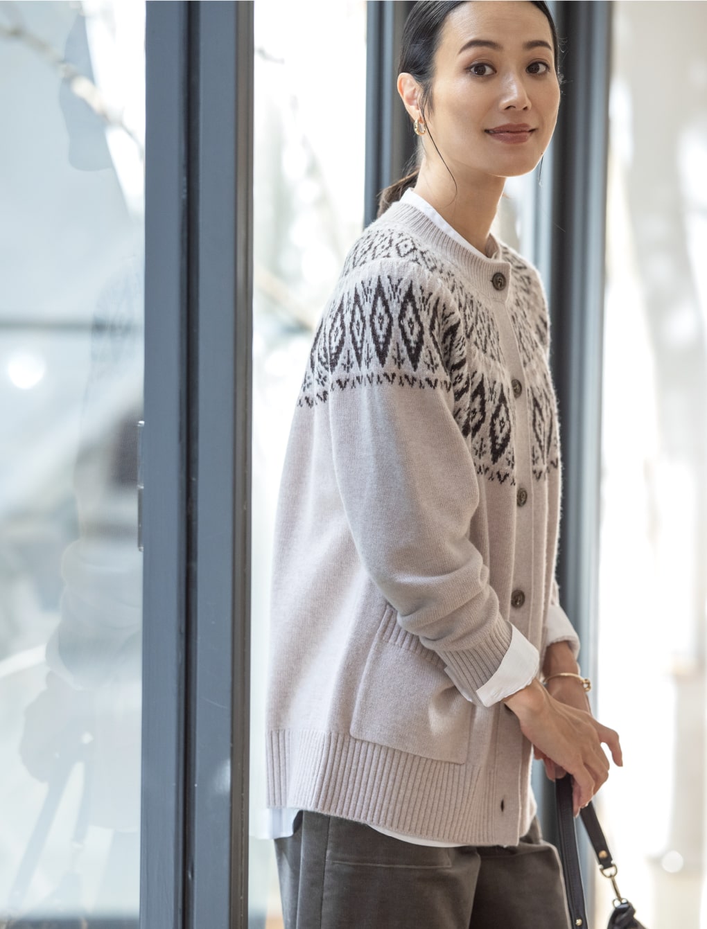 デイリー使いを意識したオリジナルパターンがポイント。すっきりとしたラウンドネックでコートインにも着映える一枚。