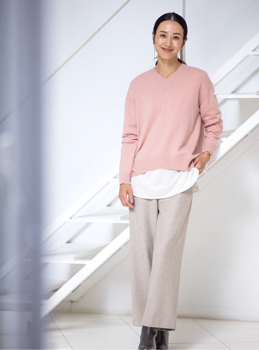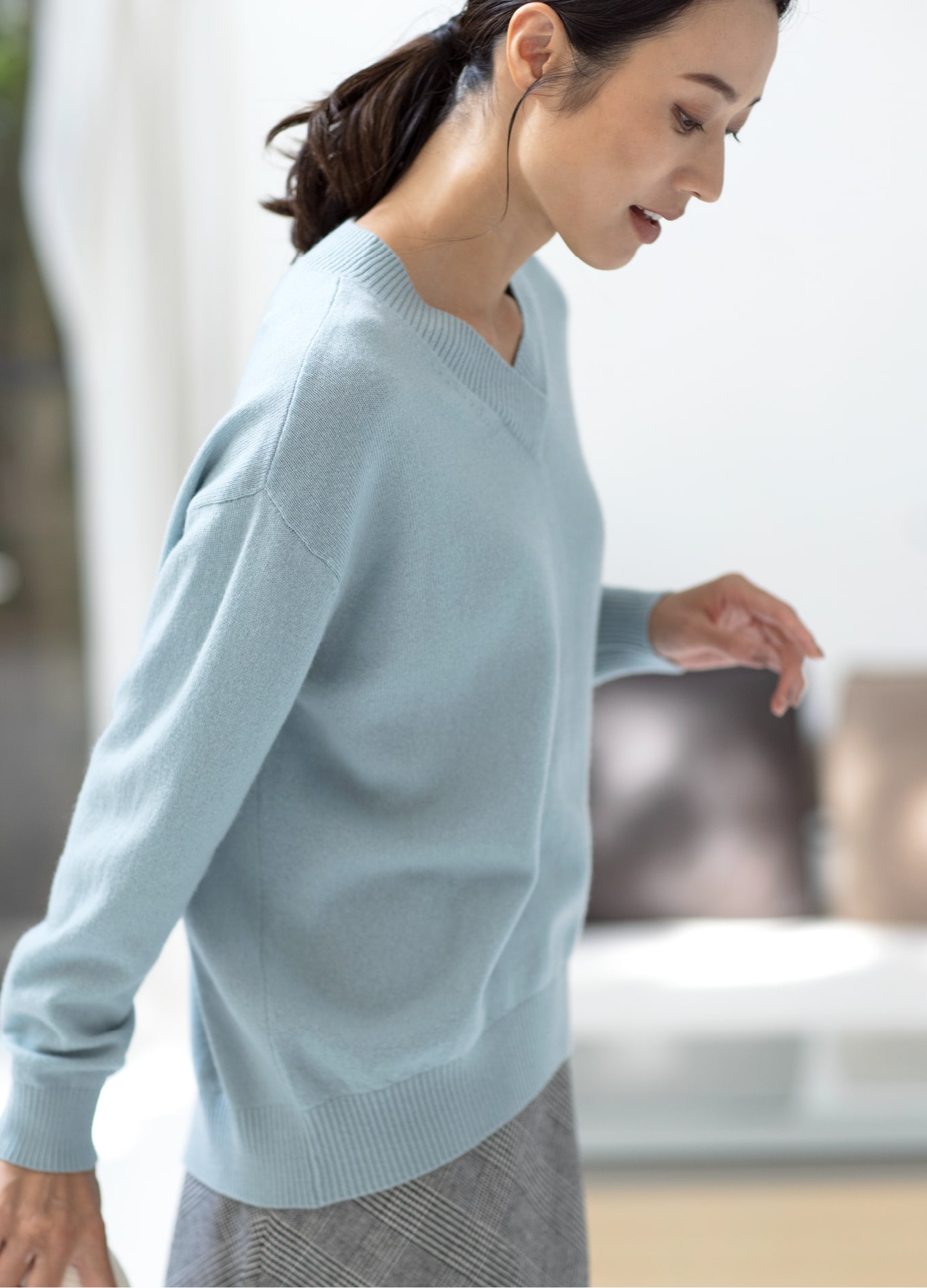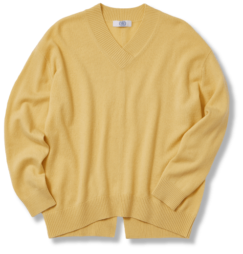 ベーシックながらも一枚で着映えするデザインとカラーにこだわった一枚。開きすぎないVネックとほどよいゆとりが、余裕のある大人のニットスタイルに。