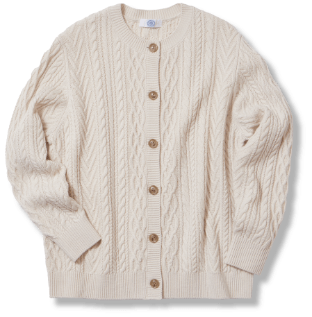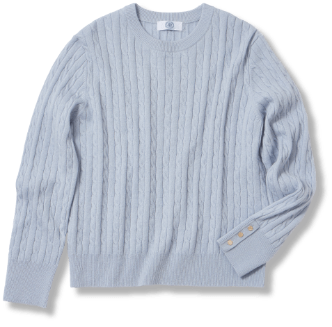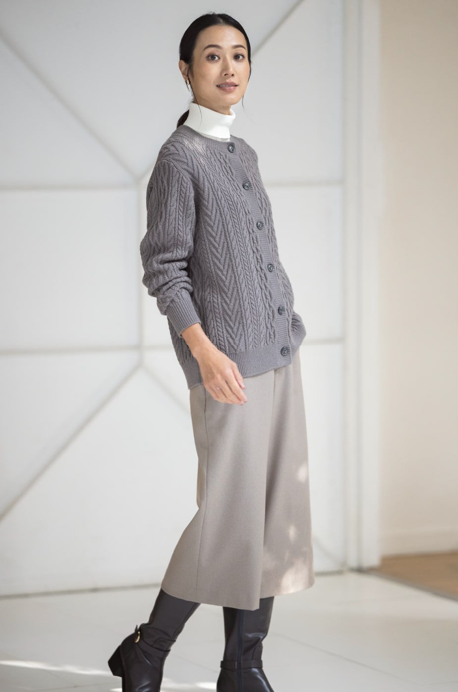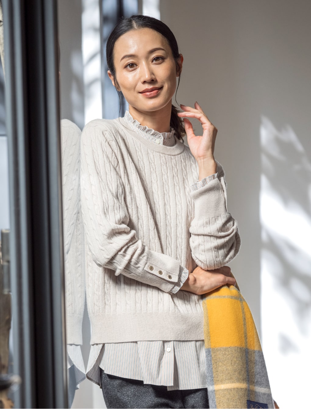 軽く柔らかい手触りが特徴のエクストラファインメリノを使用。少しゆとりのあるサイズ感がボディラインを拾いにくく、程良くトラッドな気分を取り入れられるケーブルニット。