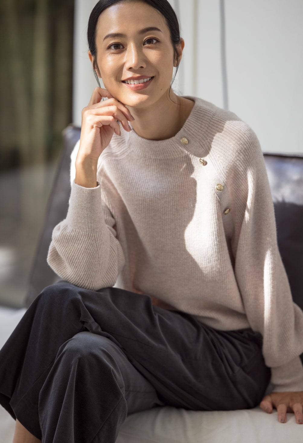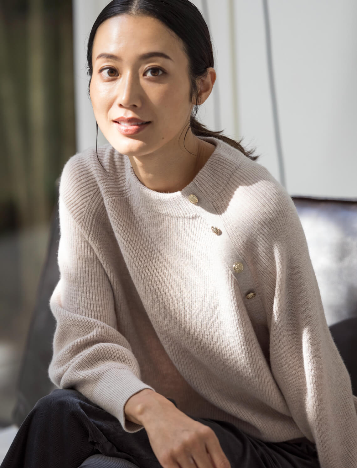 エクストラファインメリノをベースに、カシミヤをブレンドしソフトで柔らかい膨らみを実現。長く愛用していただけるシンプルなデザイン、合わせるアイテムによって表情が変わる一枚。