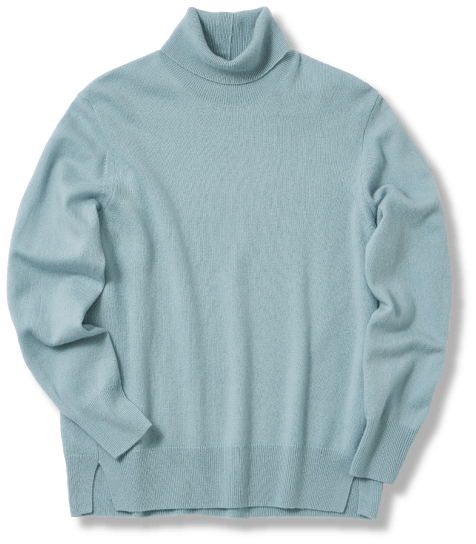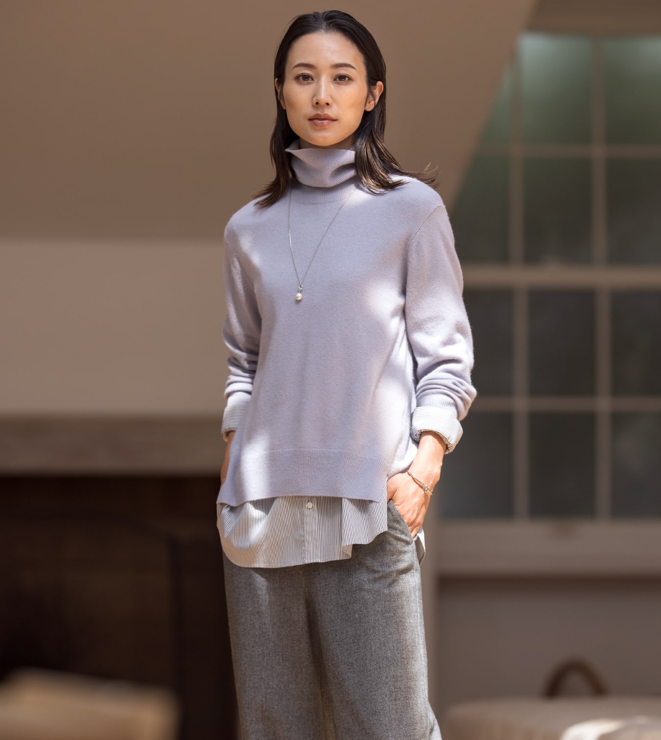 冬のコーディネートに欠かせない、着回し力のあるタートルネック。身体につき過ぎないサイズ感と、腰回りをカバーする着丈できれいに着こなせるアイテム。