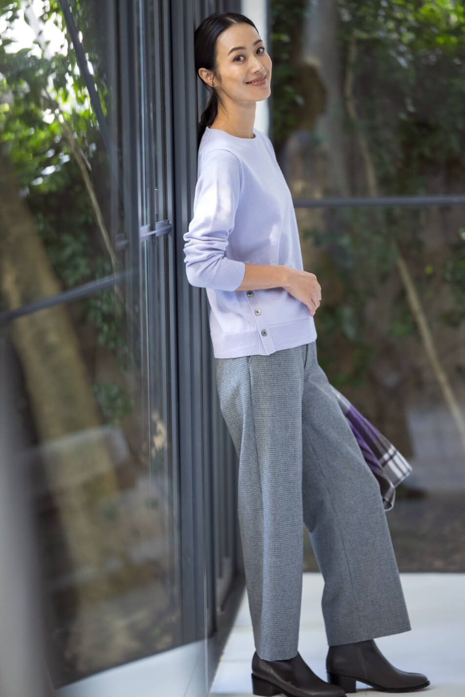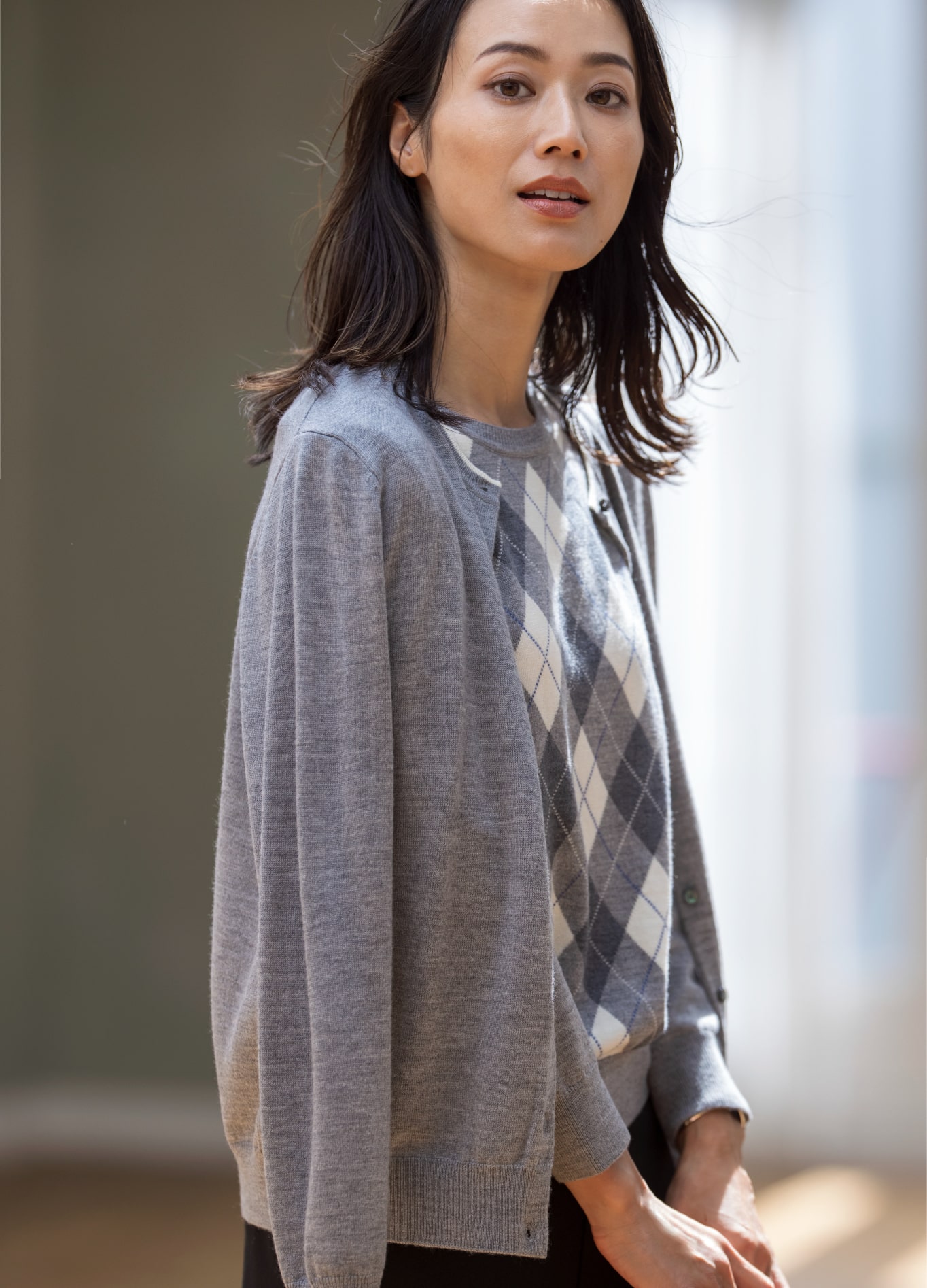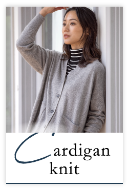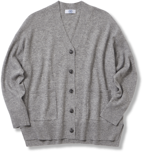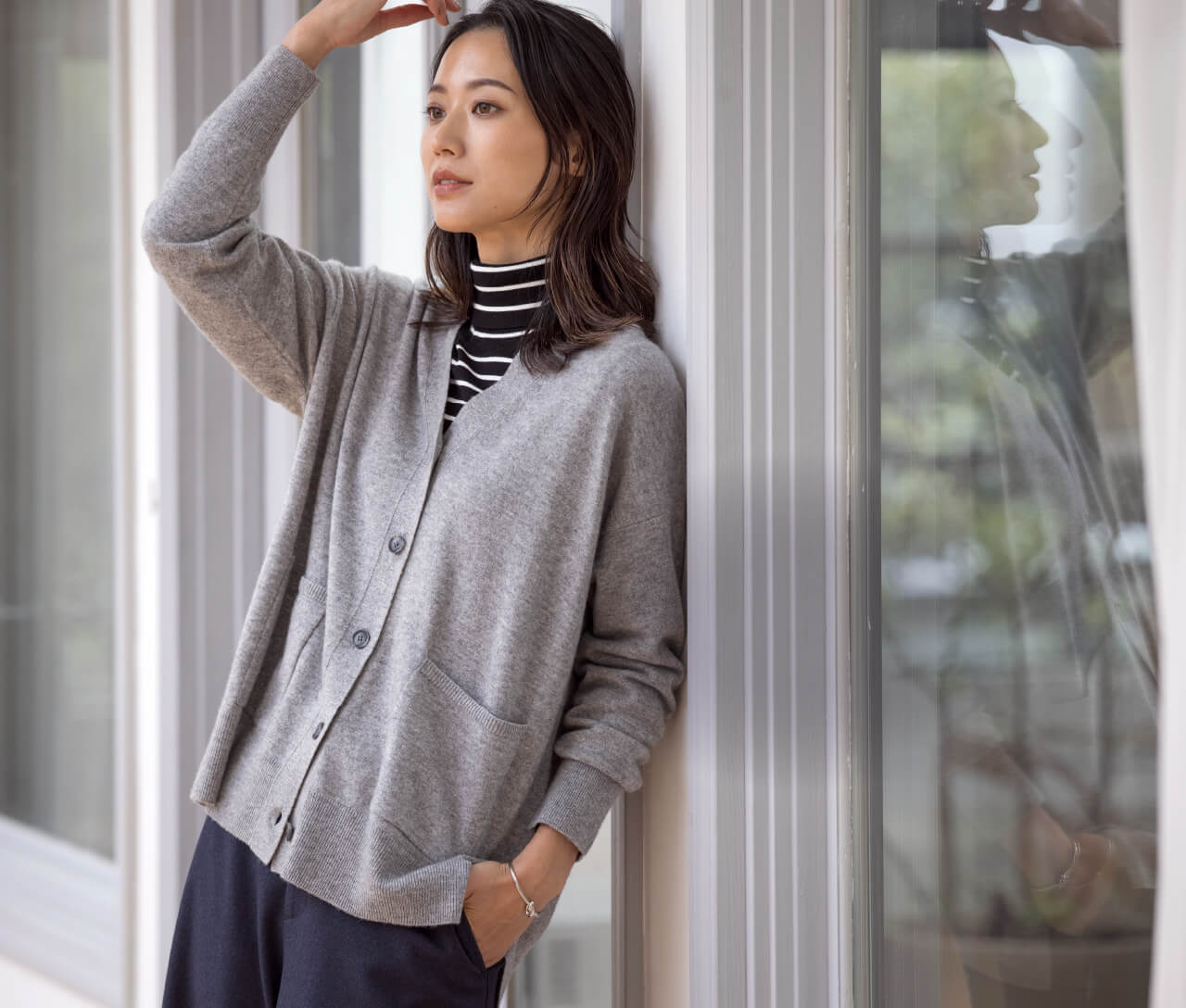 羽織るだけでサマになり、早い時期から軽いアウター感覚で着用できるカーディガン。開き過ぎないVネックラインが上品で、釦を留めてプルオーバー風の着こなしも楽しめる。
