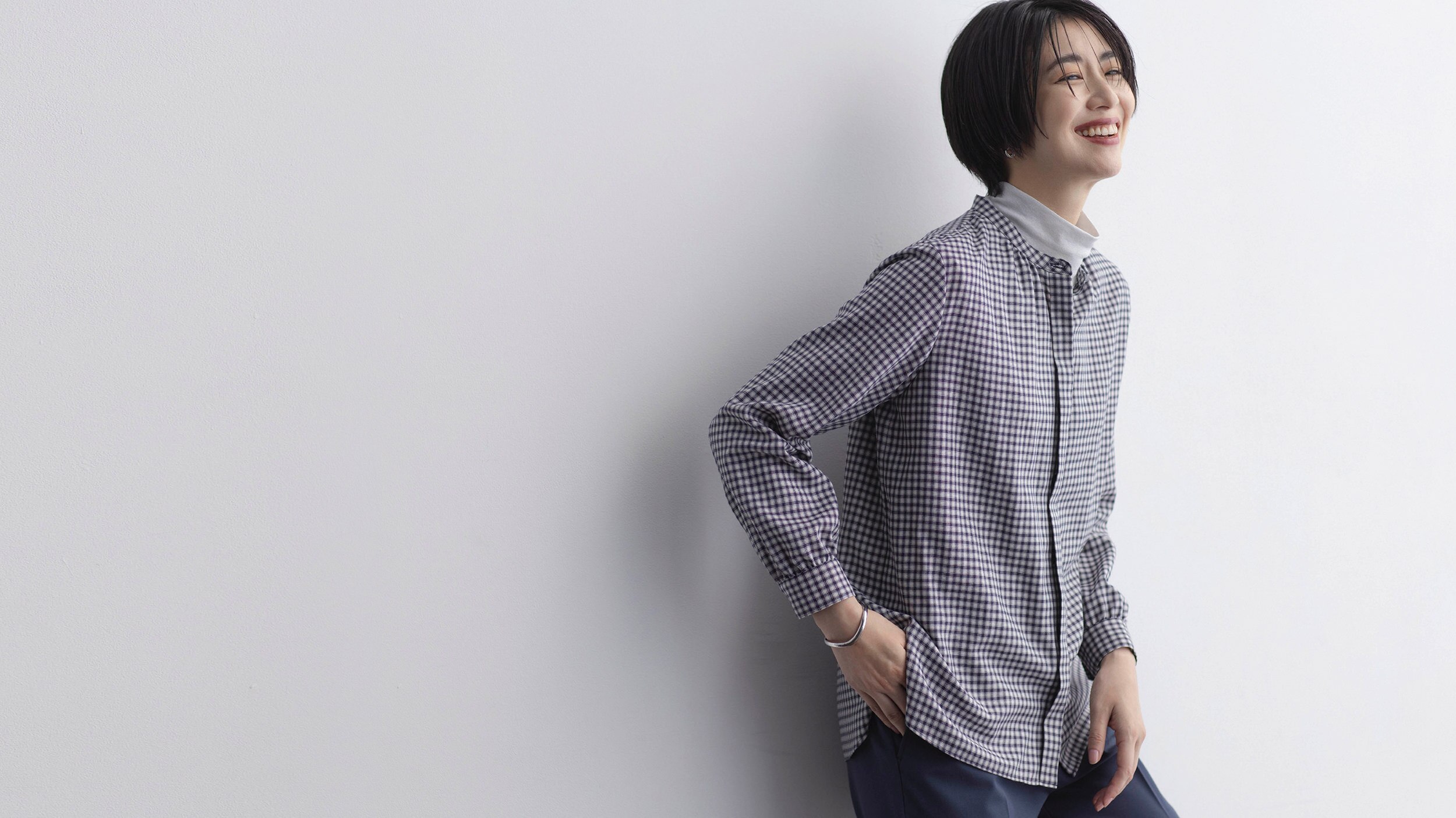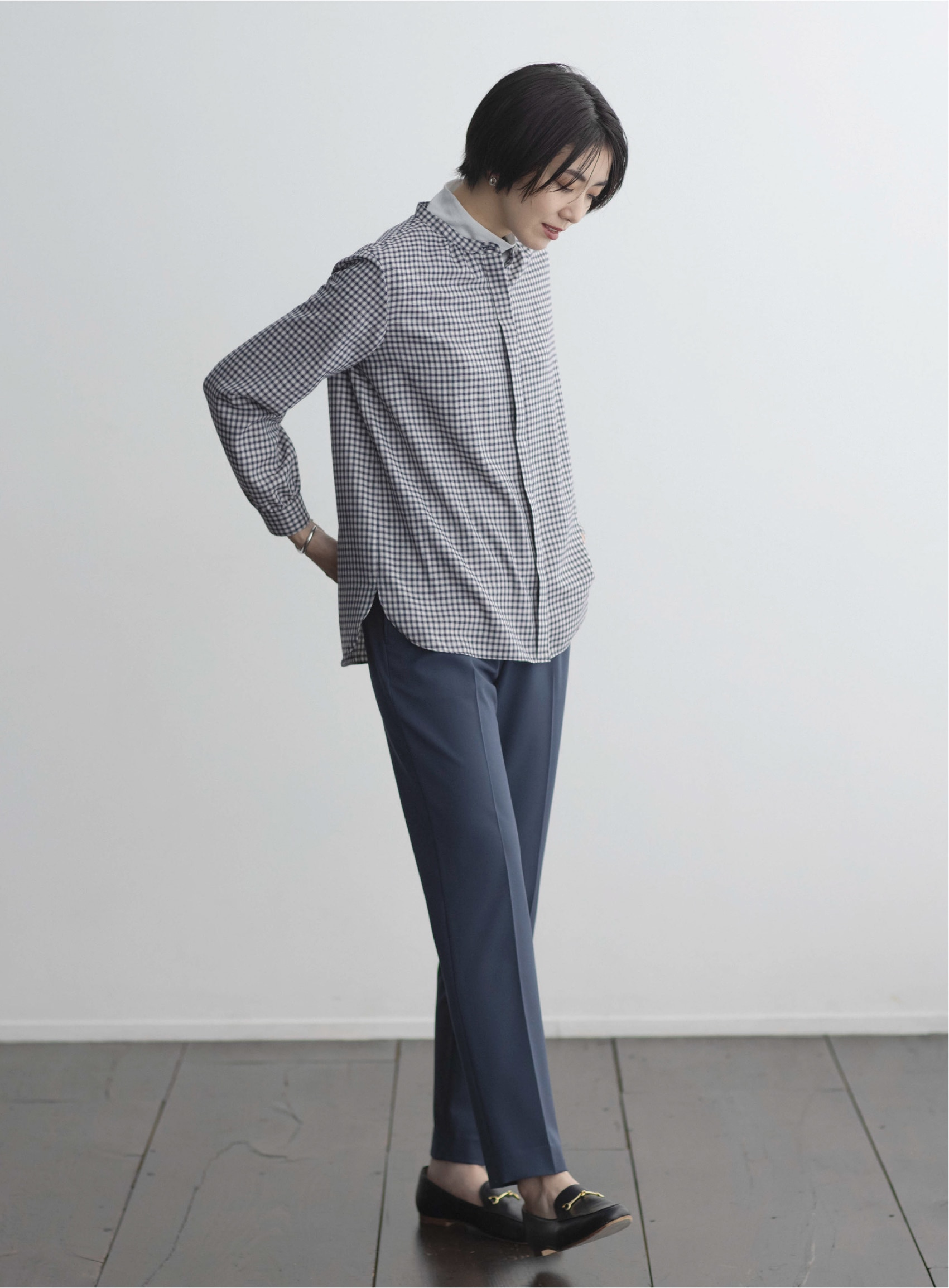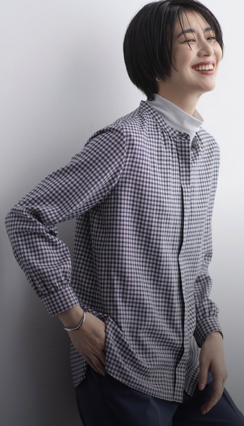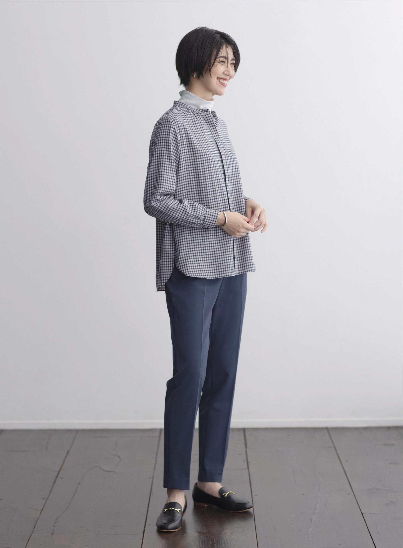 秋にぴったりの柔らかで上品な質感のブラウス。トラッドなブロックチェック柄を、ほんのりシャイニーなタートルネックで合わせて、鮮度を上げたこなれスタイルに。