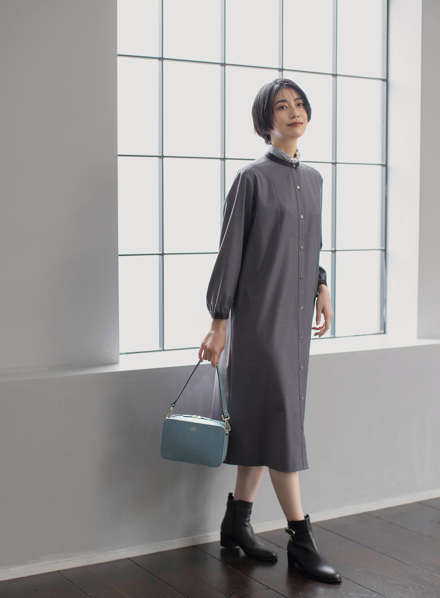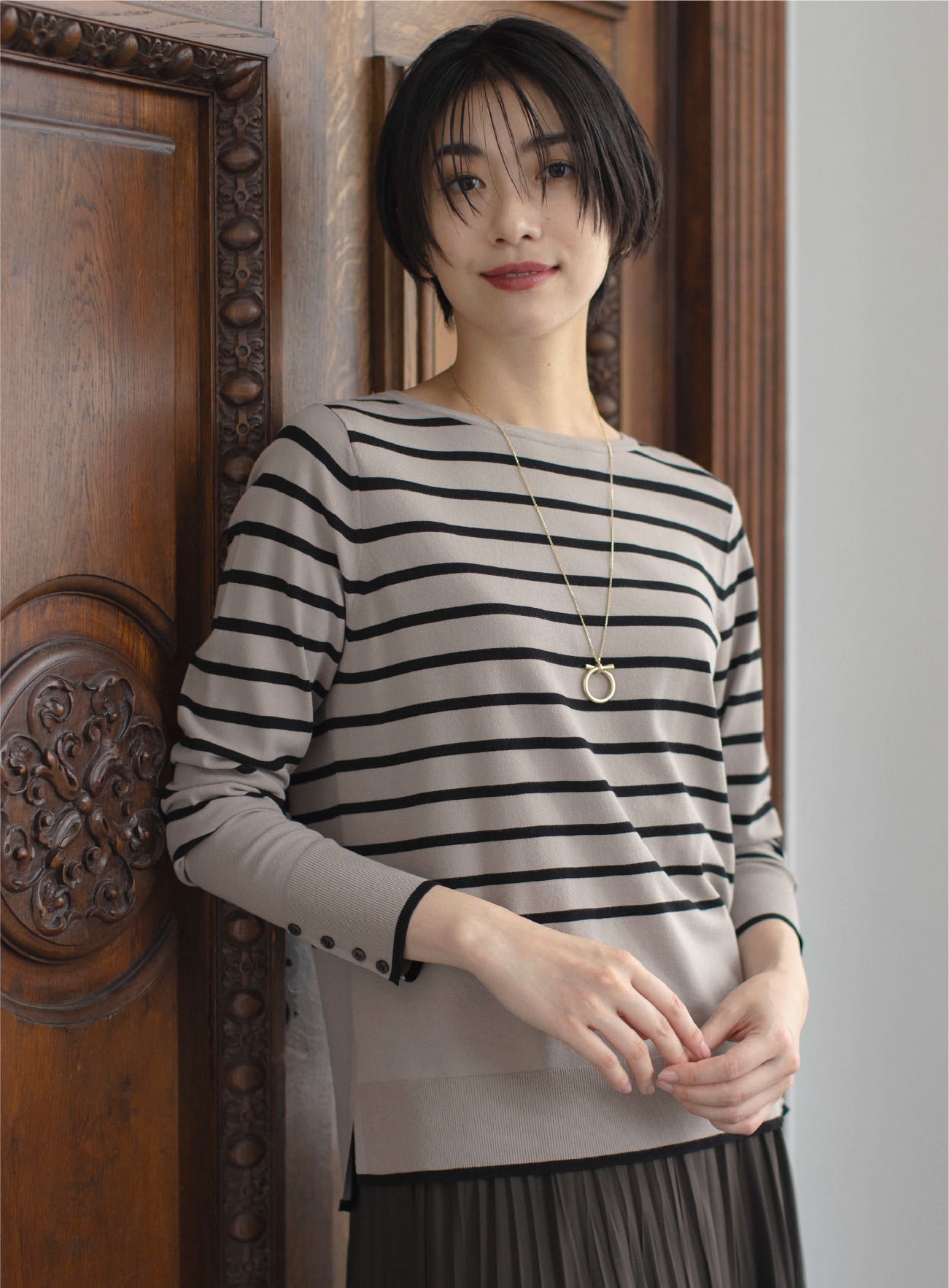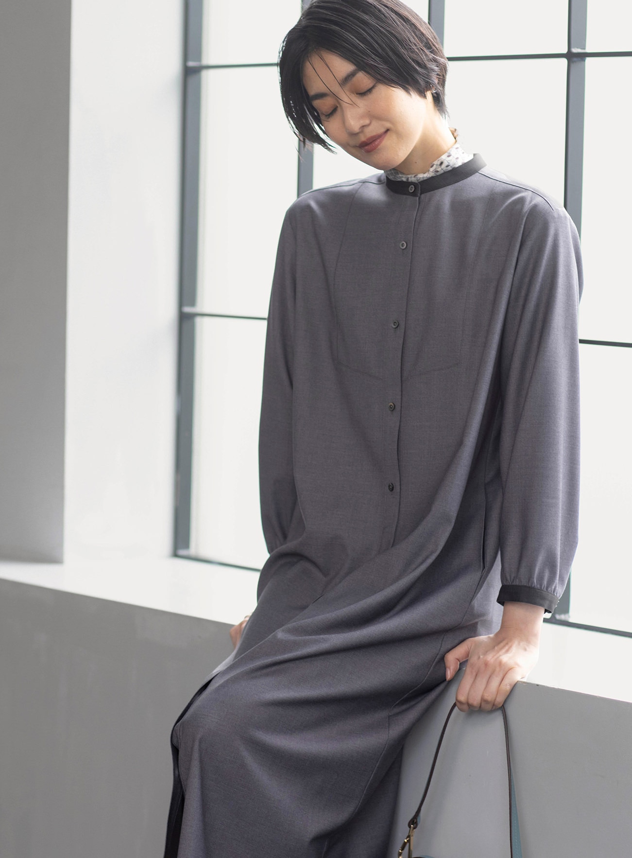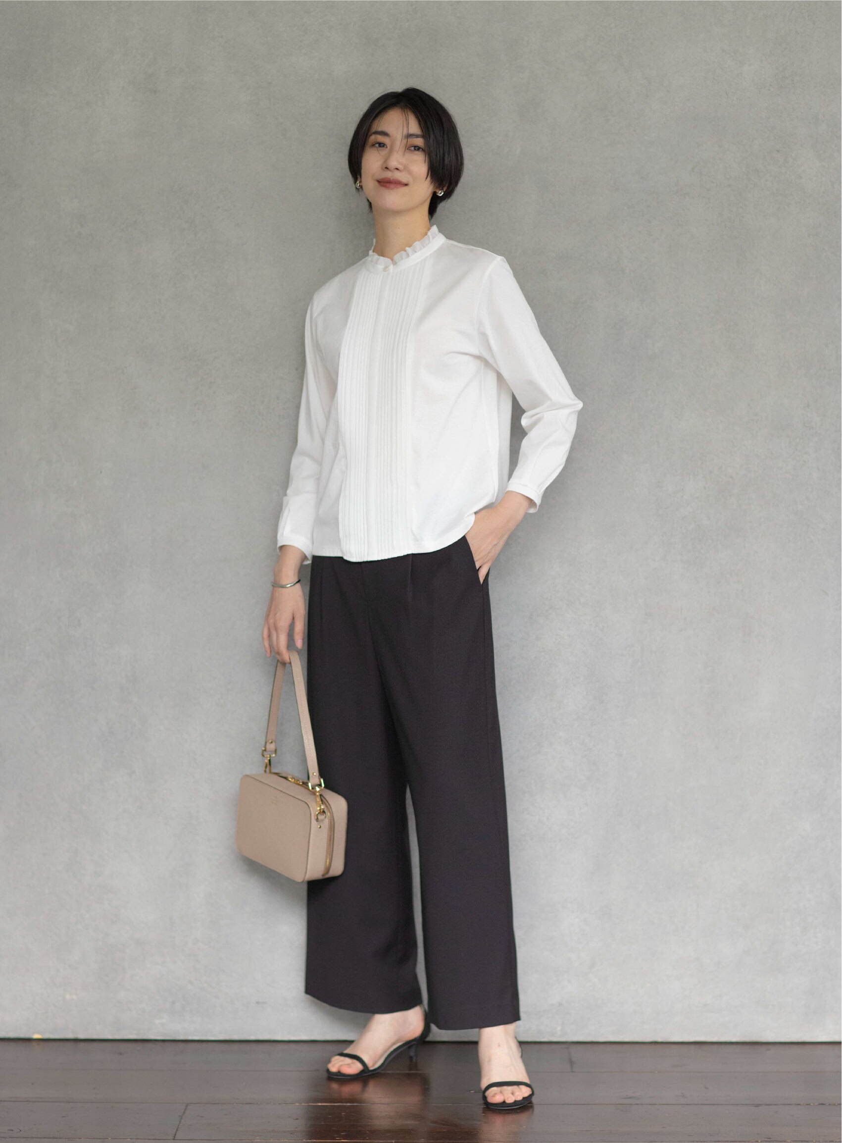 潔いモノトーンスタイル。快適な着心地のジャージーカットソーは、フリルカラーとフロントタックが程よいエレガンスさを引き立て、秋のムードを高めてくれる。