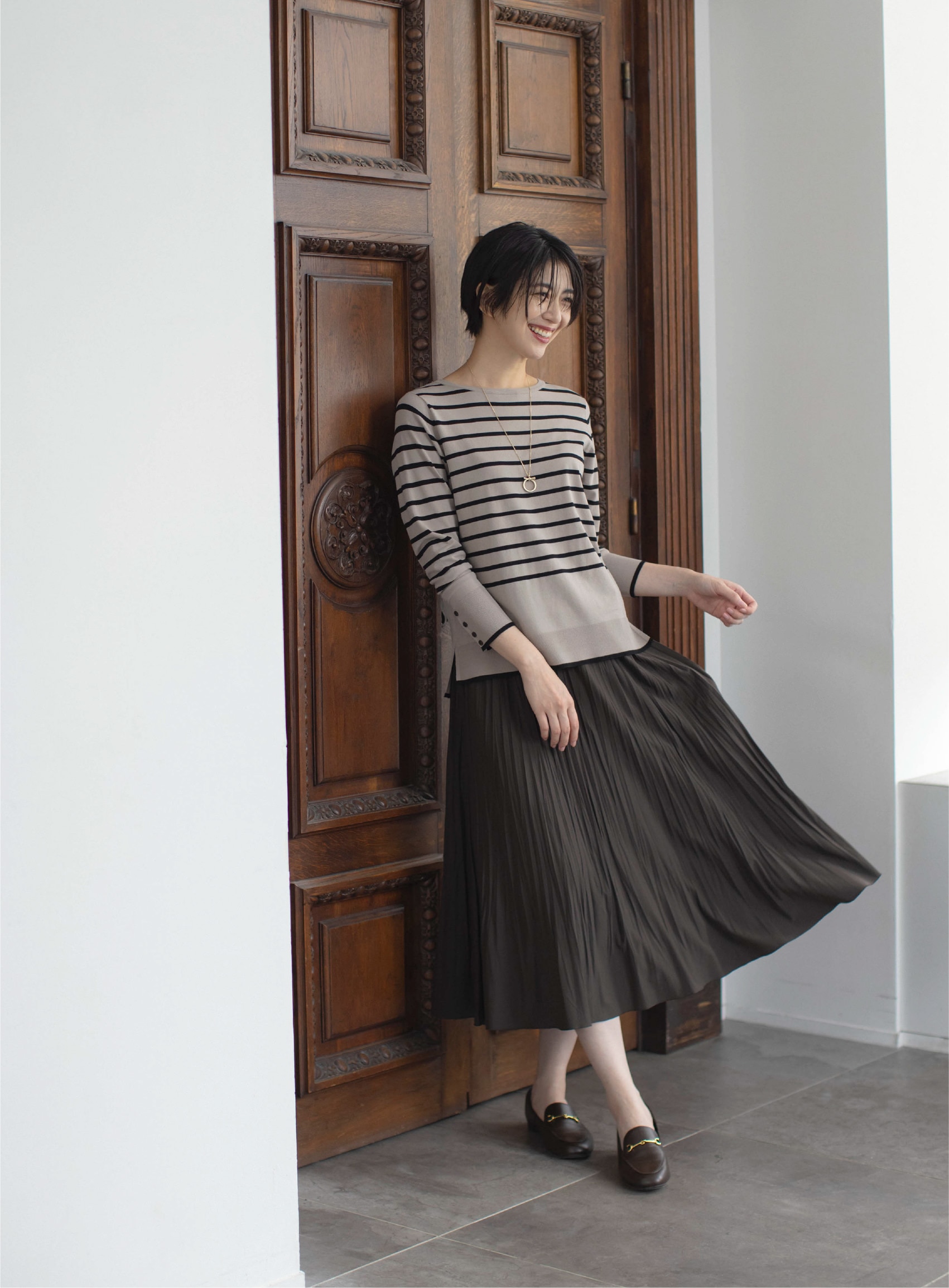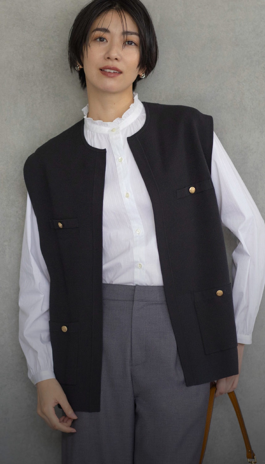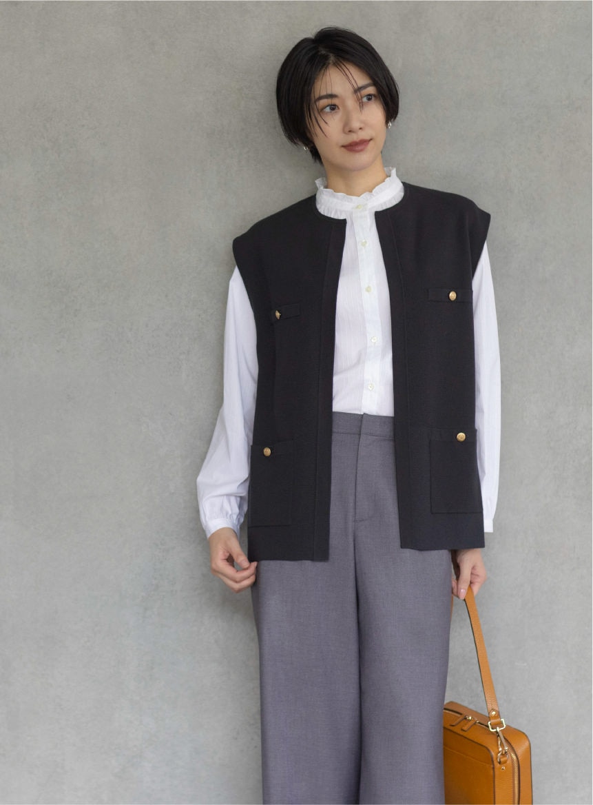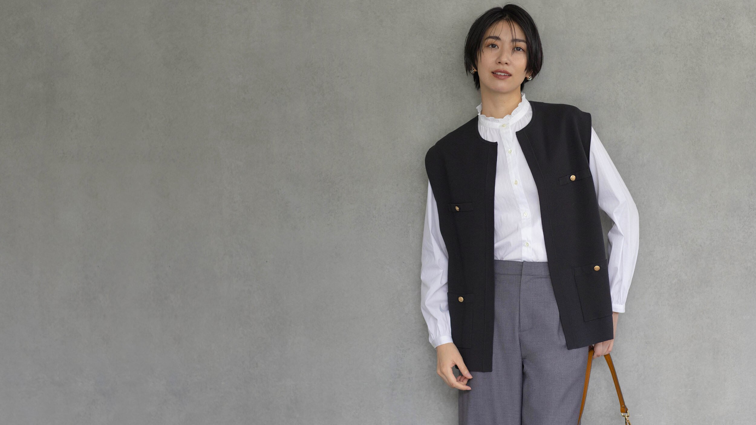 上品シックな佇まいのニットジレベストは、ホワイトブラウスを合わせてクリーンに。きちんと見えする大人のレイヤードスタイルで最旬のコーディネートへアップデート。