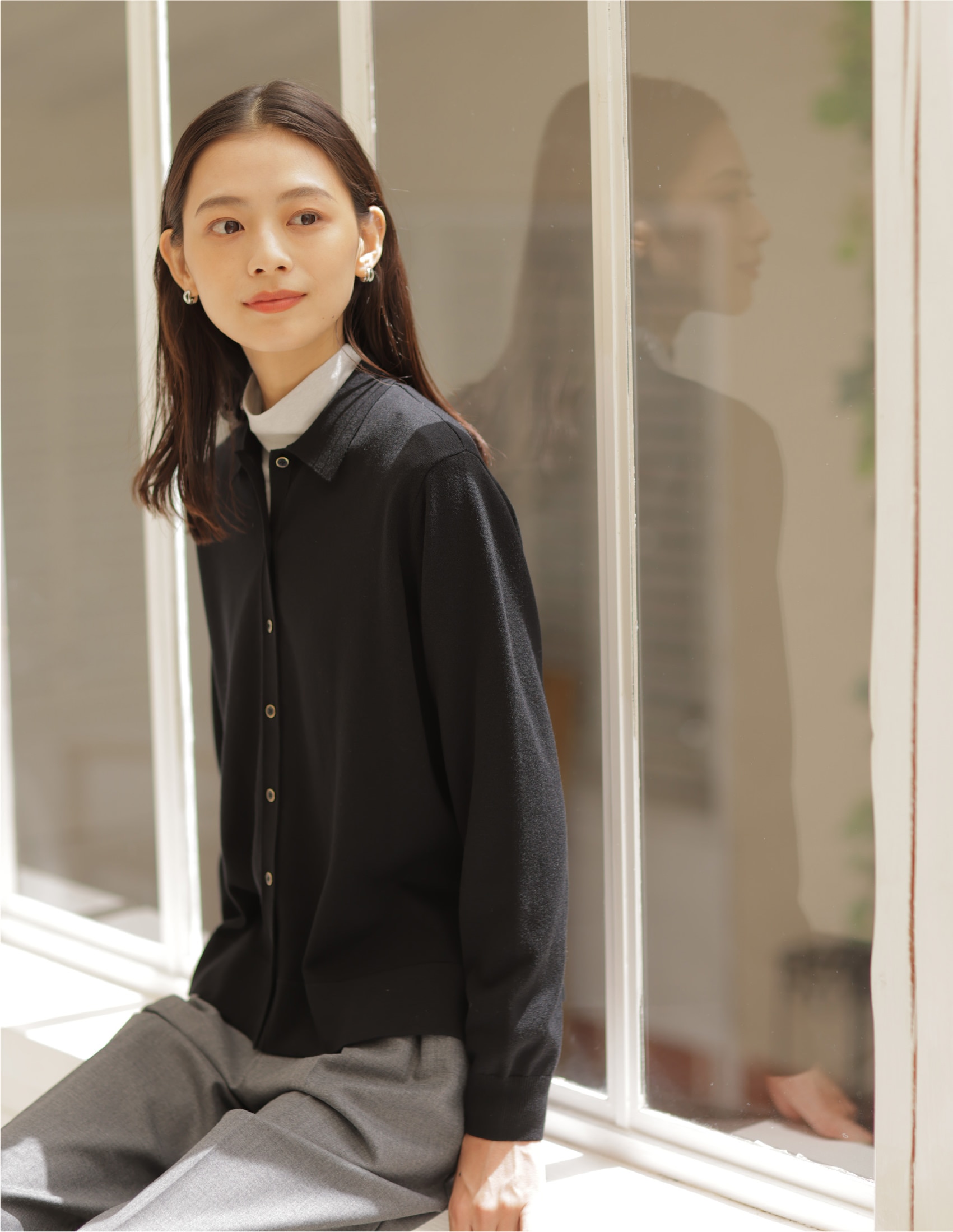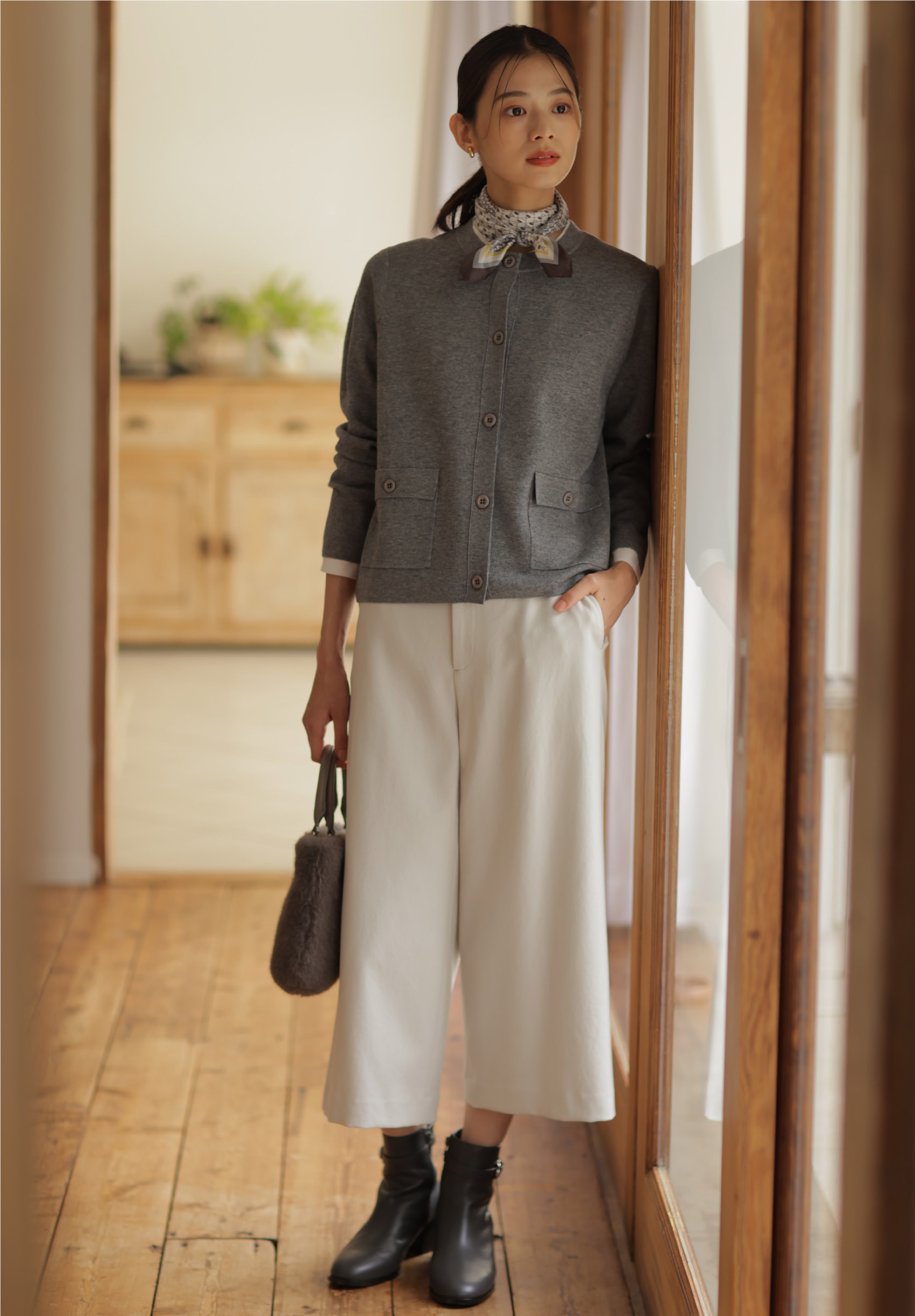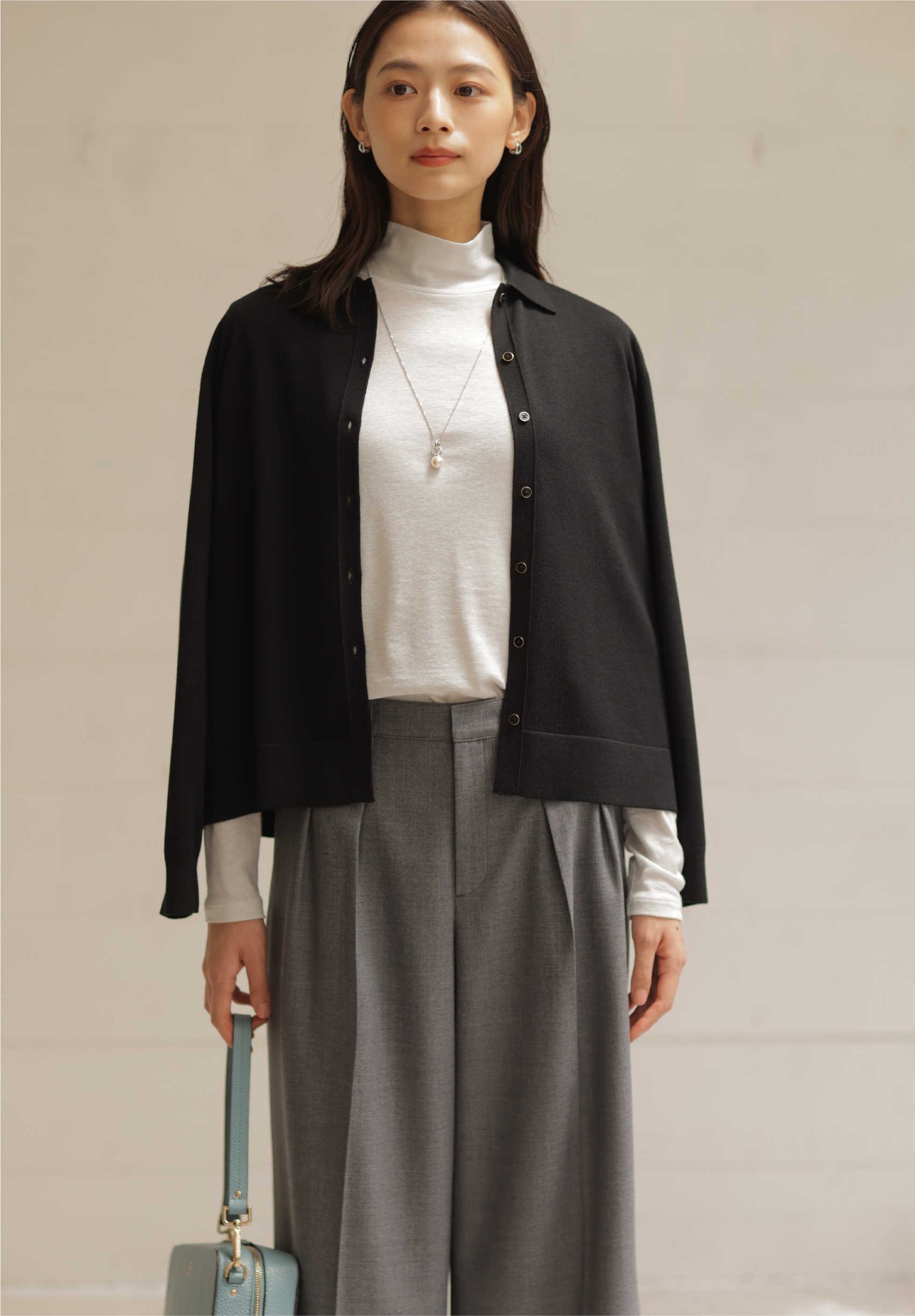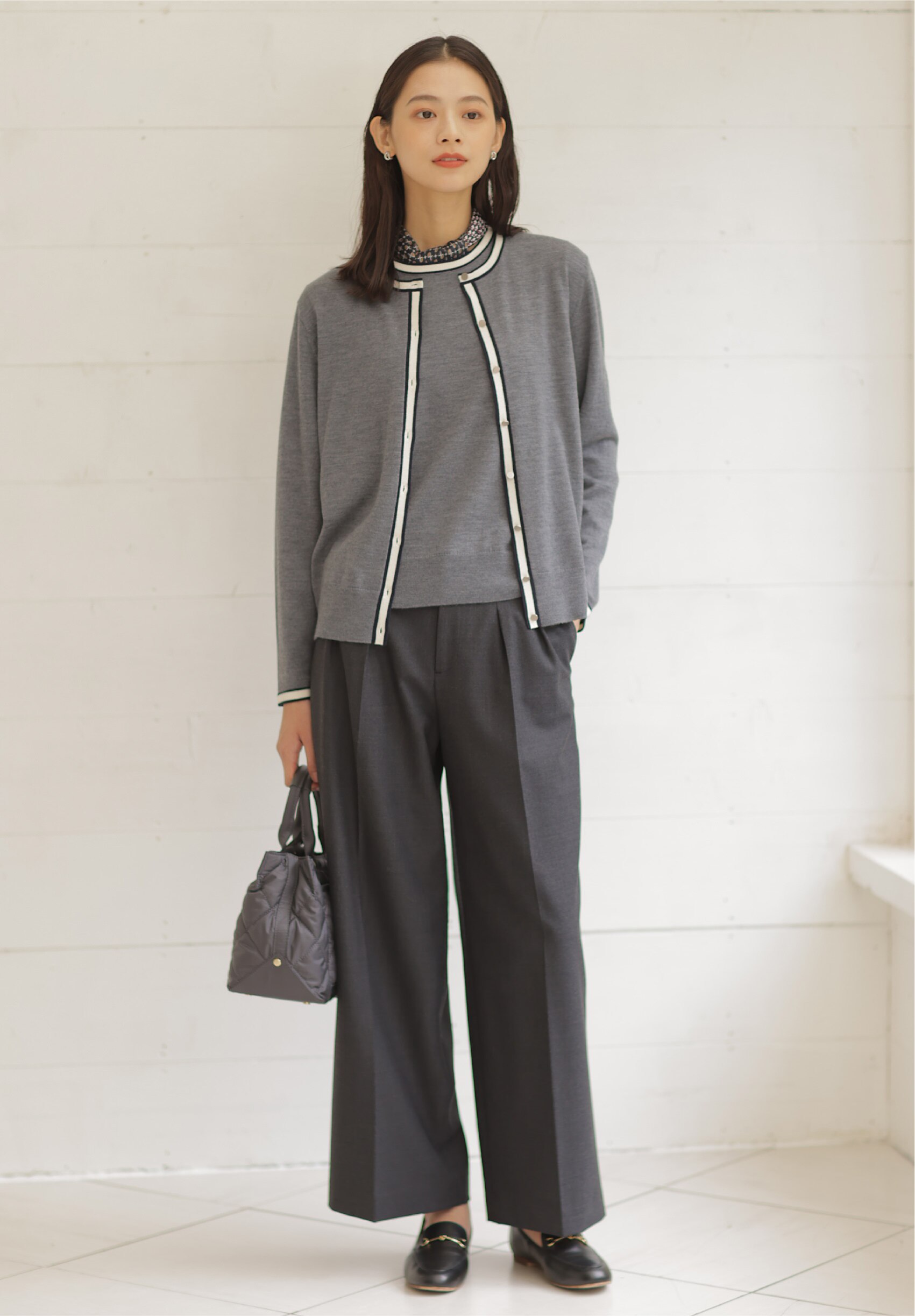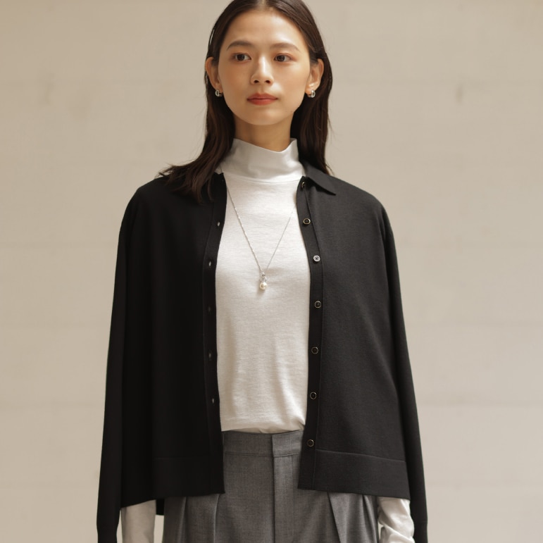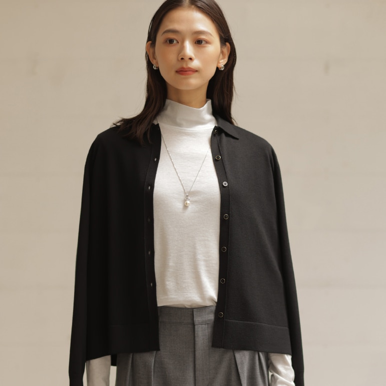 着こなしの鮮度が上がる、ポロ襟付きカーディガン。タック入りワイドパンツと合わせれば、大人が似合う旬なスタイルに。