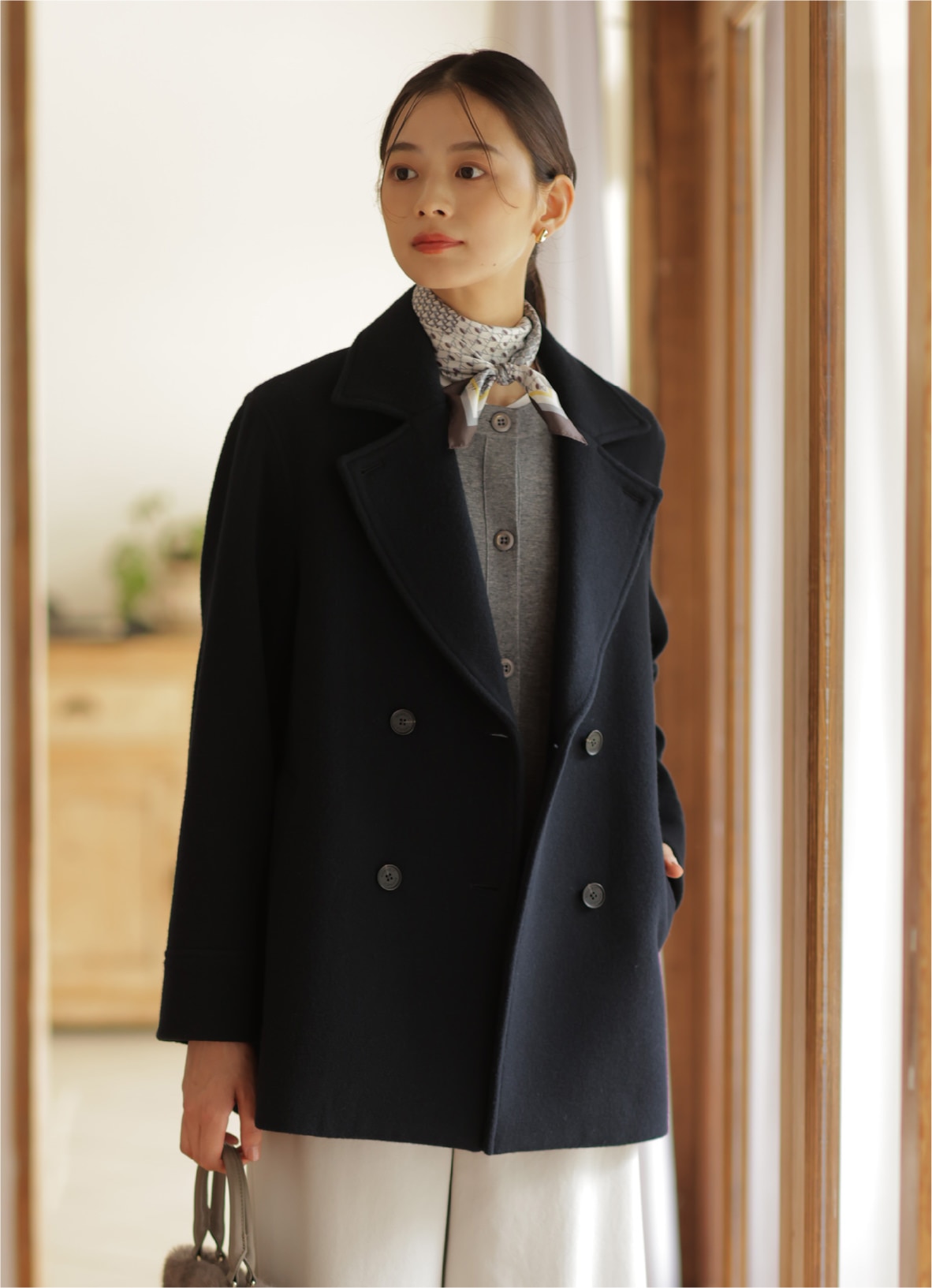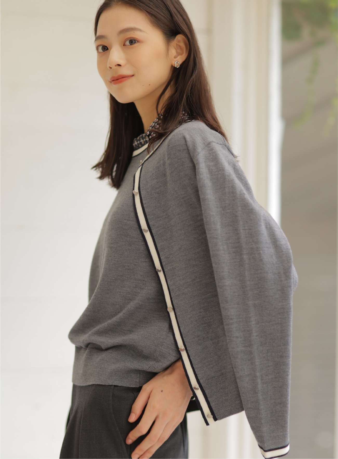 トリムの配色ラインがポイントのツインニット。シンプルに着るもよし、肩にさっとかけるだけでもサマになる、端境期に頼れる1着。