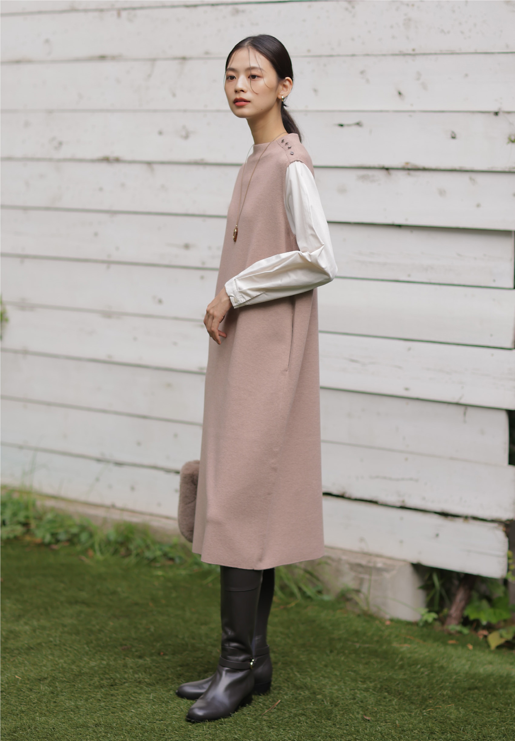 ニットとブラウスのコンビで、着心地の良さと華やかさを両立したワンピース。1枚でも着映えるのはもちろん、マフラーやブーツを加えて、秋冬らしいおしゃれを楽しめる。