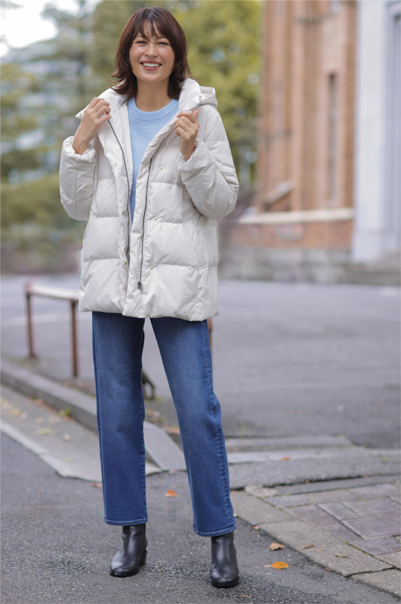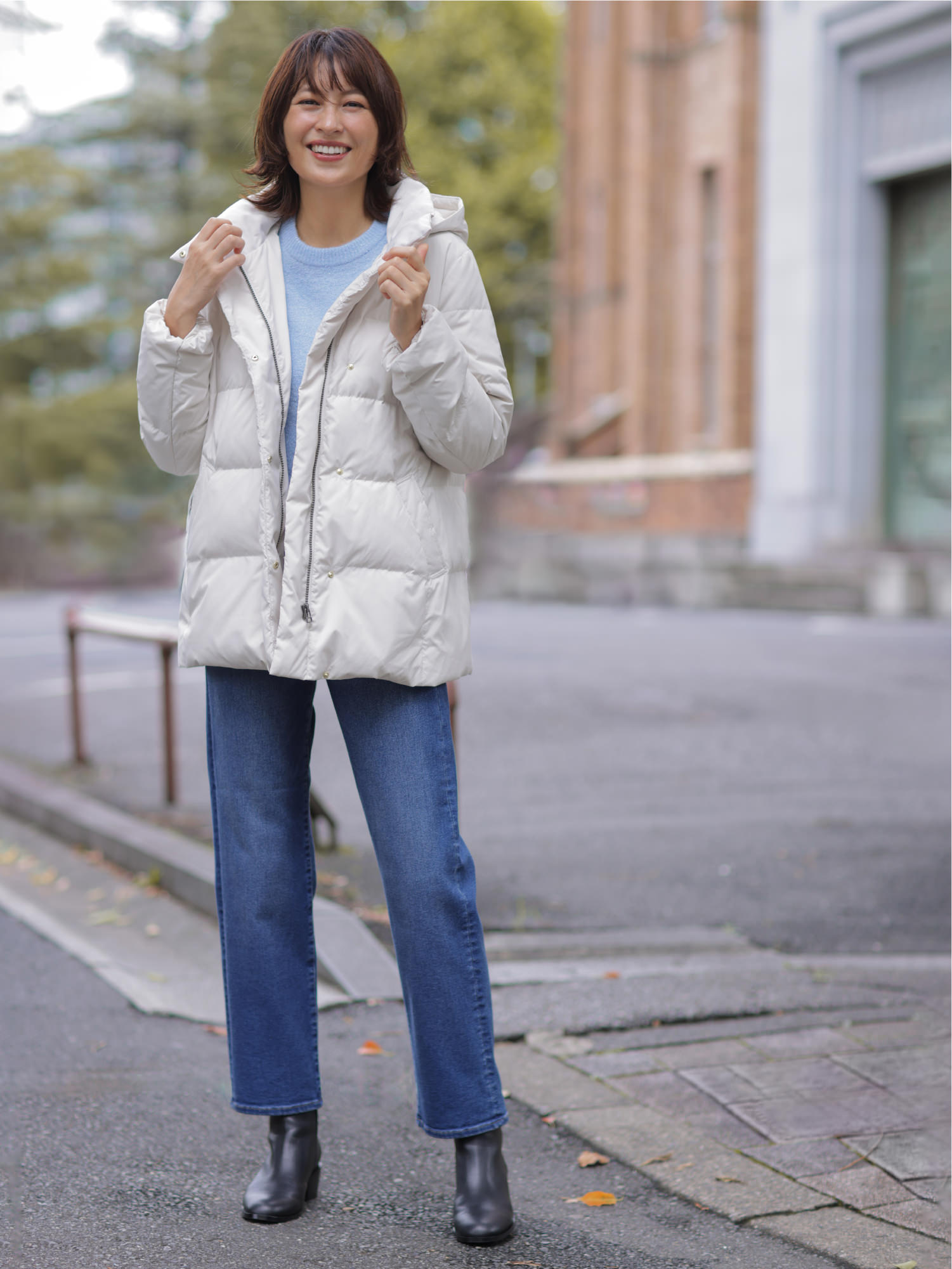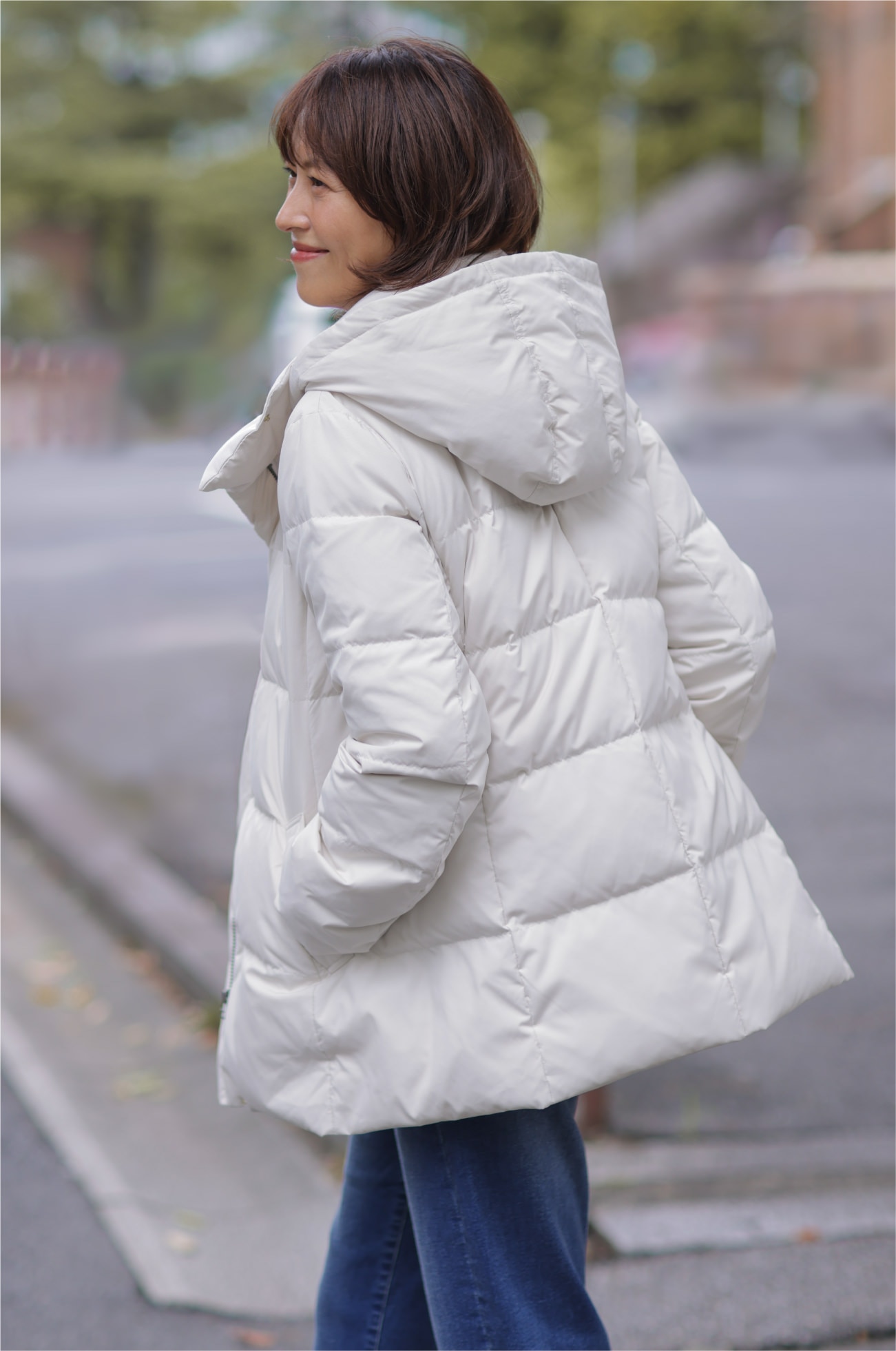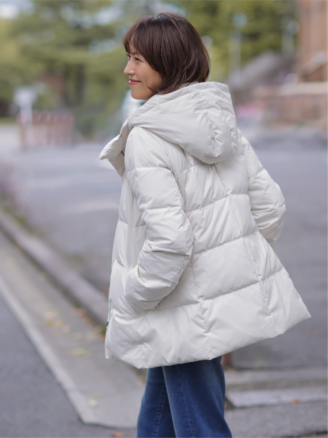 清潔感のあるアイボリーのミドル丈ダウンなら、気軽に羽織れて暖かく、足取りも軽やかに。