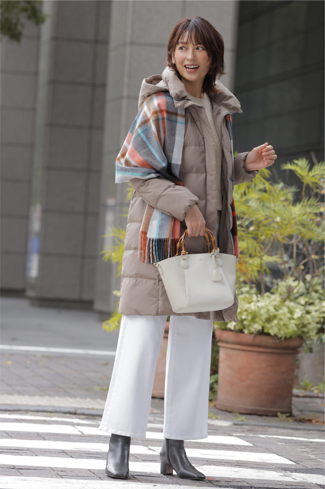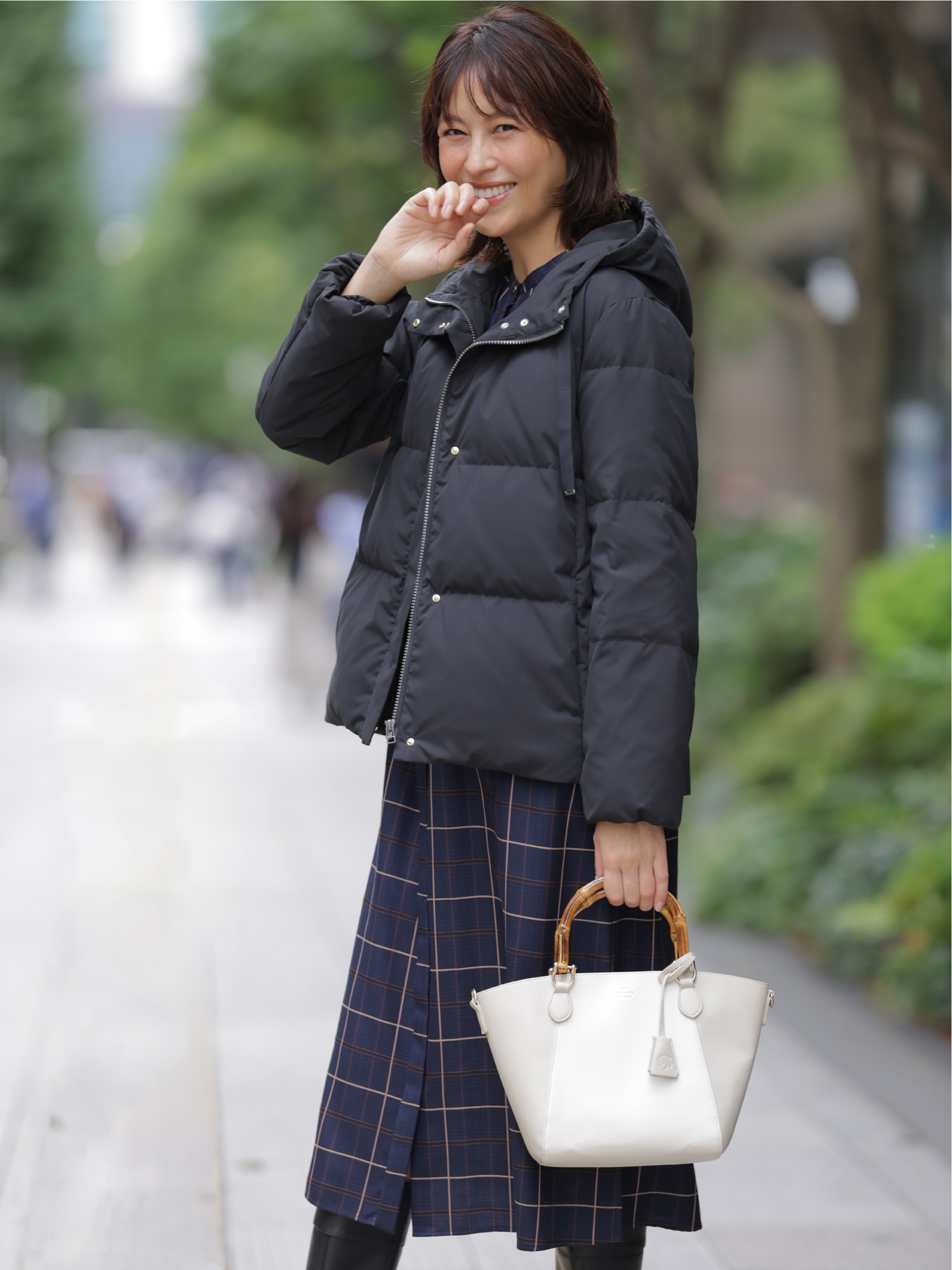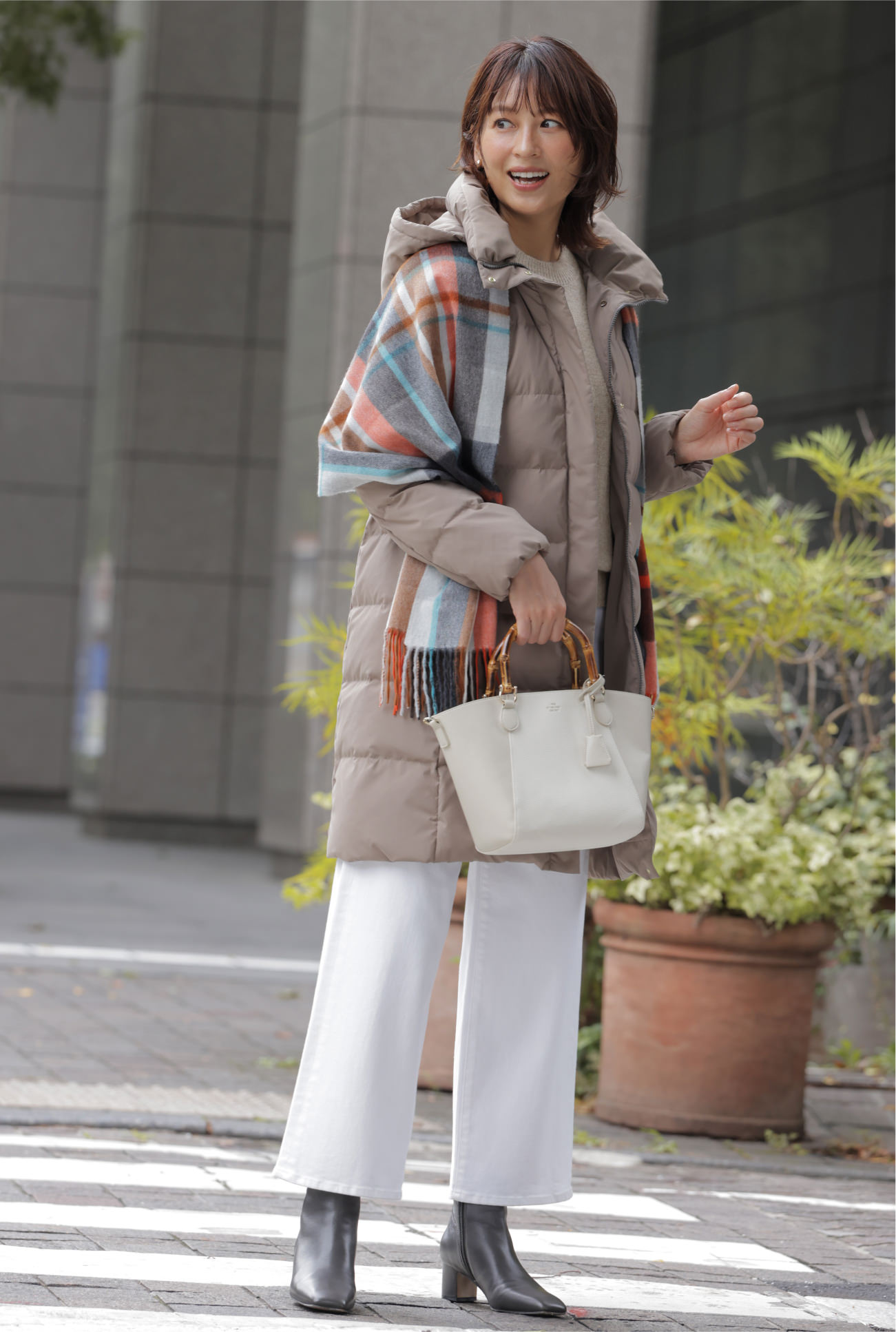 清潔感のあるアイボリーのミドル丈ダウンなら、気軽に羽織れて暖かく、足取りも軽やかに。
