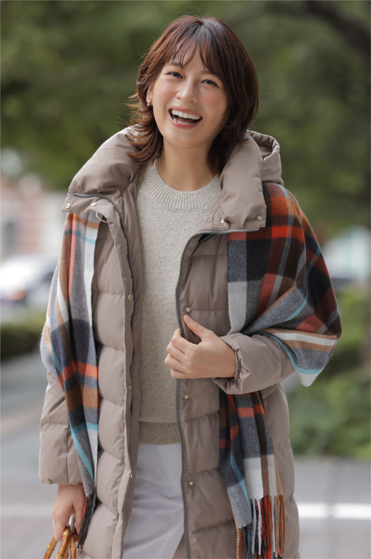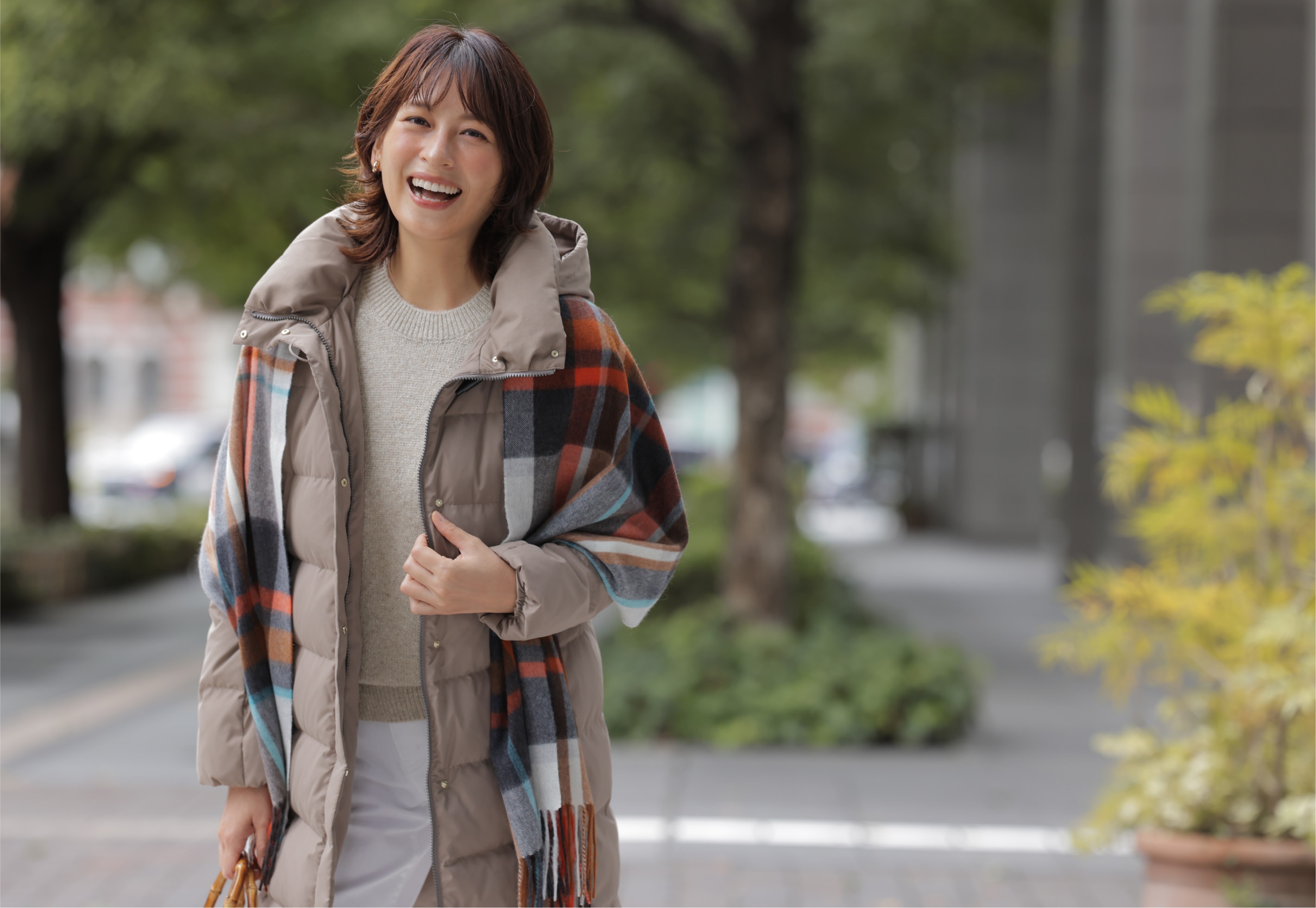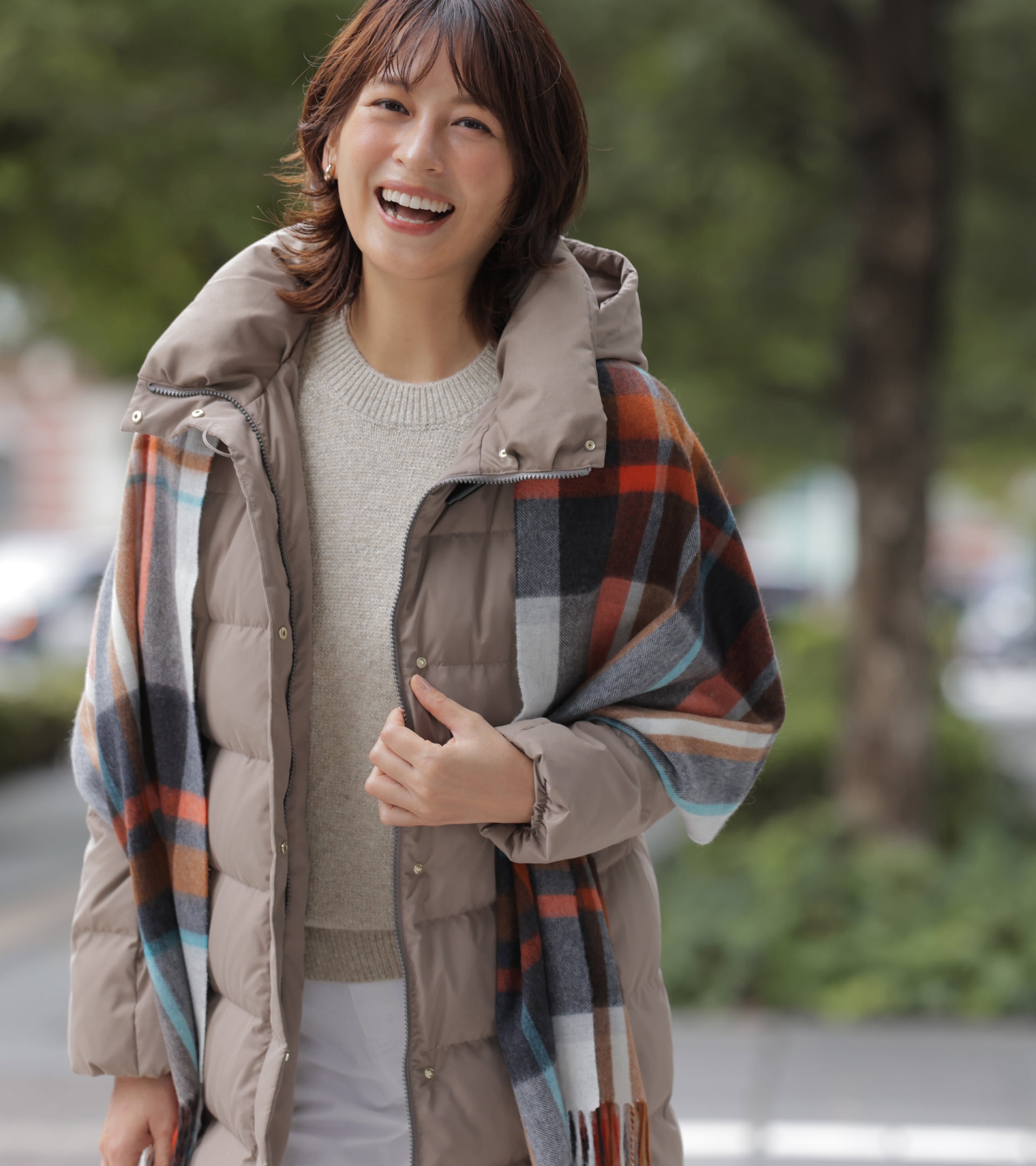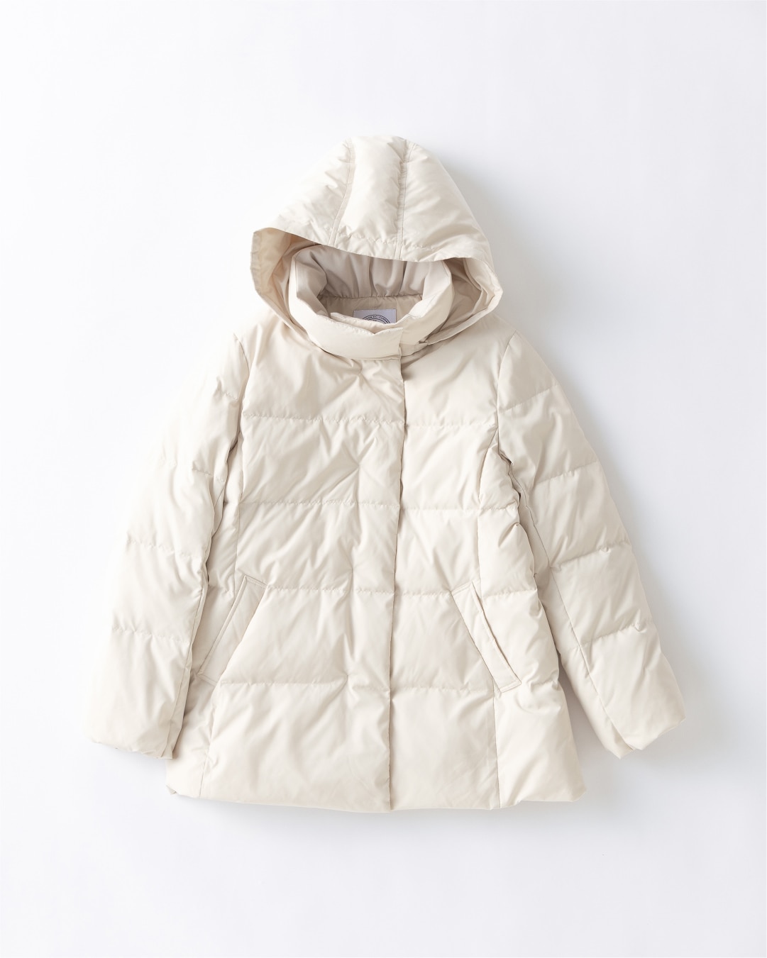 清潔感のあるアイボリーのミドル丈ダウンなら、気軽に羽織れて暖かく、足取りも軽やかに。