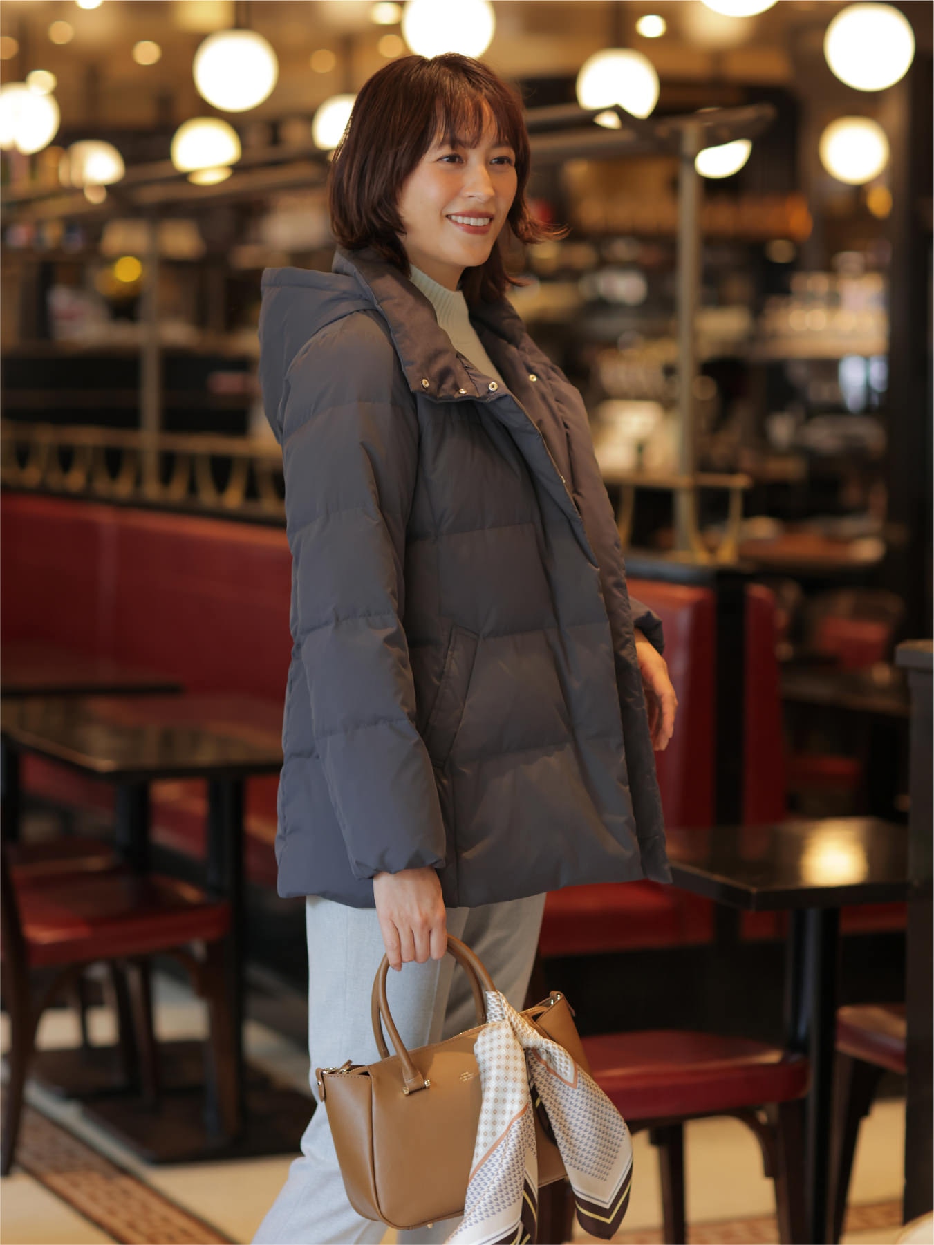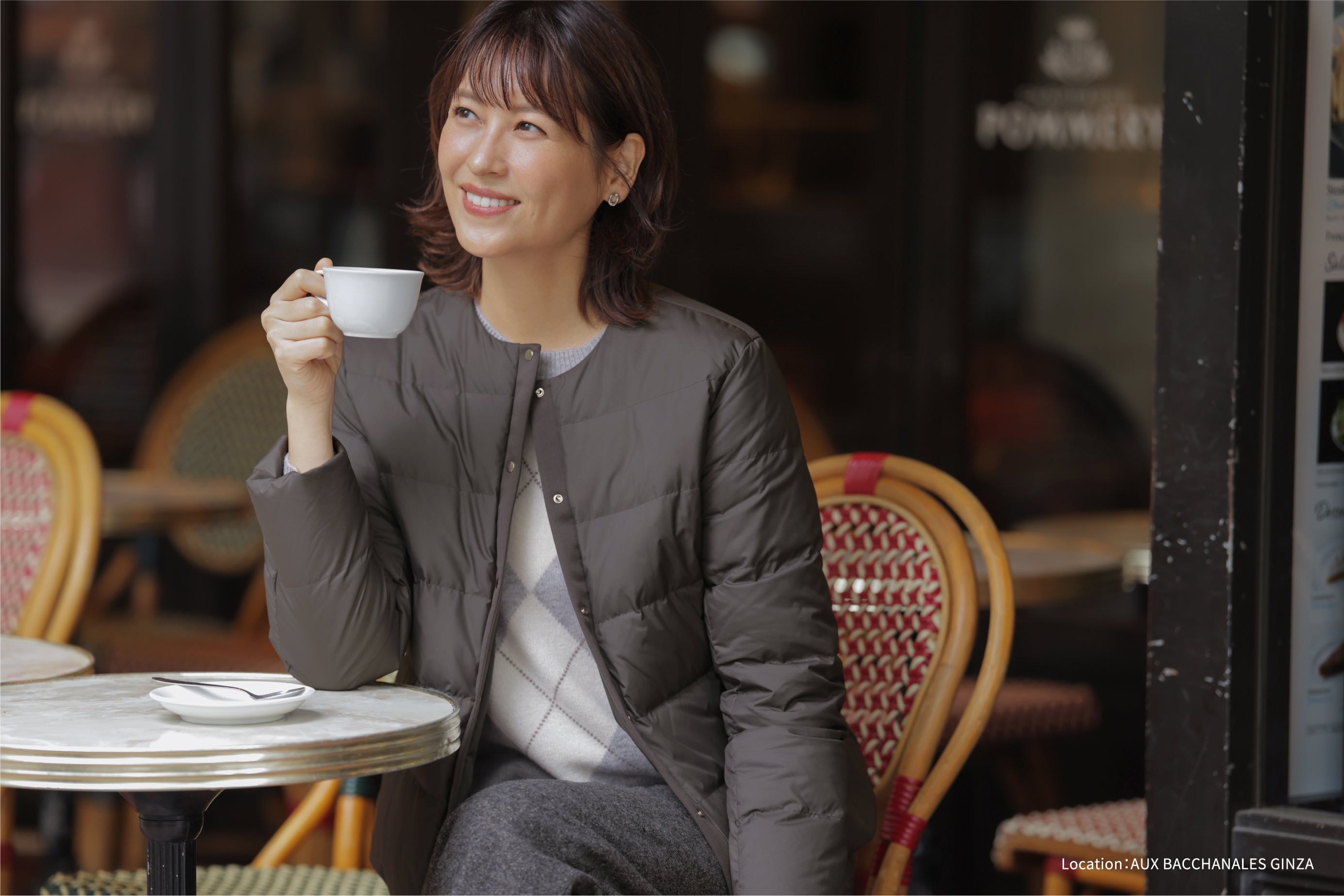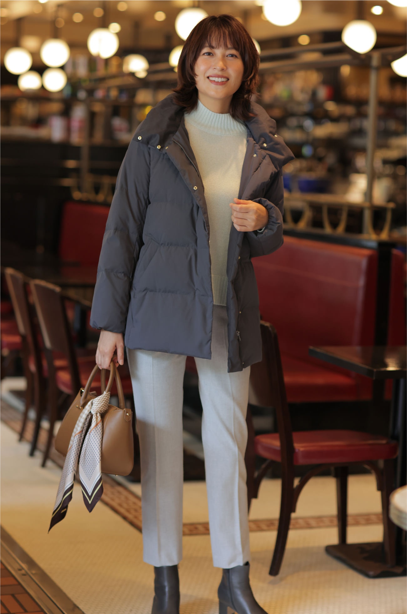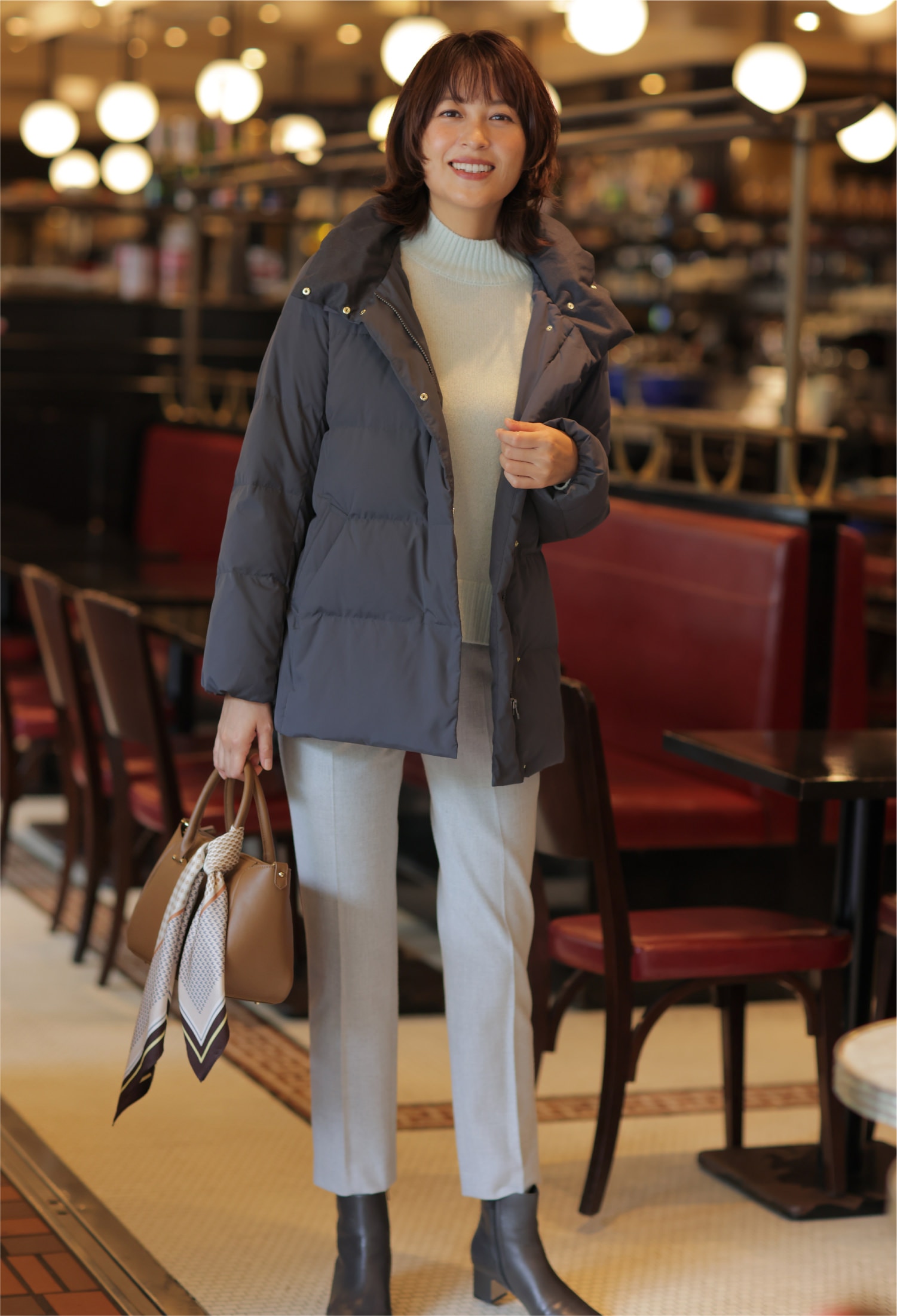 カフェでも脱ぎ着のしやすいライトダウンが活躍。