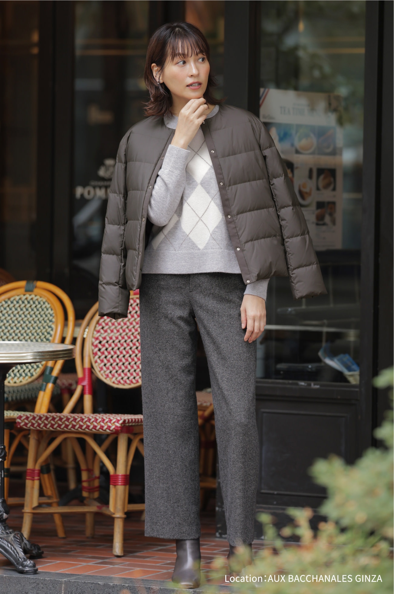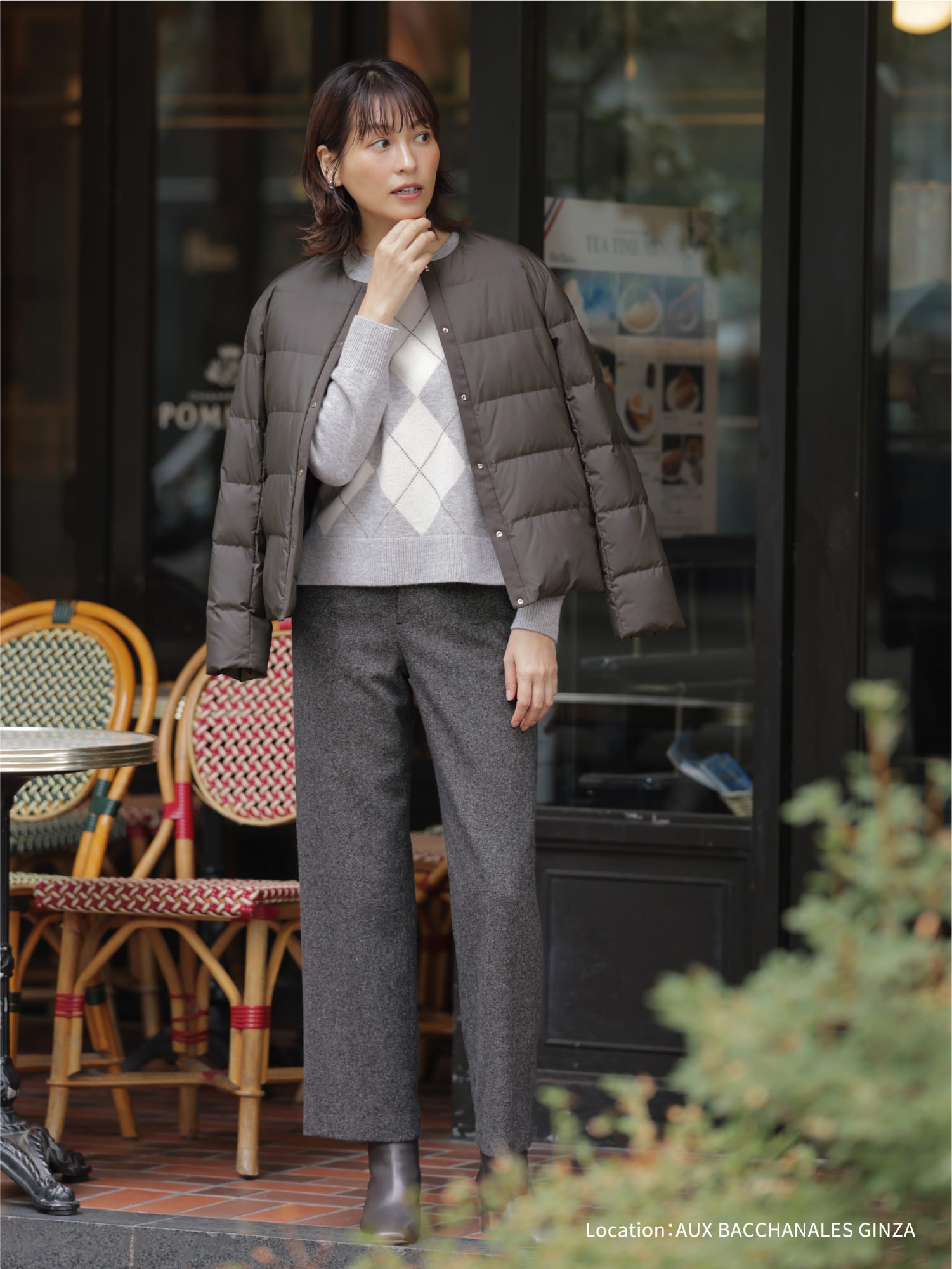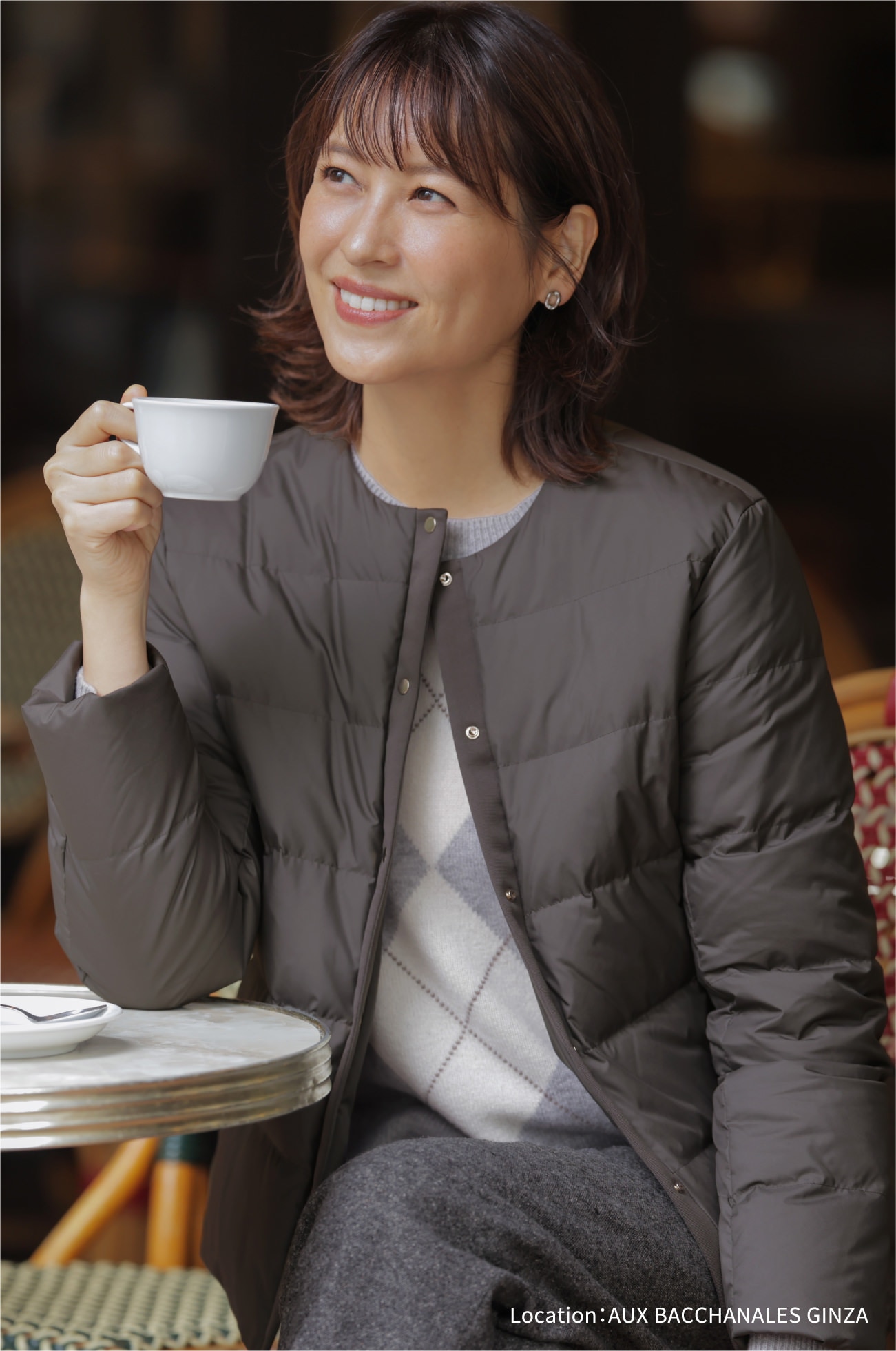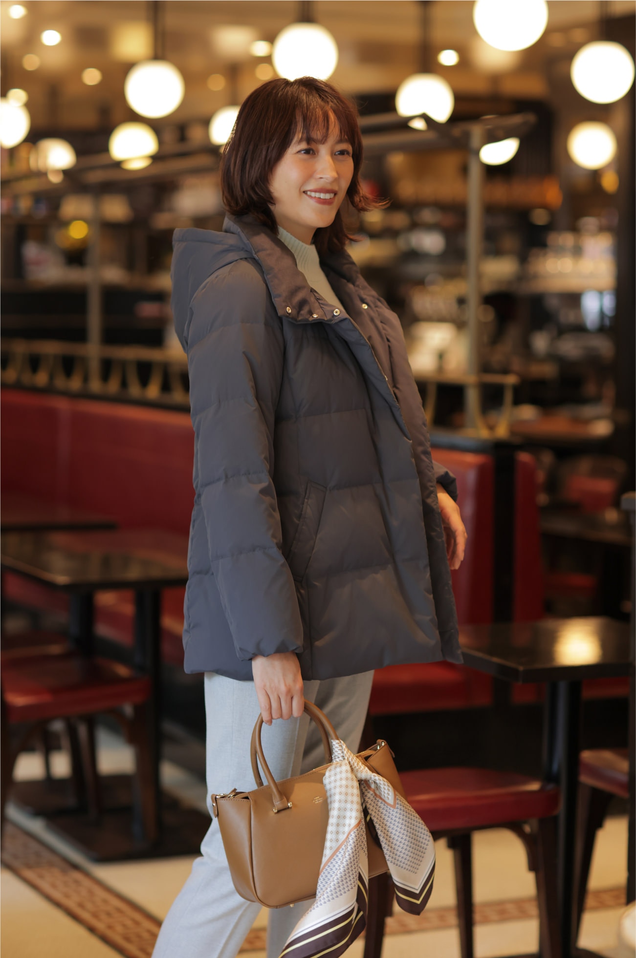 カフェでも脱ぎ着のしやすいライトダウンが活躍。