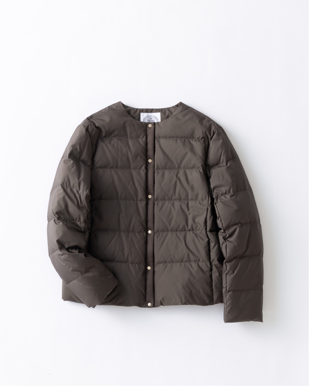 さっと気軽に羽織れるノーカラーダウン。ナチュラルな伸縮性もあり、快適な着心地。異素材使いとゴールド釦で高見えするアイテム。