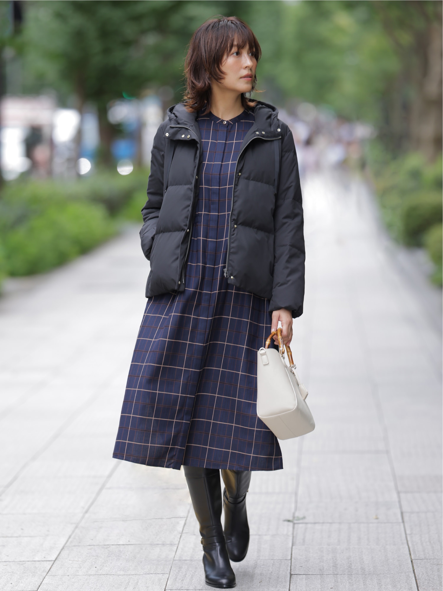 動きやすいショートダウンにチェックワンピースを合わせた、リラクシーなお買い物スタイル。