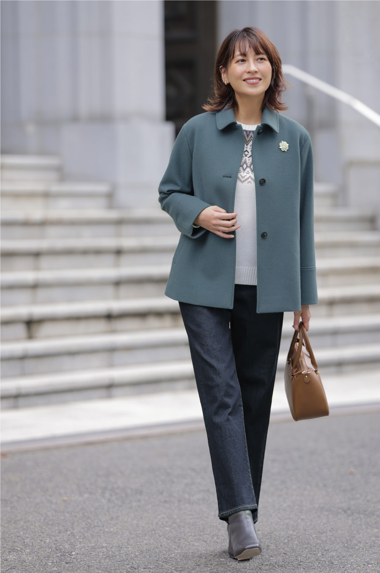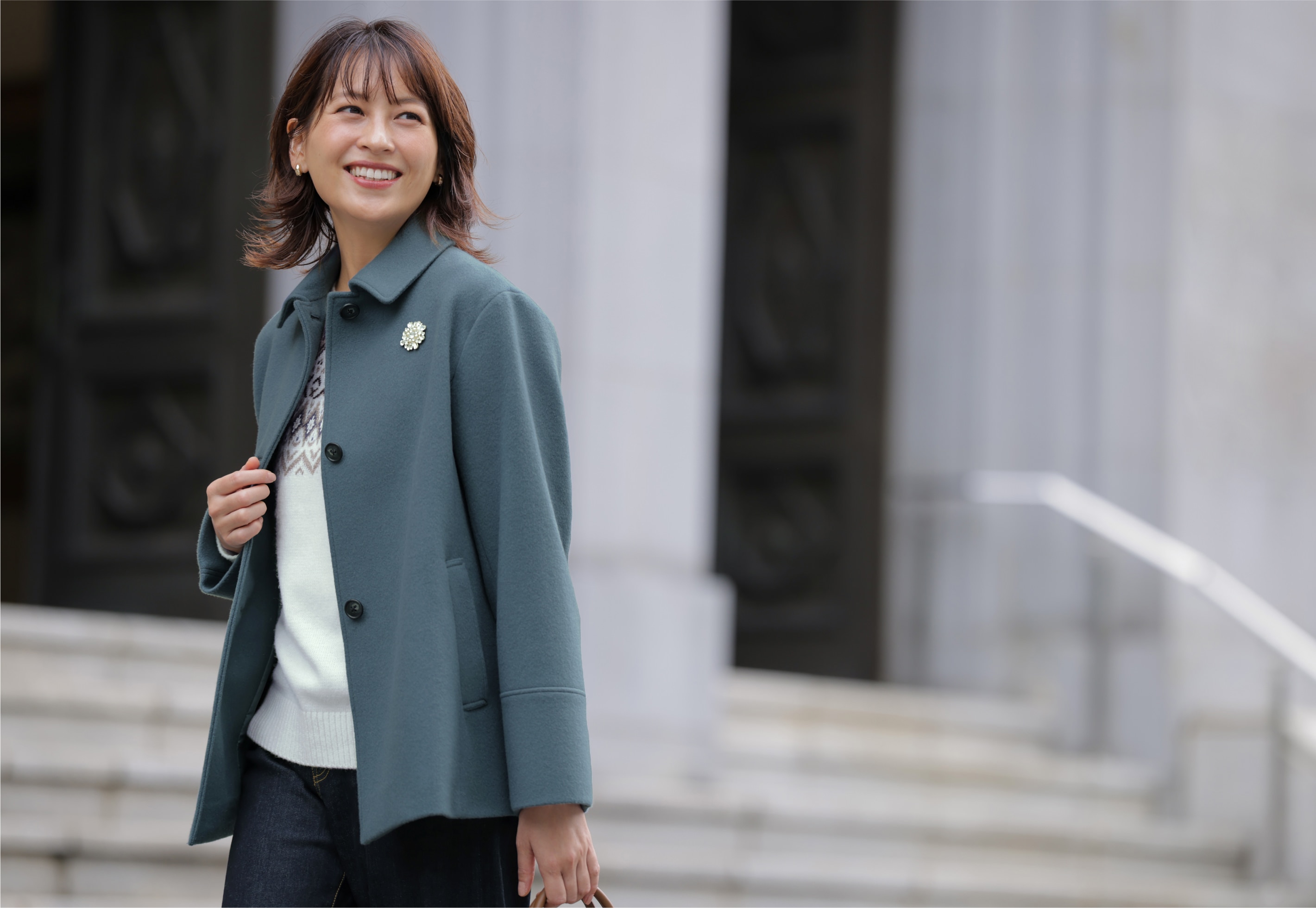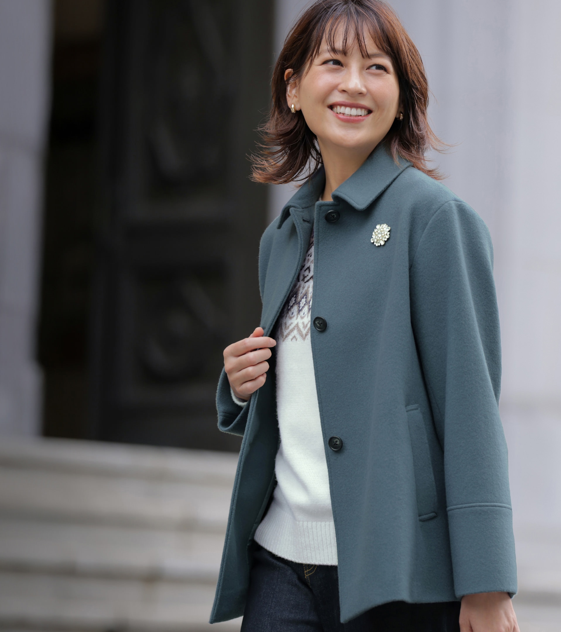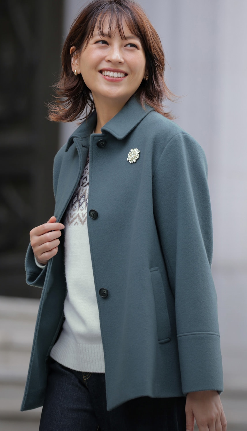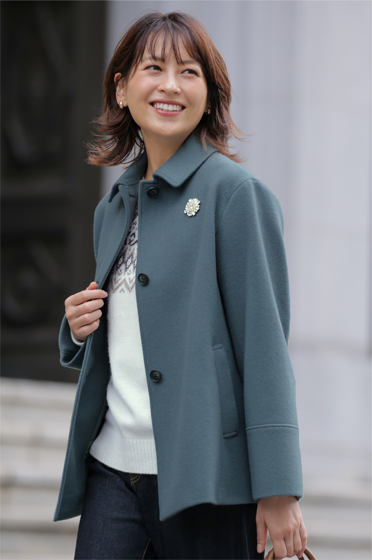 デニムでラフなムードをいれつつも、ティールブルーのステンカラーコートなら、親族との顔合わせも上品なきちんと感を演出できる。