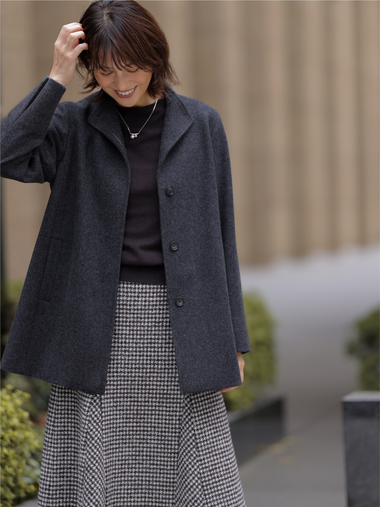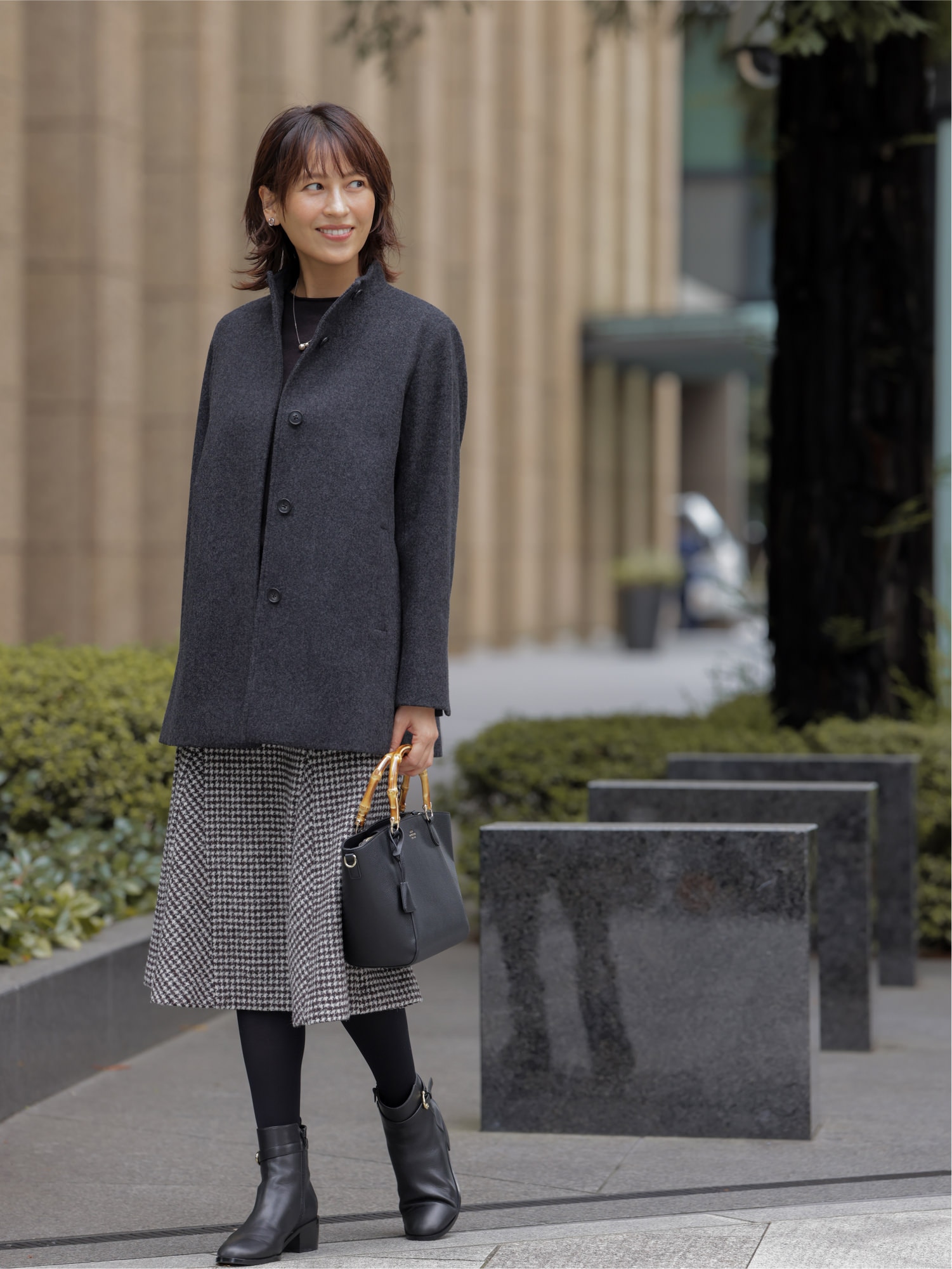 スタンドカラーコートとハウンドトゥース柄のスカートを合わせて、いつもよりシックな印象にまとめる。