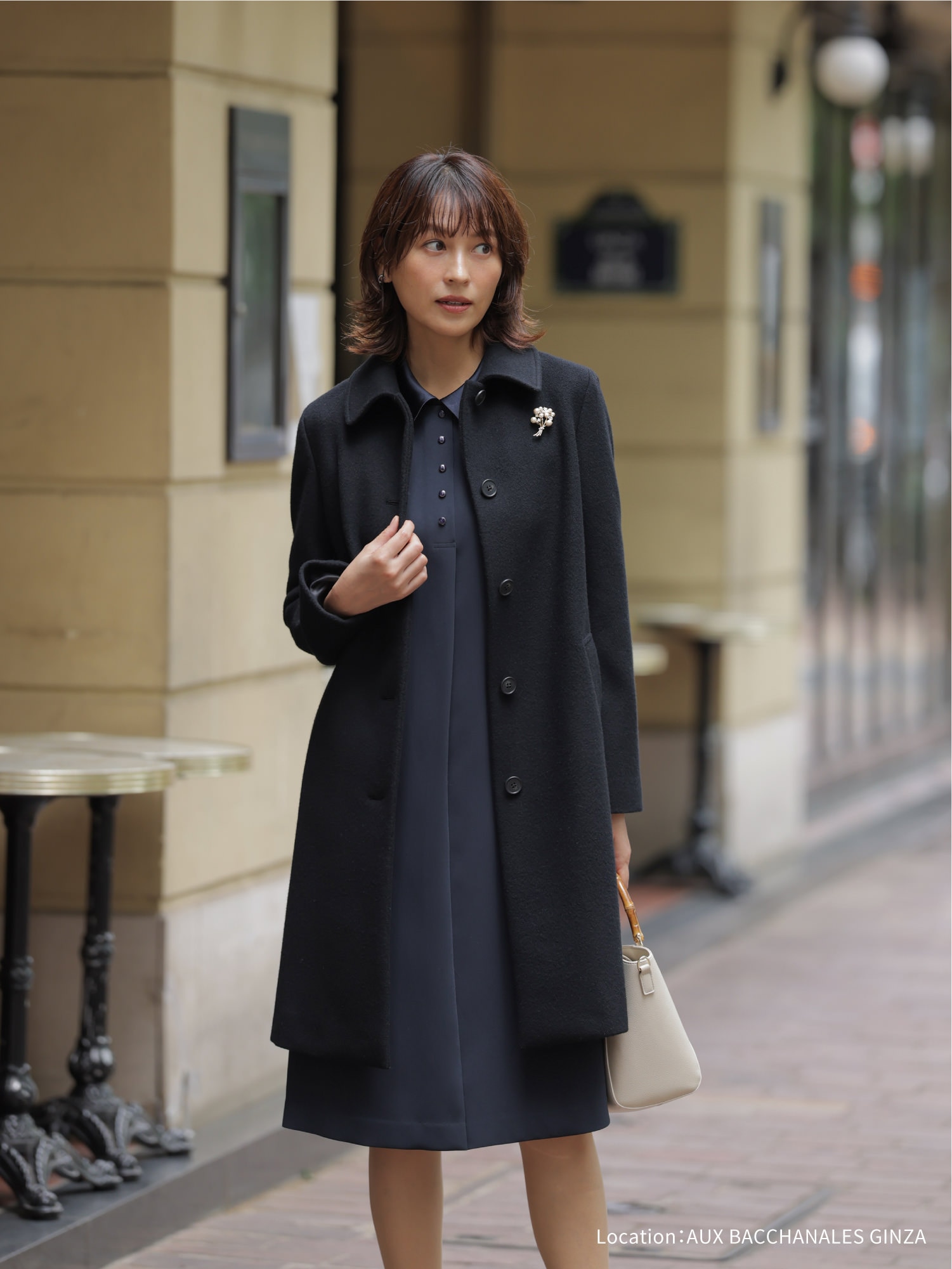 オケージョンにも着回せる襟付きのワンピースに、きちんと感のあるステンカラーコートをオン。